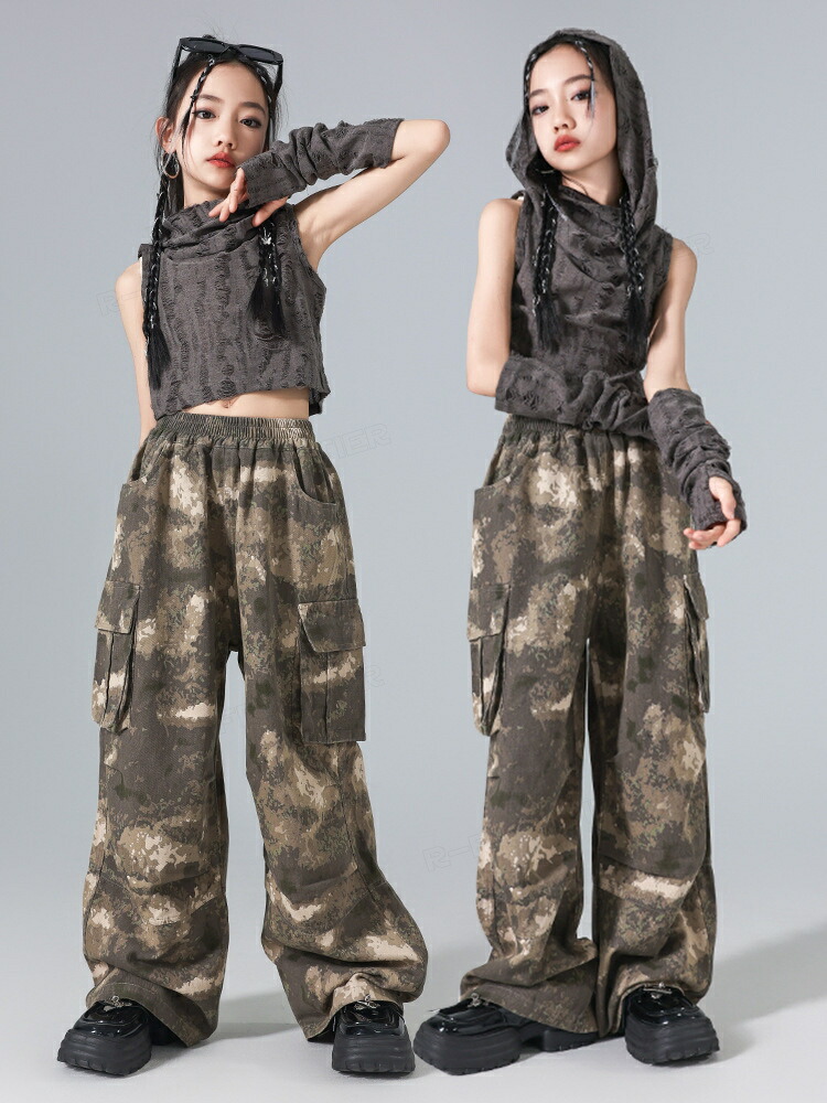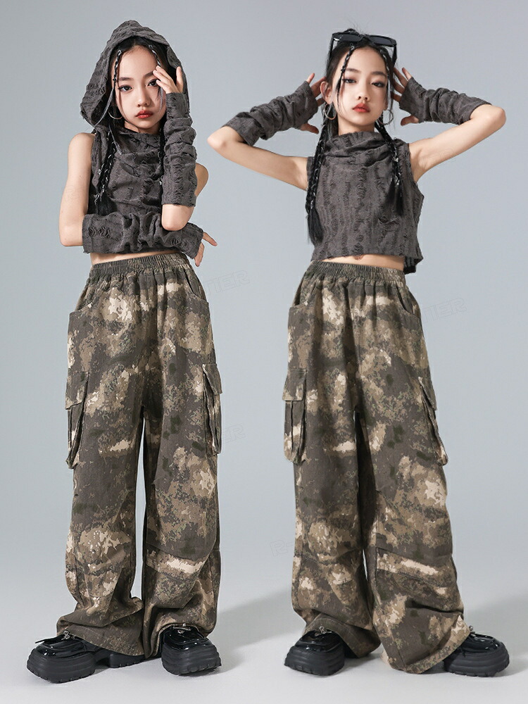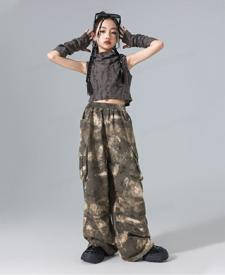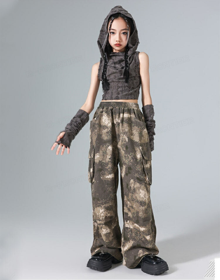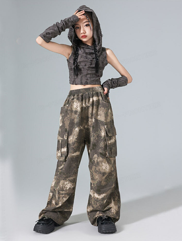 ジャズダンス 衣装 キッズ セットアップ へそ出しトップス フード付き ヒップホップ 迷彩パンツ カーゴパンツ ジャズダンス 女の子 ガールズ 演出服 応援団 ステージ衣装 120-180