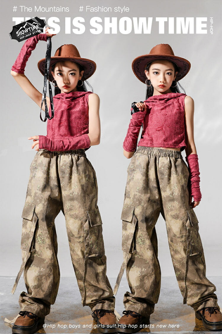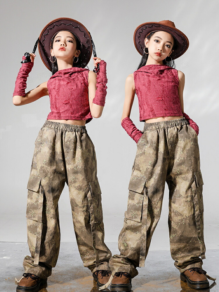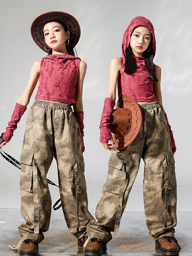 ジャズダンス 衣装 キッズ セットアップ へそ出しトップス フード付き ヒップホップ 迷彩パンツ カーゴパンツ ジャズダンス 女の子 ガールズ 演出服 応援団 ステージ衣装 110-180