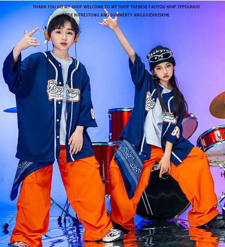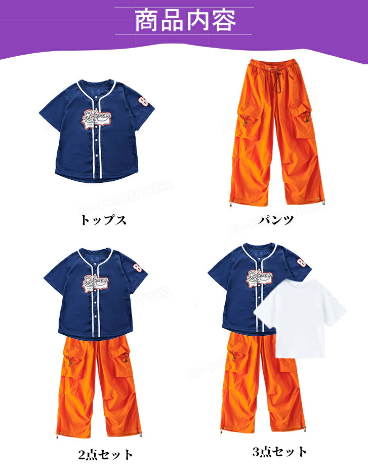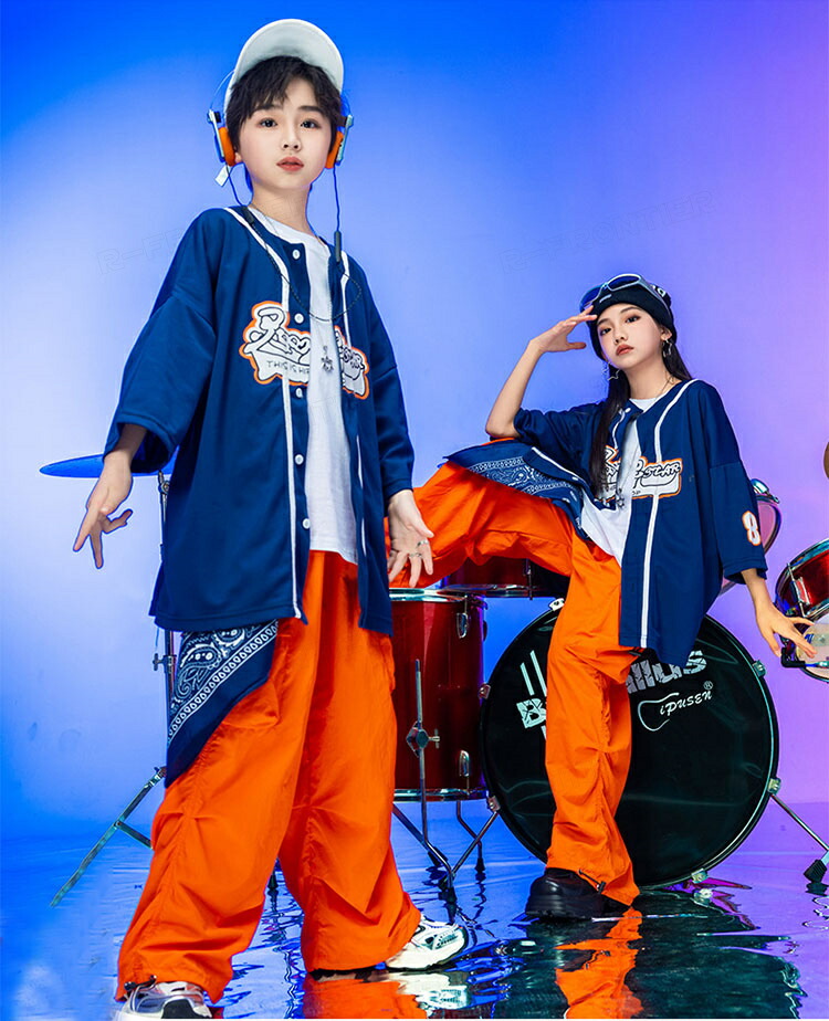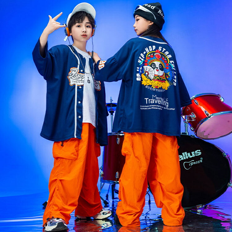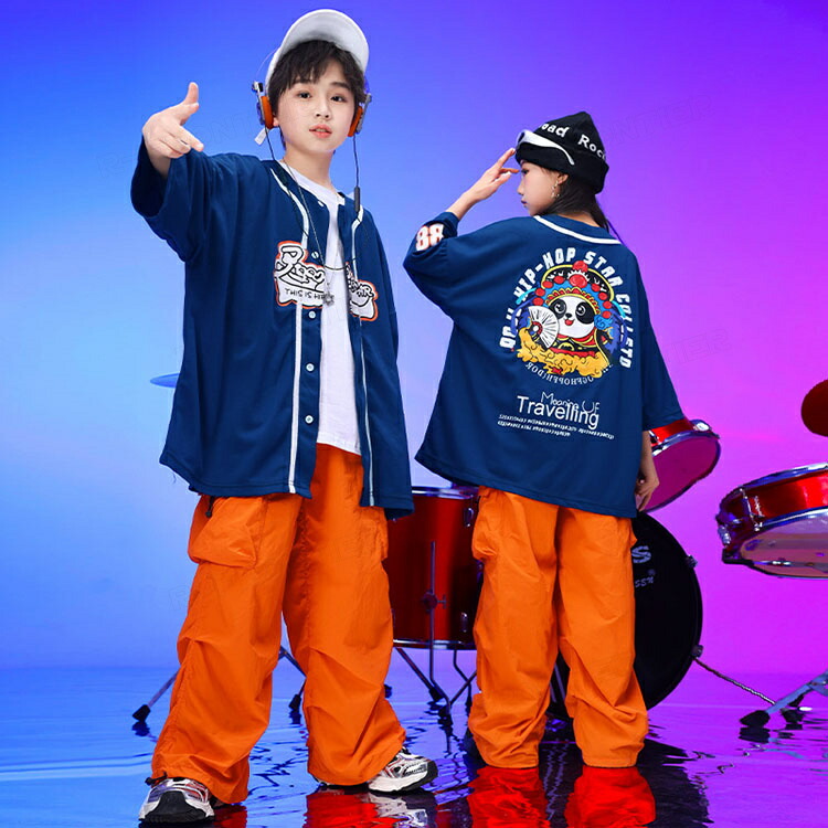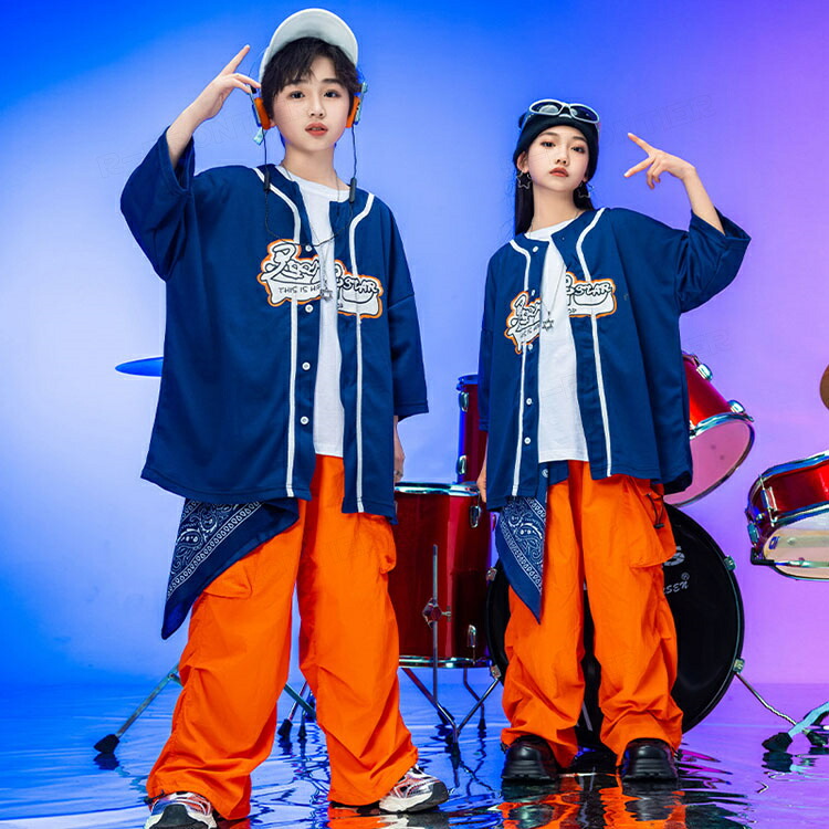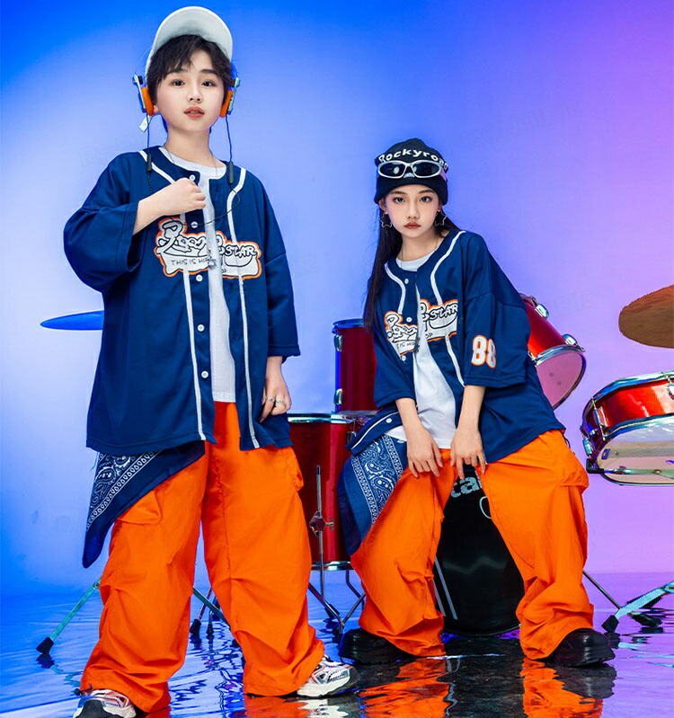ベースボールシャツ ダンス衣装 キッズ ヒップホップ セットアップ 紺色トップス カーゴパンツ 団体 k-pop 衣装 韓国 HIPHOP イベント 110 120 130 140 150 160 1
