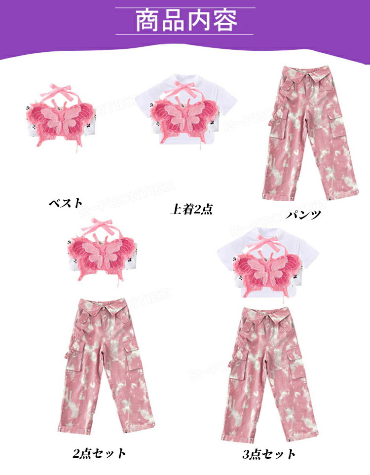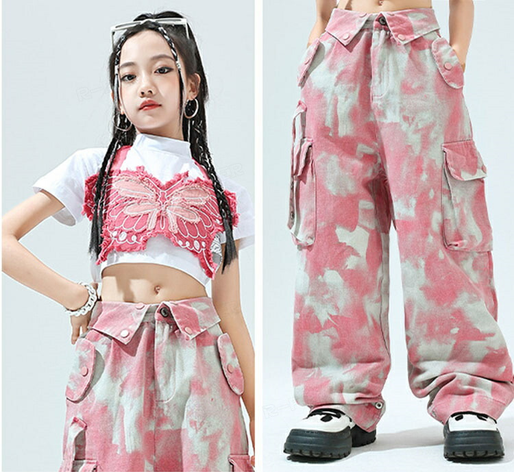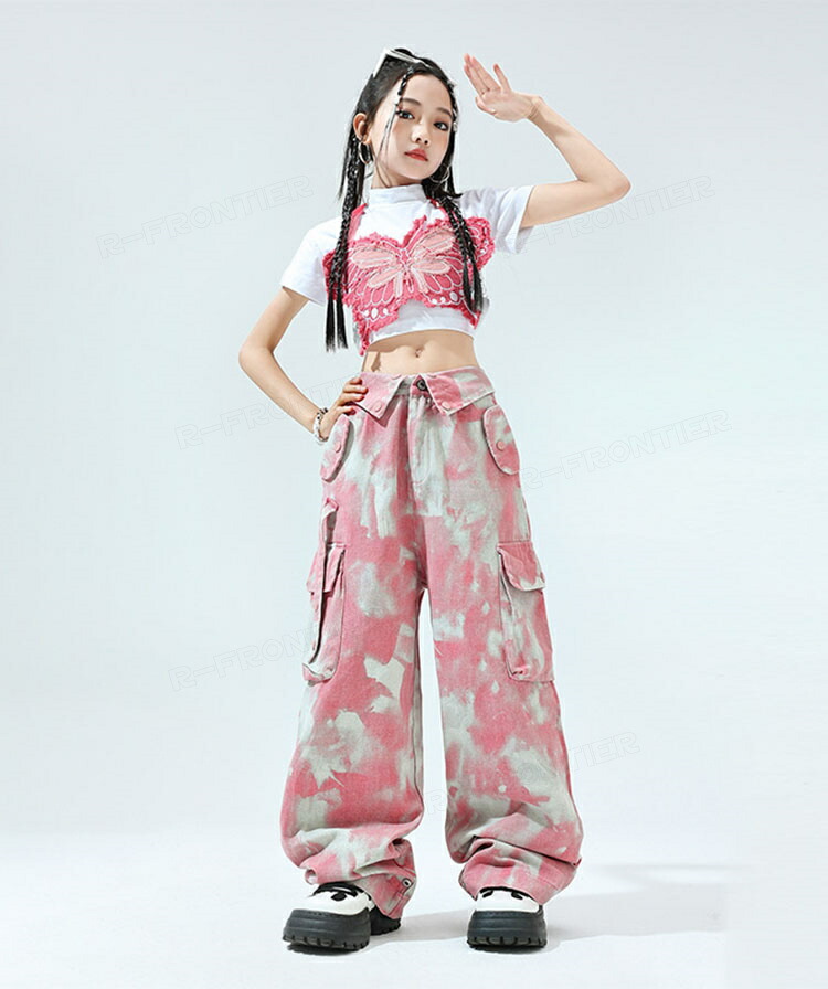 女の子 ダンス衣装 キッズ カーゴパンツ 蝶 トップス 白Tシャツ ゆったり パンツ ヒップホップ 団体 HIPHOP イベント 110 120 130 140 150 160 170 180