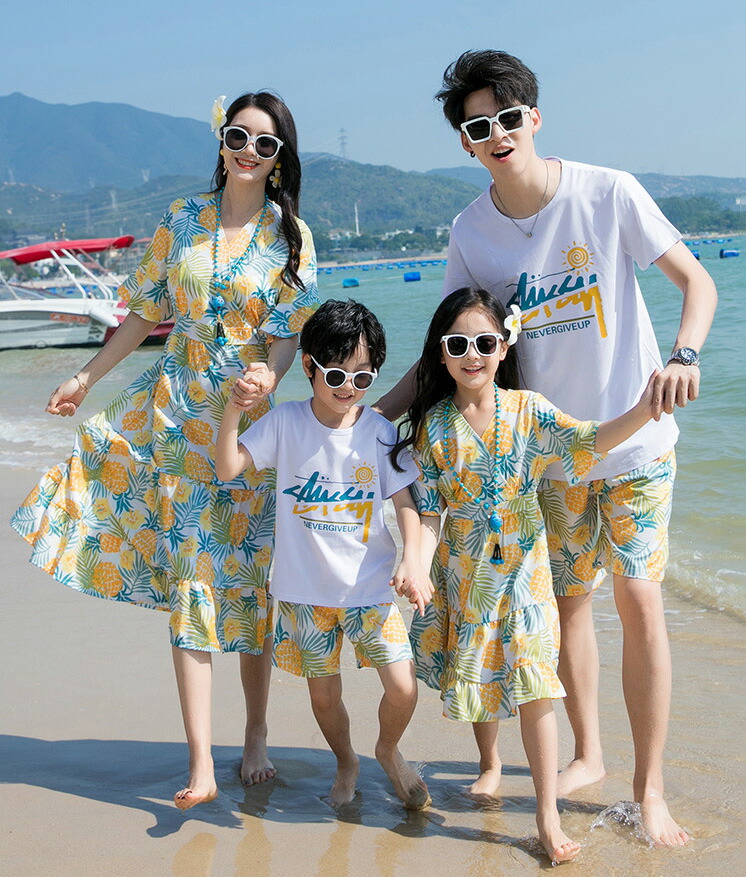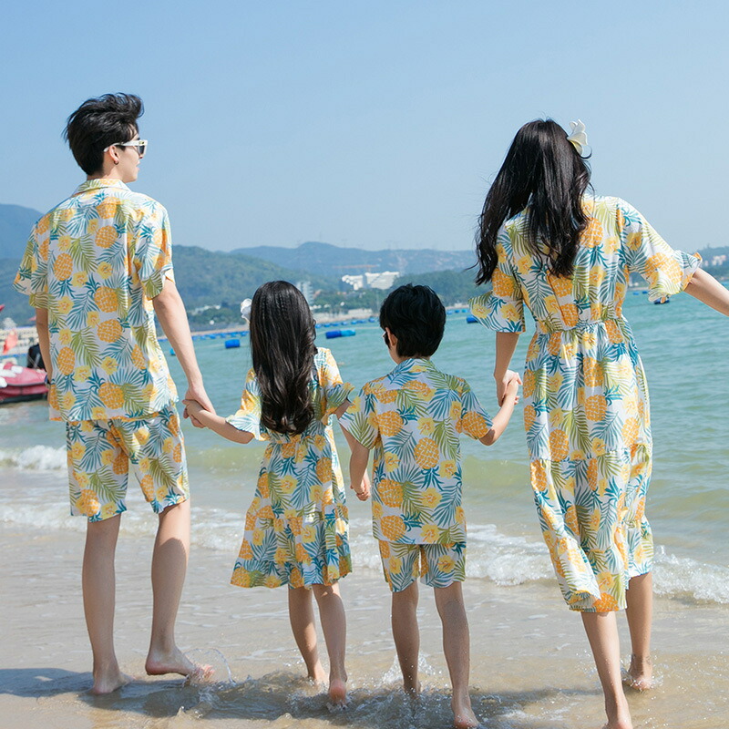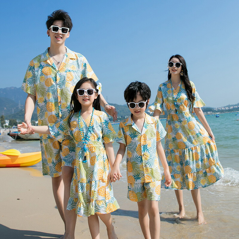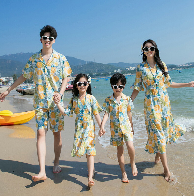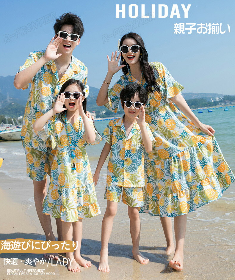 ハワイ風 親子ペア衣装 アロハ ドレス アロハシャツ ペアルック カップル シャツ 半ズボン 親子コーデ 家族お揃い衣装 親子 ペアルック ファミリセット 木の葉パターン ママ パパ 息子 娘