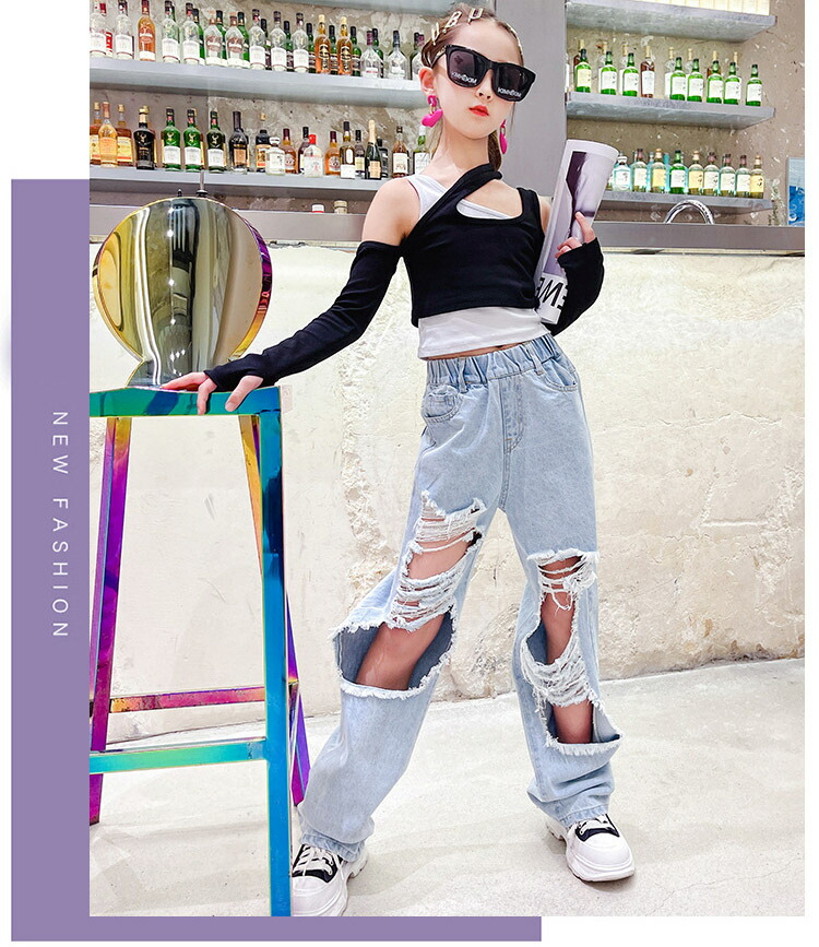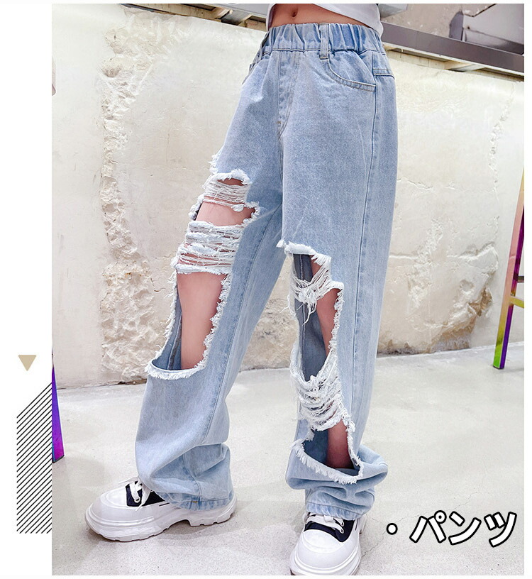 キッズダンス衣装 セットアップ キッズ へそ出し 黒 トップス デニムパンツ ダメージパンツ ジーンズ k-pop衣装 ヒップホップ 肩出し ジャズダンス ヒップホップ 120 130 140 150