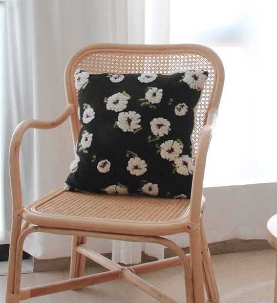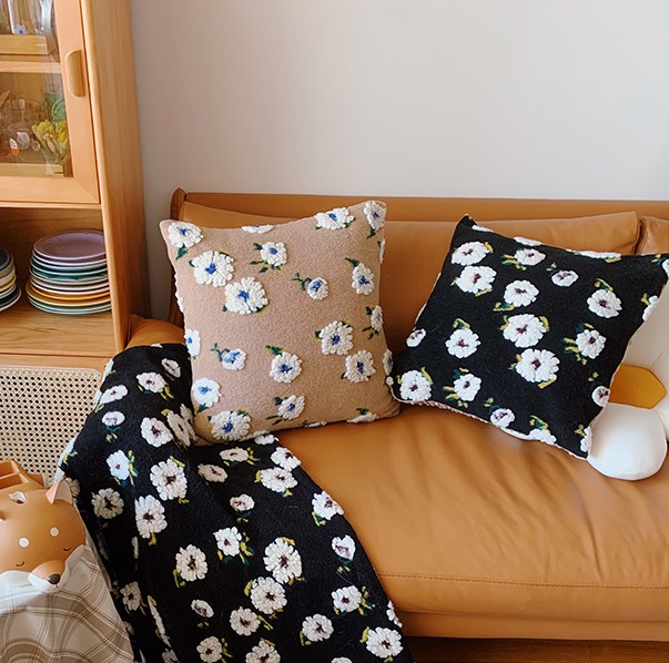 花柄クッション2色クッションカバーカバーベージュ黒ブラックブラウンフラワーもこもこ大きい大きめ45cm×45cm北欧おしゃれ可愛いデザイン洗える四角正方形韓国雑貨インテリア北欧ふわふわレトロ総柄