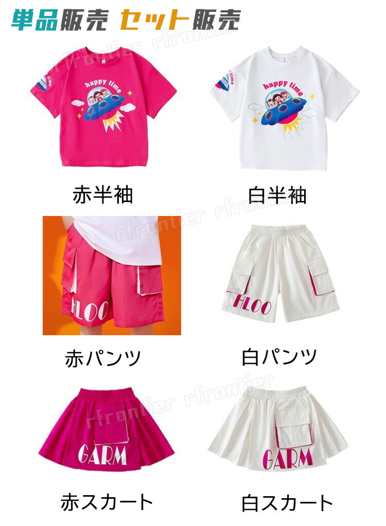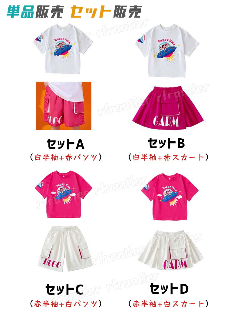 horizontal-key: 赤半袖 白半袖 赤パンツ 白パンツ 赤スカート 白スカート セットA:白半袖+赤パンツ セットB:白半袖+赤スカート セットC:赤半袖+白パンツ セットD:赤半袖+白スカート