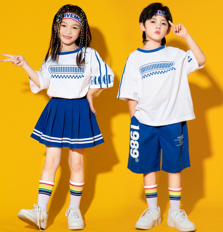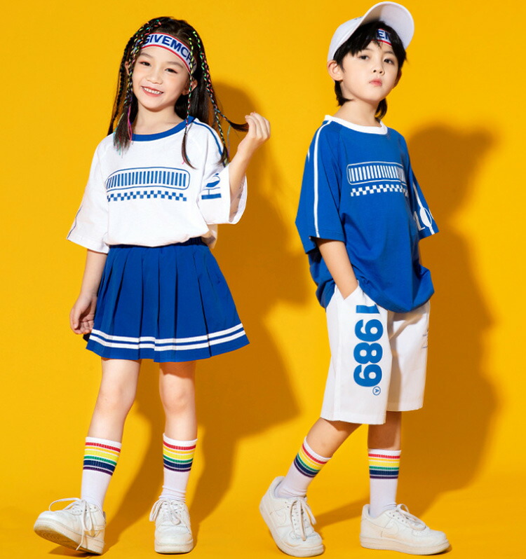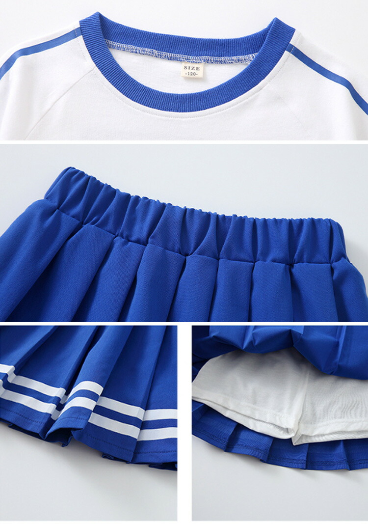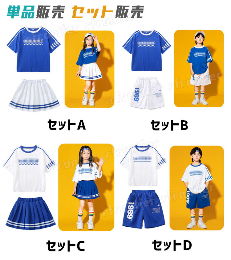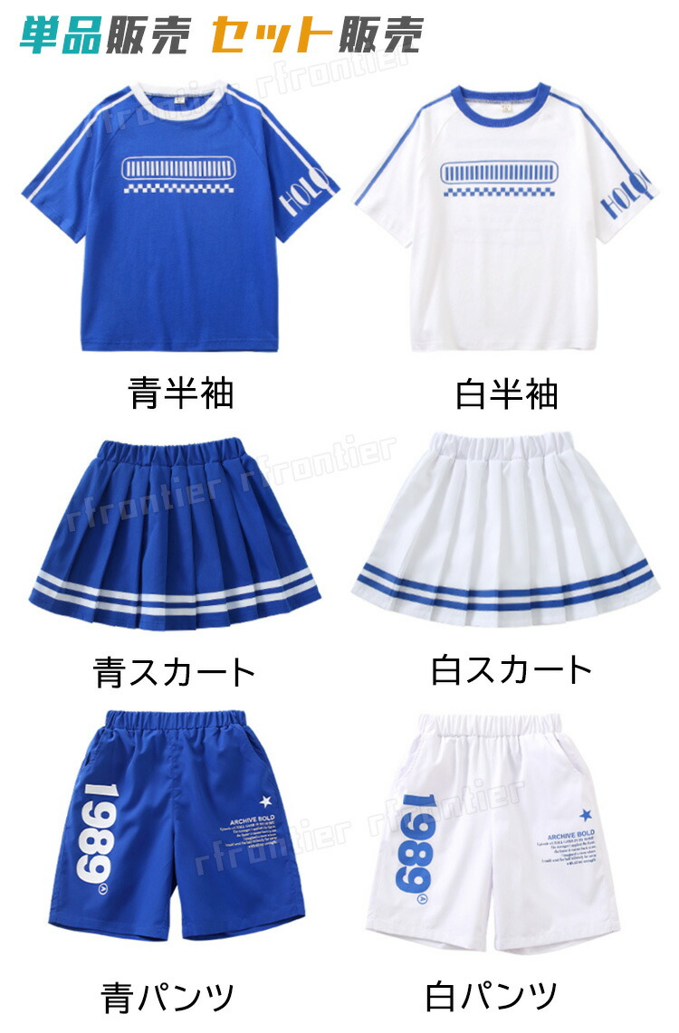 horizontal-key: 青半袖 白半袖 青スカート 白スカート 青パンツ 白パンツ セットA:青半袖+白スカート セットB:青半袖+白パンツ セットC:白半袖+青スカート セットD:白半袖+青パンツ