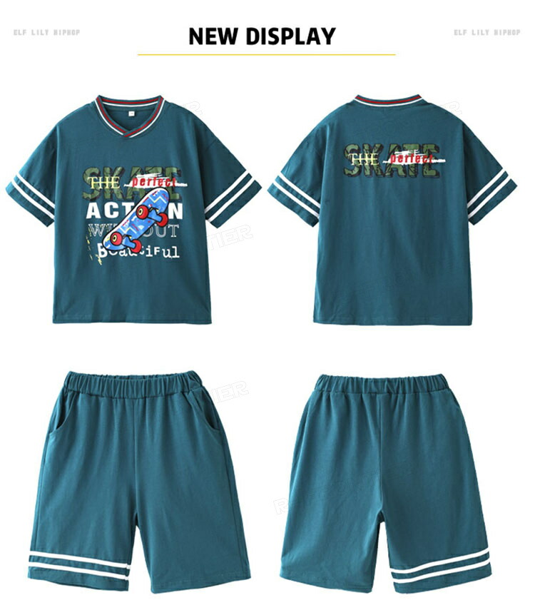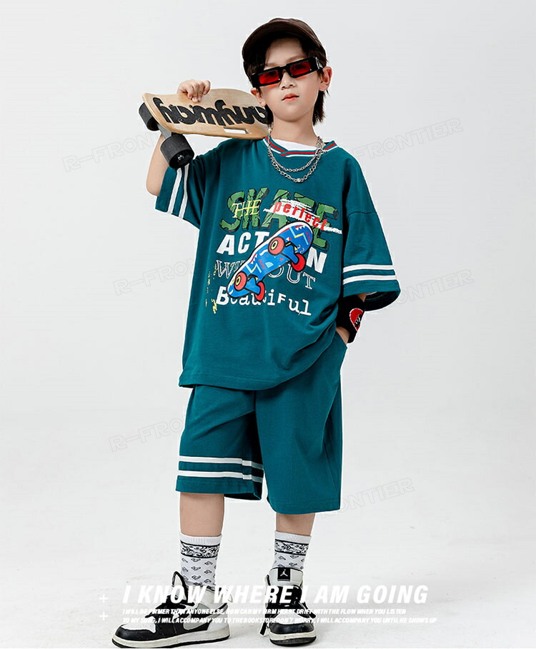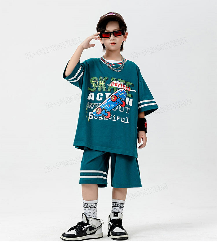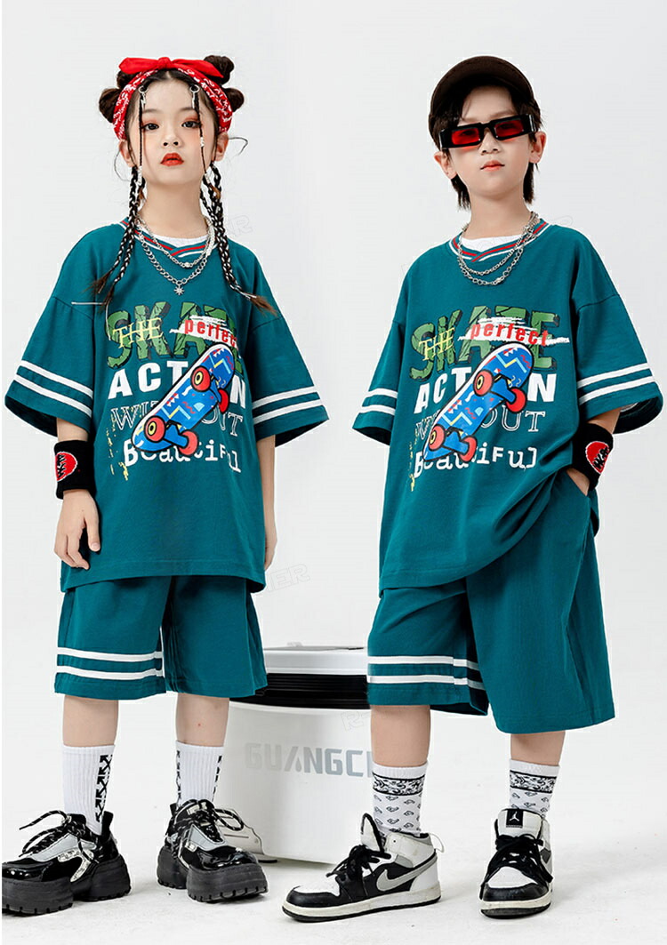 ダンス 衣装 キッズ セットアップ 緑 ベースボールシャツ ハーフパンツ 韓国 ヒップホップ ジャズダンス ユニセックス 演出服 応援団 ステージ衣装 110-180