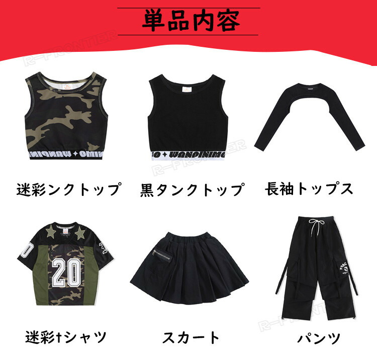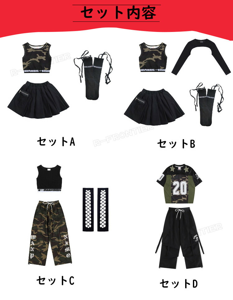 horizontal-key: 迷彩タンクトップのみ 黒タンクトップのみ 長袖トップスのみ 迷彩tシャツのみ スカートのみ 黒パンツのみ 迷彩パンツのみ セットA セットB セットC セットD