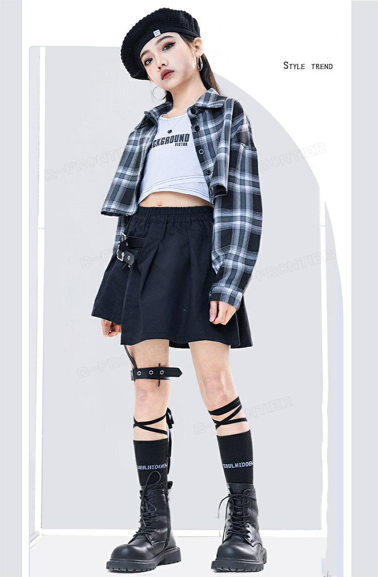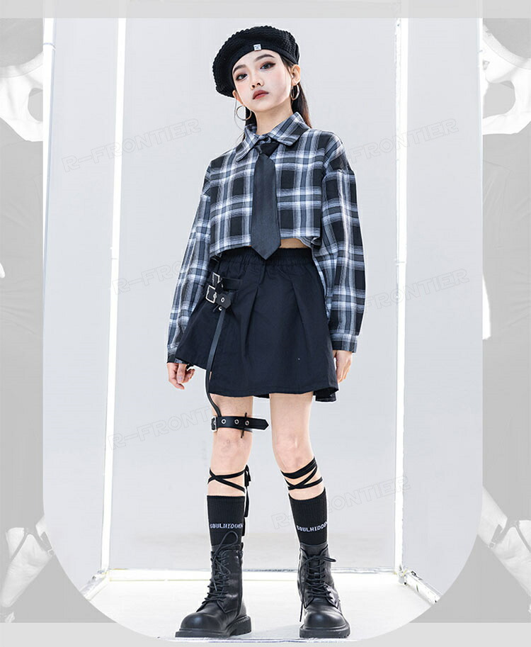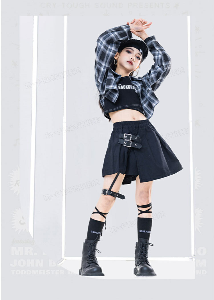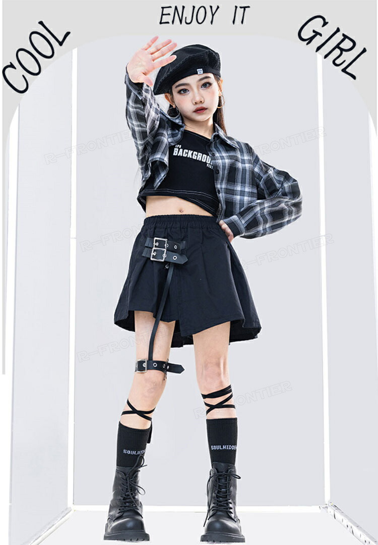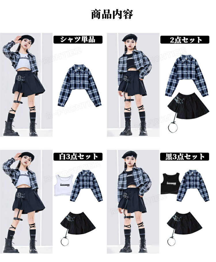 ジャズダンス 衣装 キッズ セットアップ 白 黒 チェック柄 シャツ へそ出しトップス スカート ヒップホップ ジャズダンス 女の子 ガールズ 演出服 応援団 ステージ衣装 110-180