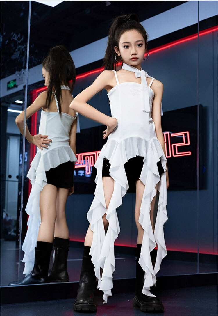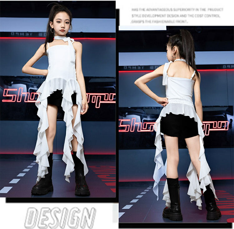 ジャズダンス 衣装 キッズ セットアップ 白 黒 ワンピース ショートパンツ 上下セット ヒップホップ ジャズダンス 女の子 ガールズ 演出服 応援団 ステージ衣装 110-180