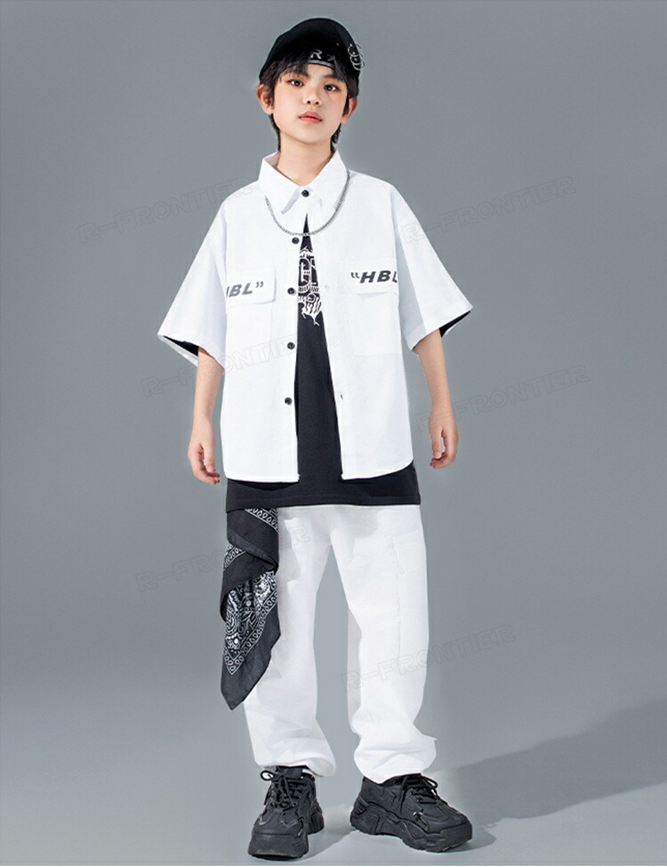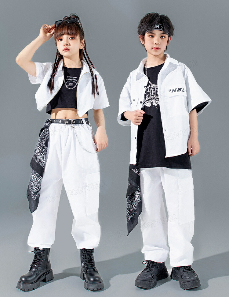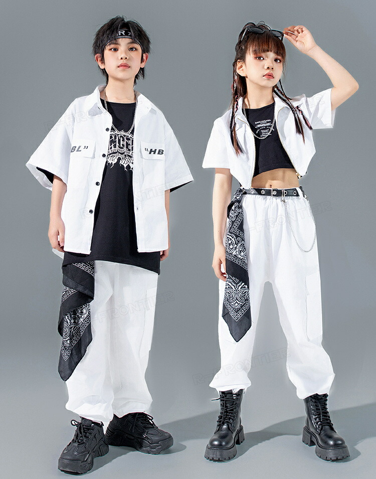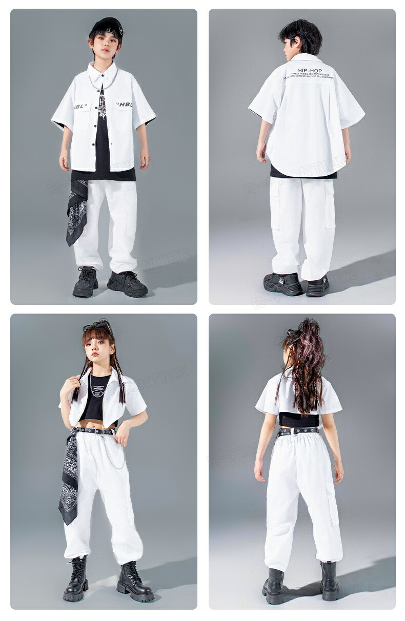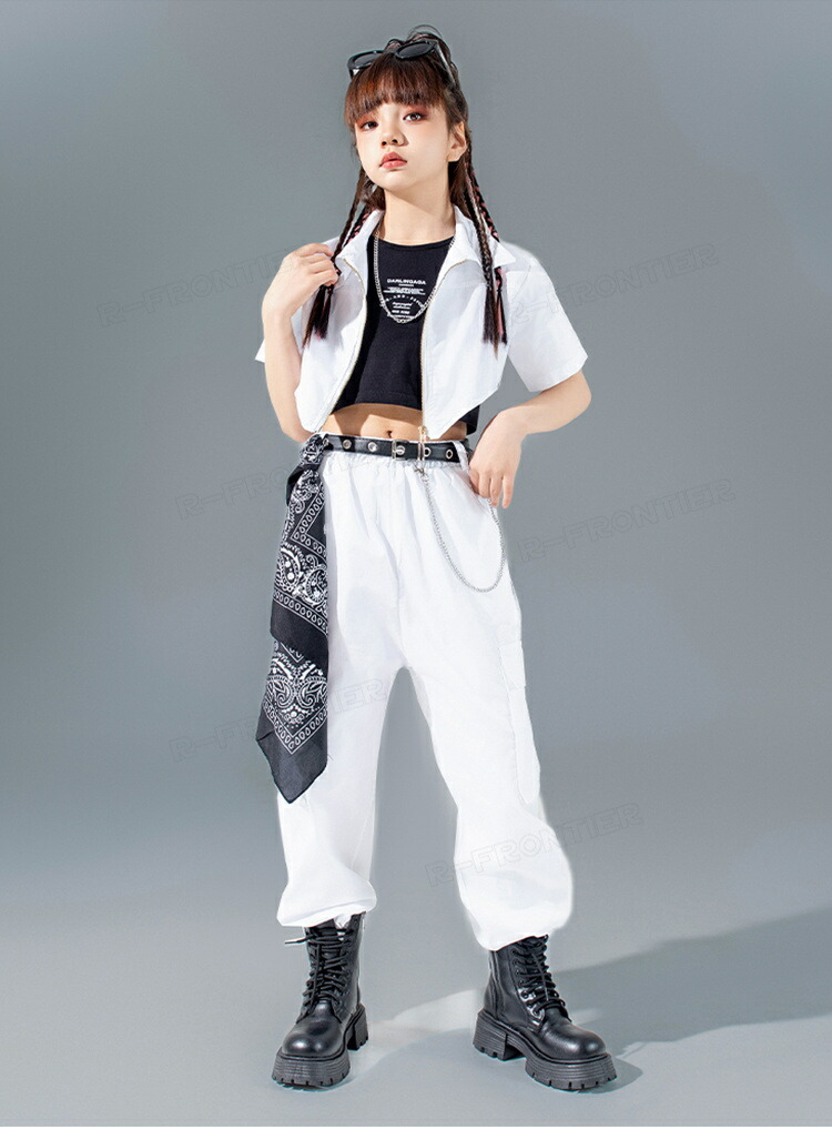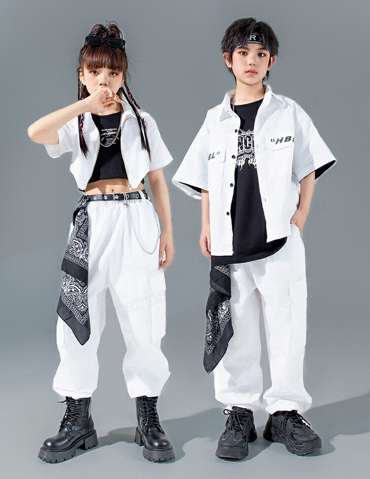 ダンス衣装 キッズ セットアップ 白 カーゴパンツ 半袖 トップス ヒップホップ ジャズダンス 女の子 ガールズ カッコイイ 演出服 応援団 ステージ衣装 110-180