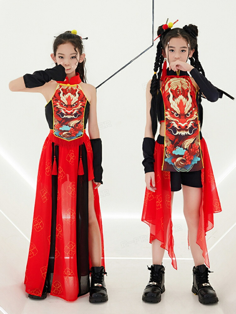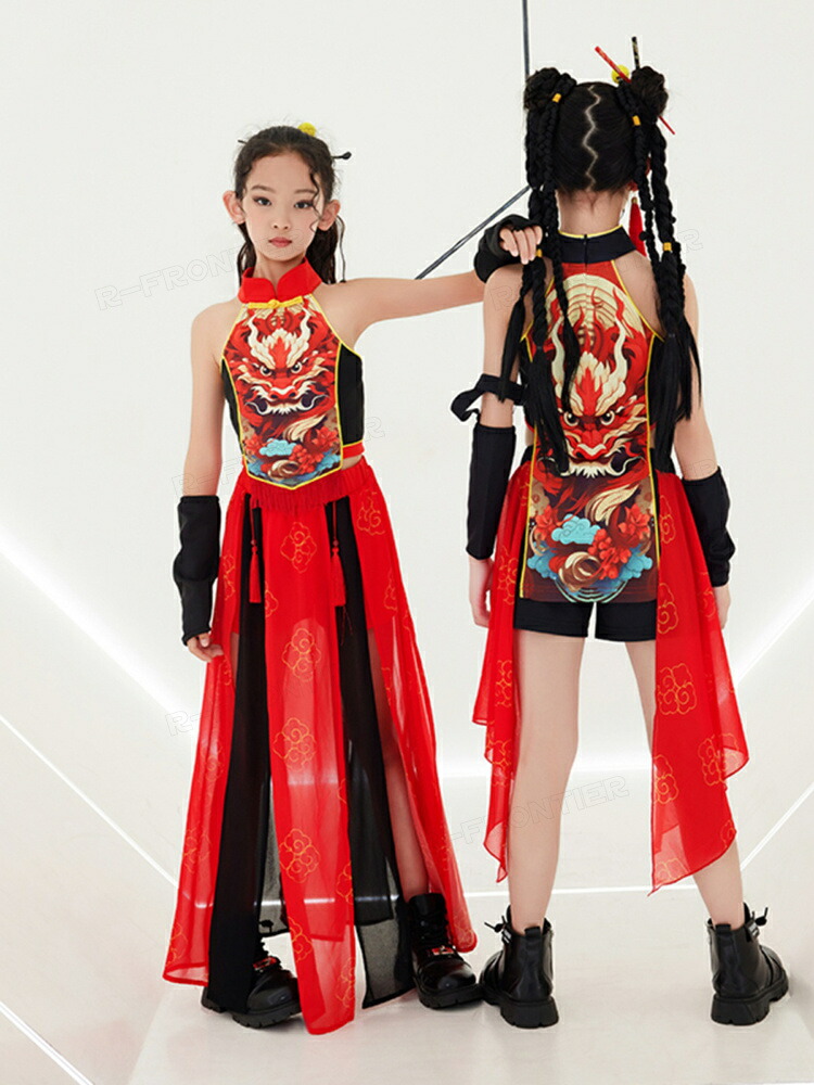 ダンス衣装 キッズ セットアップ 中華風 キリン柄 和風 ヒップホップ ジャズダンス 女の子 ガールズ カッコイイ 演出服 応援団 ステージ衣装 120-170