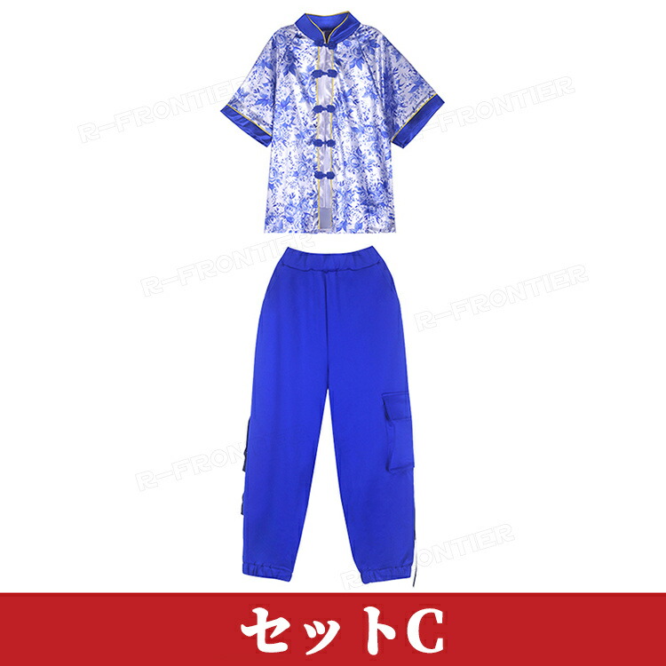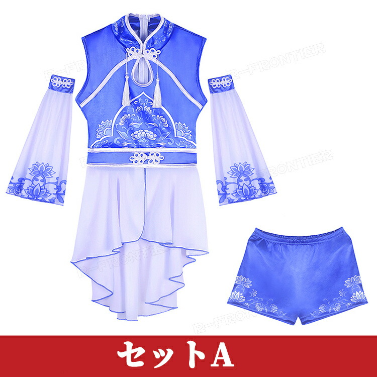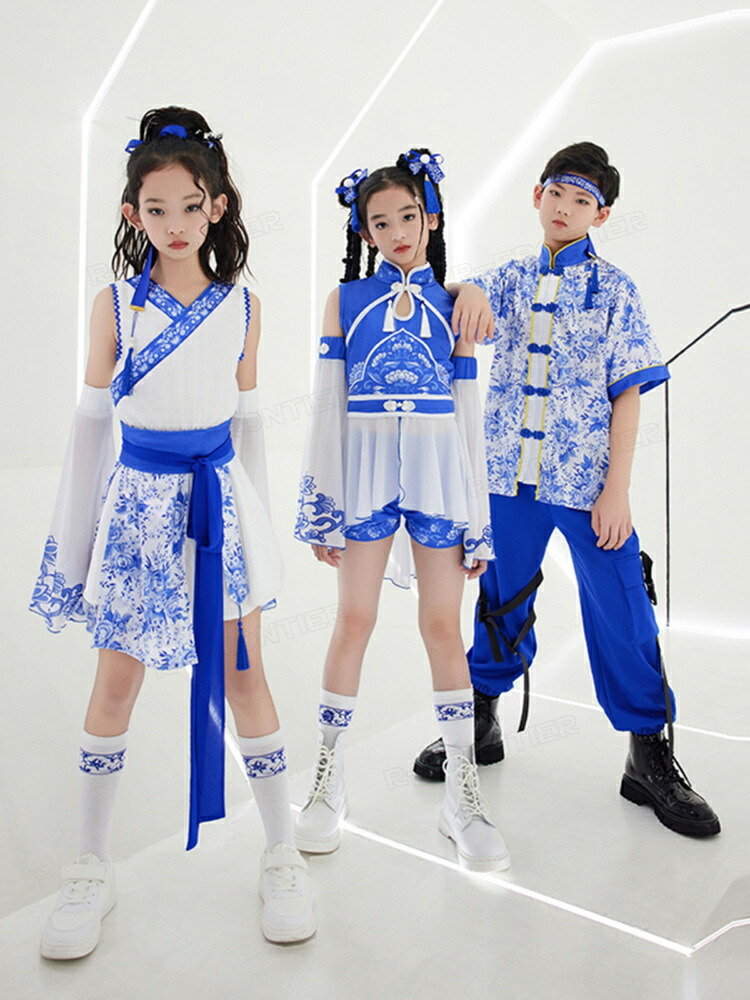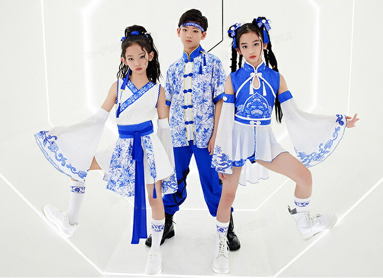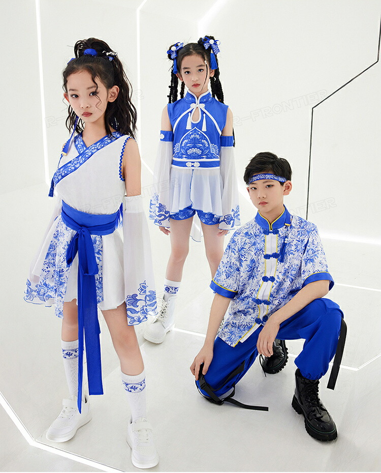 ダンス衣装 キッズ セットアップ 中華風 染付 ブルー ヒップホップ ジャズダンス 女の子 ガールズ カッコイイ 演出服 応援団 ステージ衣装 120-170