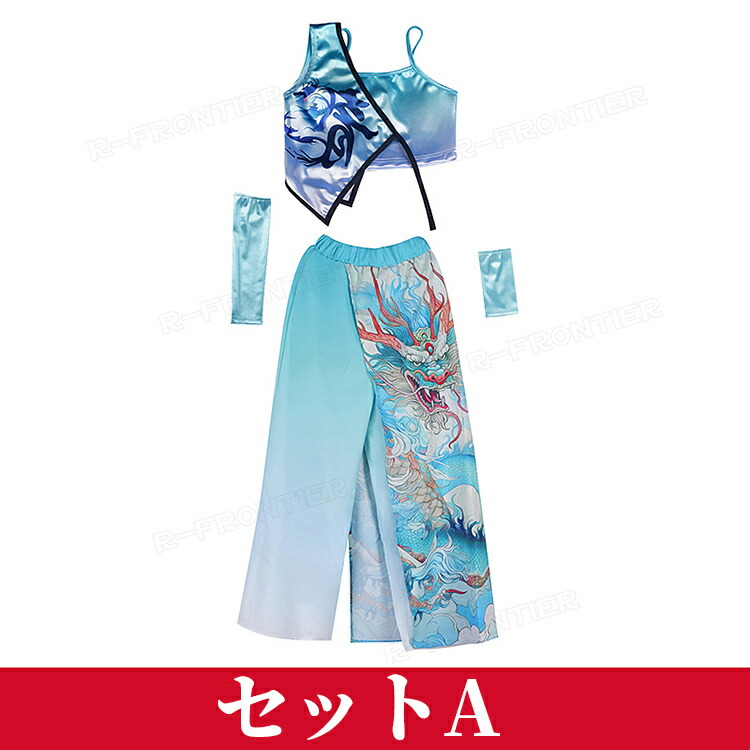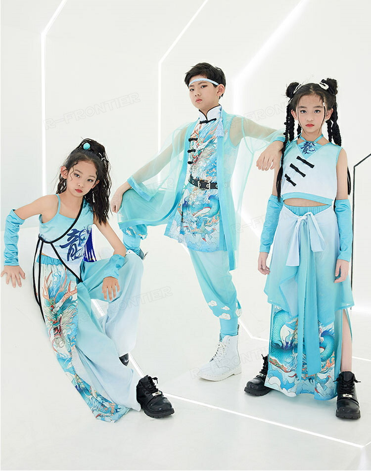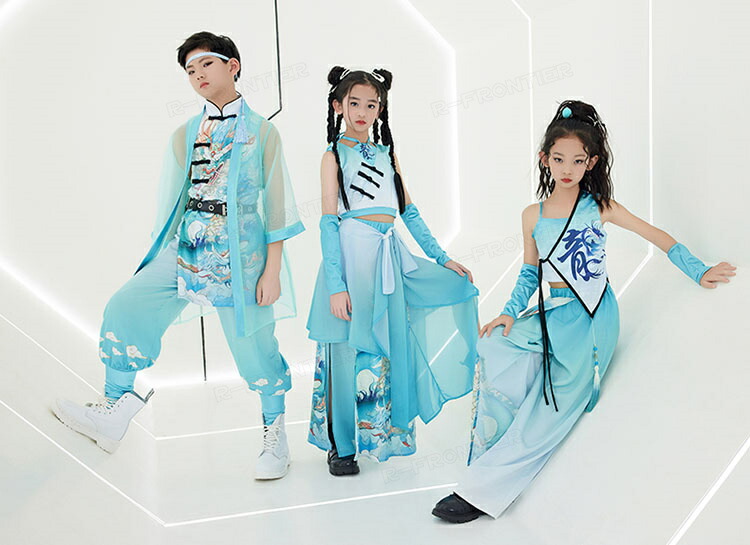 ダンス衣装 キッズ セットアップ 中華風 ブルー ヒップホップ ジャズダンス 女の子 ガールズ カッコイイ 演出服 応援団 ステージ衣装 120-170