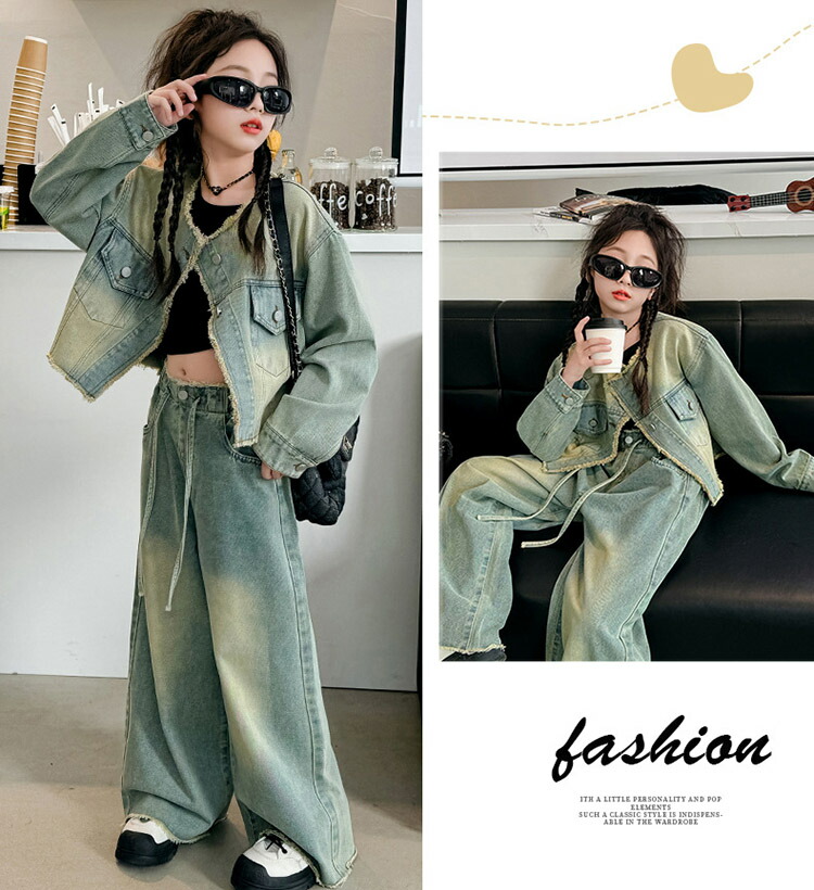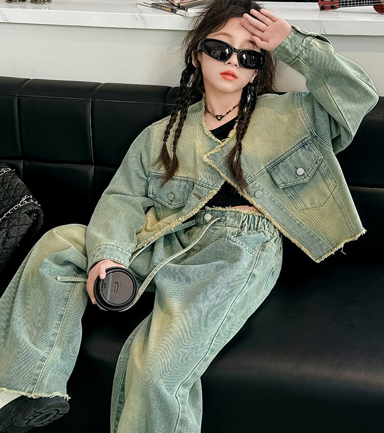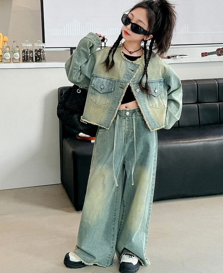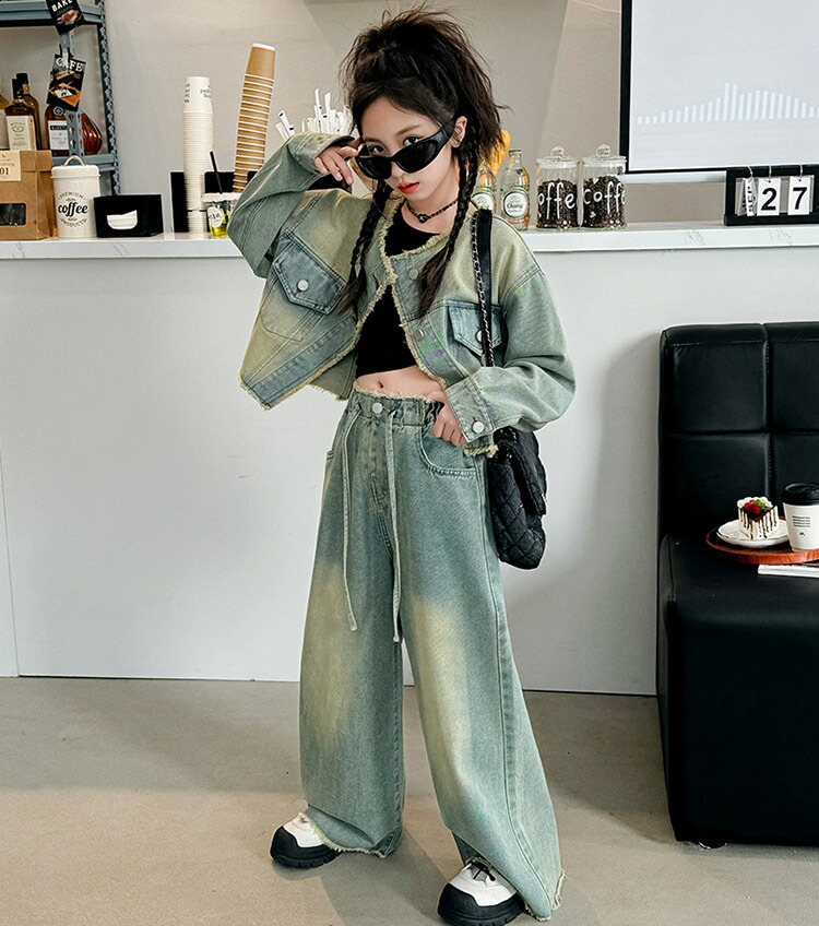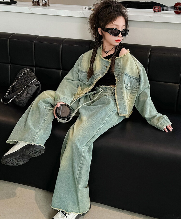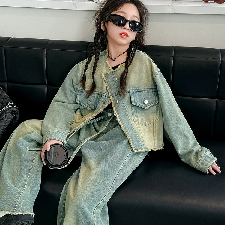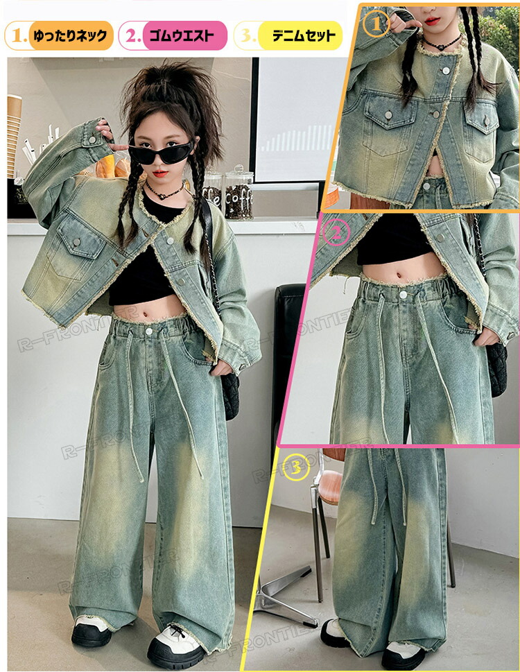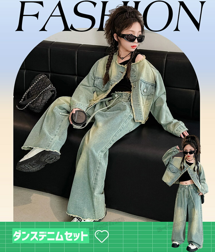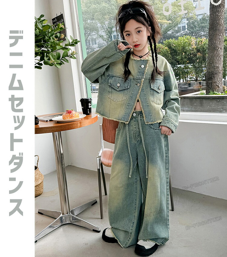 キッズ ダンス衣装 へそ出し トップス セットアップ ヒップホップ ジャズダンス ダンススーツ ジャケット デニムパンツ ワイドパンツ 絞り染め HIPHOP 160 170 120 130 140