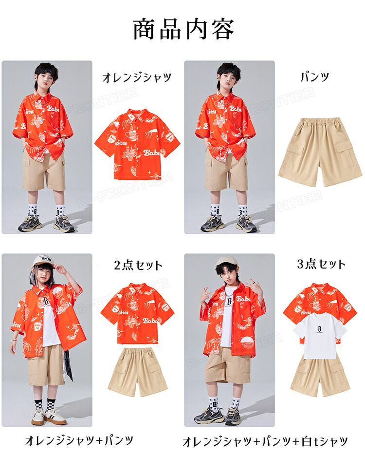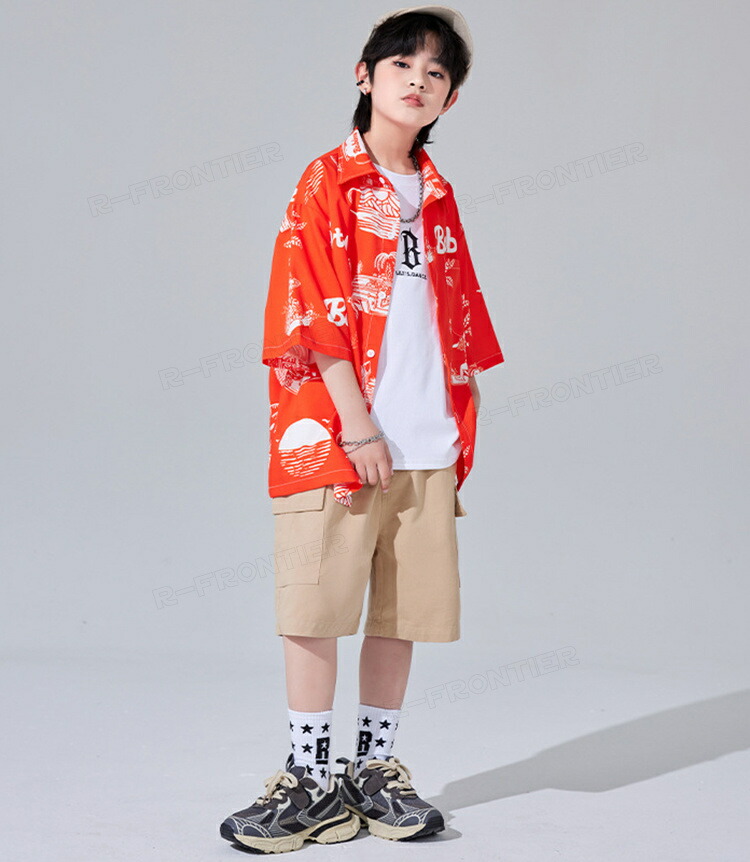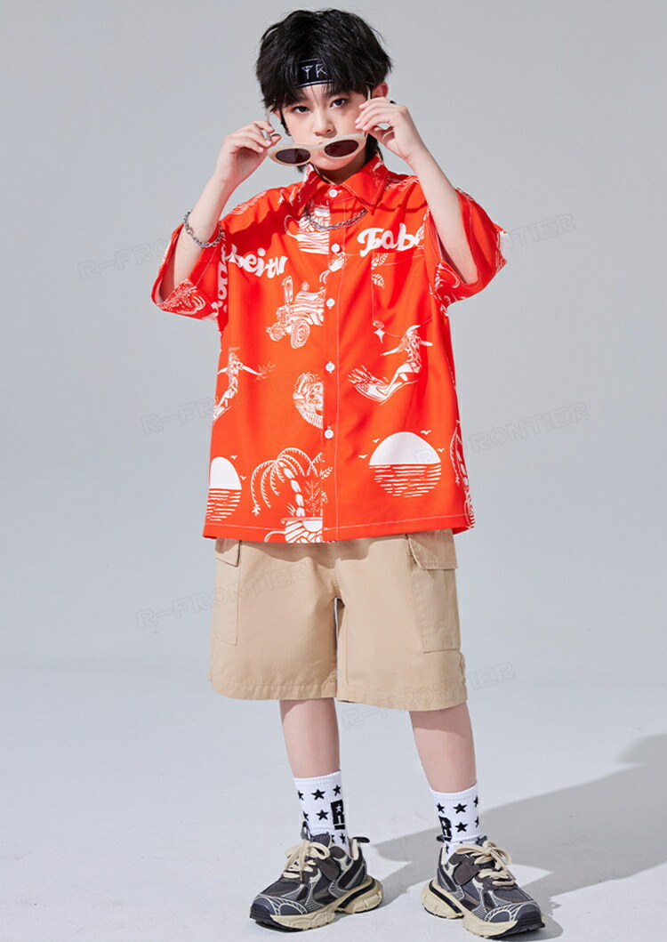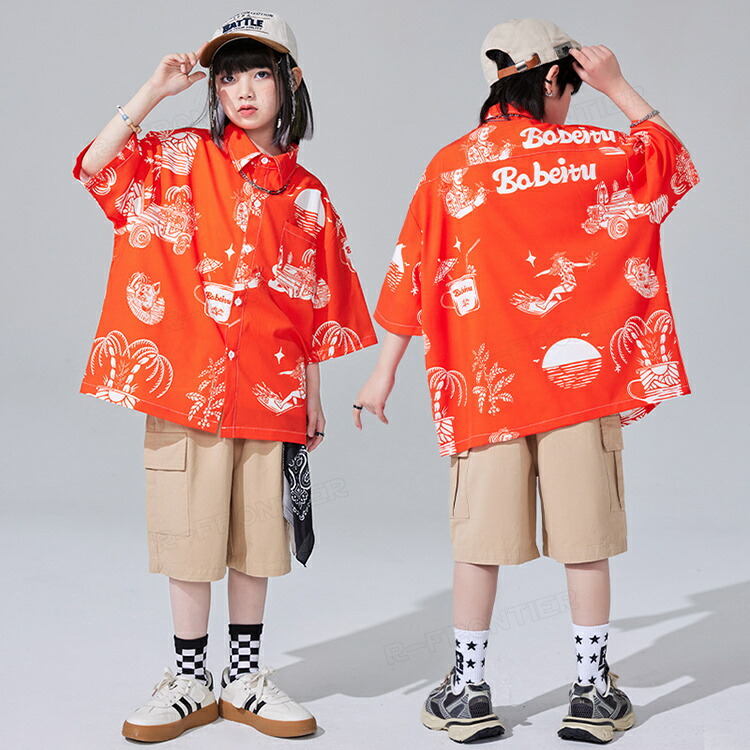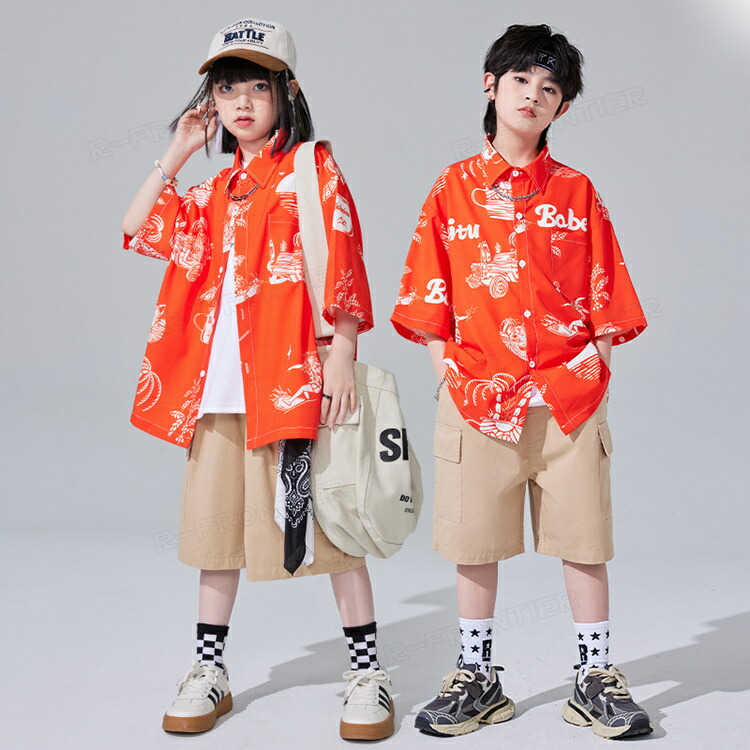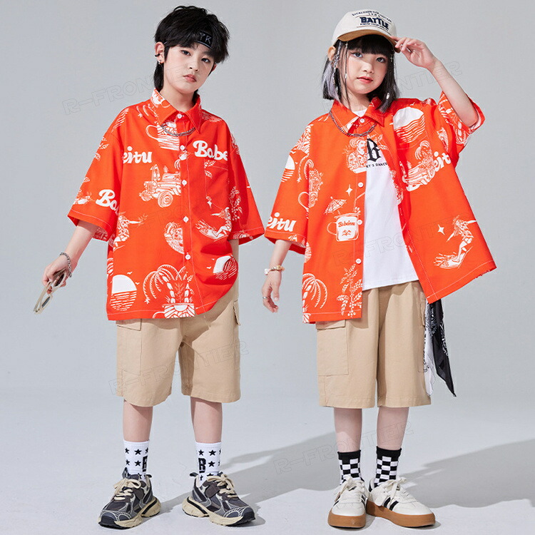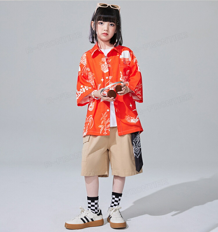 ダンス衣装 キッズ ユニセックス オレンジ 柄シャツ カーゴパンツ トップス HIPHOP ユニセックス ステージ衣装 子供 練習着 韓国 発表会 人気 おしゃれ 韓国 かっこいい 派手 110-18