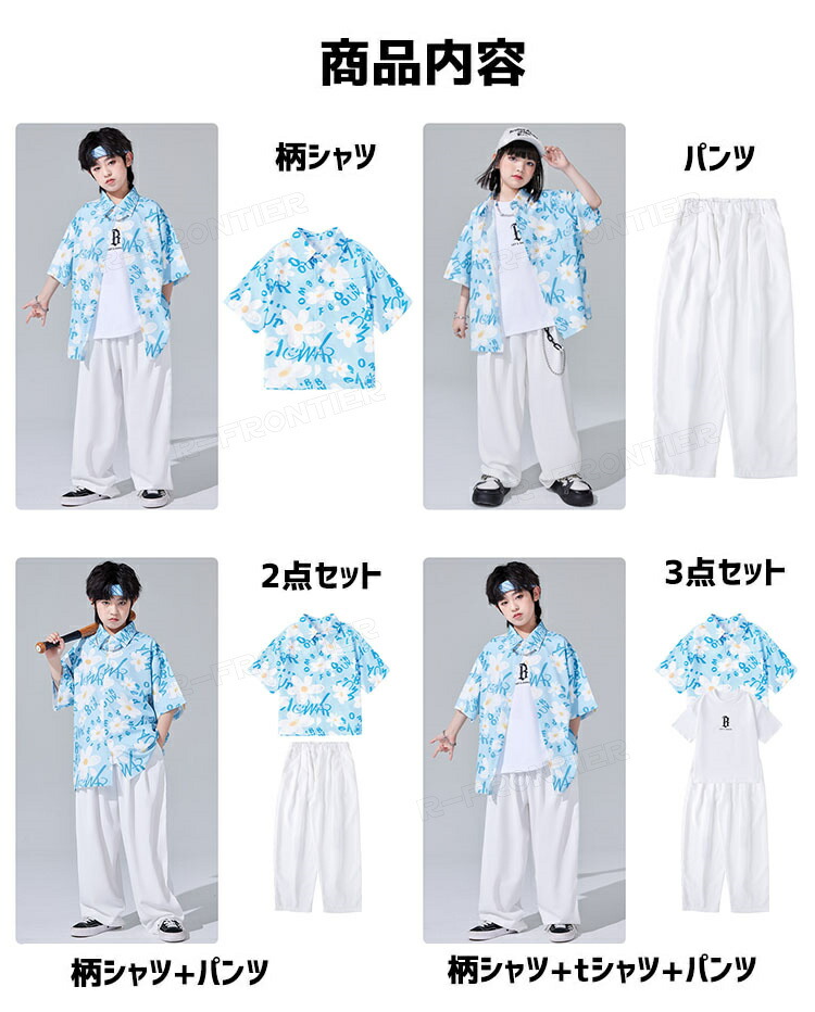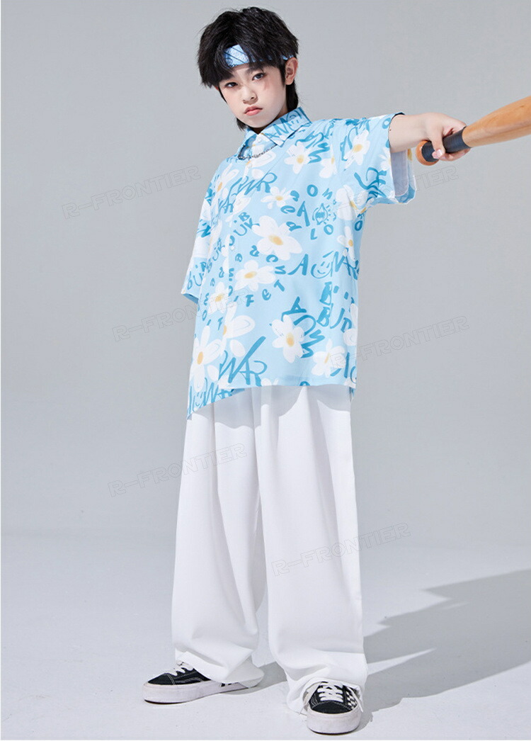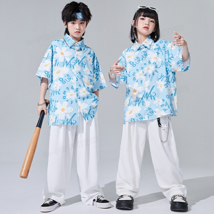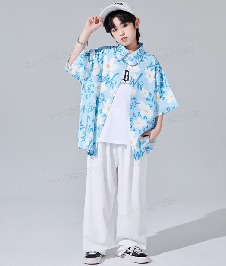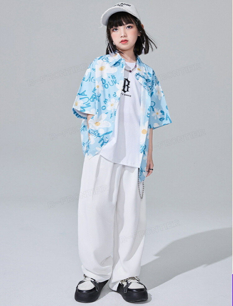 ダンス衣装 キッズ セットアップ 柄シャツ 白パンツ ダンストップス HIPHOP ユニセックス ステージ衣装 子供 練習着 韓国 発表会 人気 おしゃれ 韓国 かっこいい 派手 110-180cm