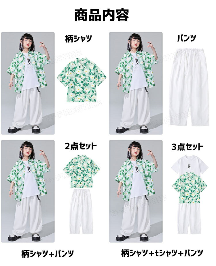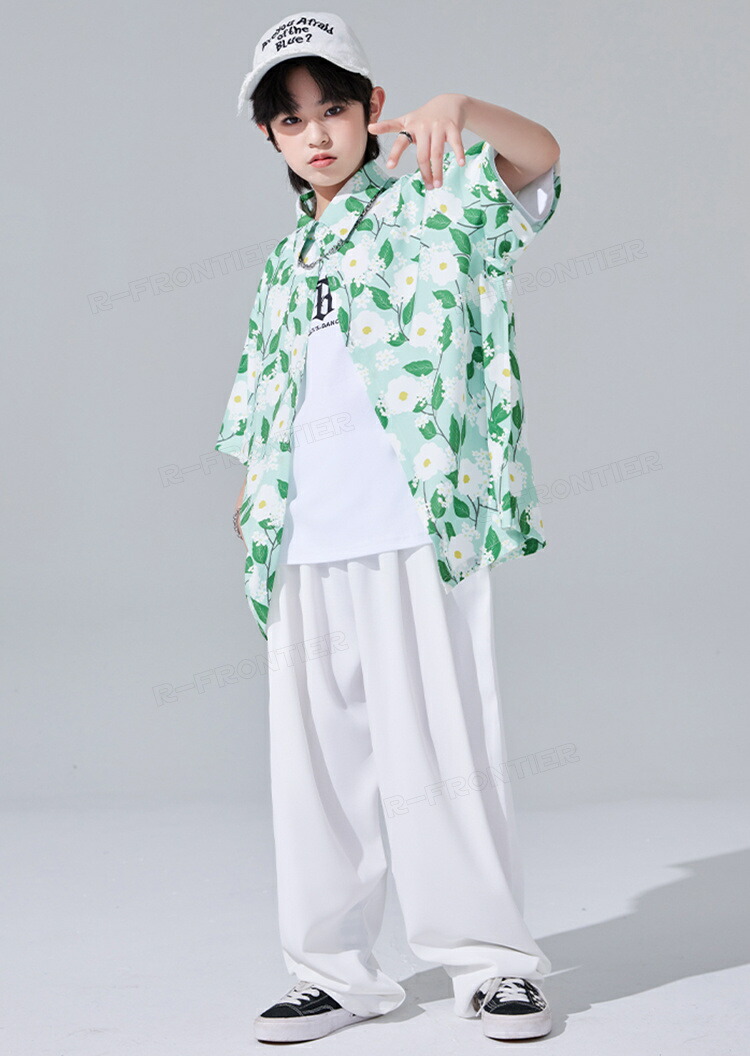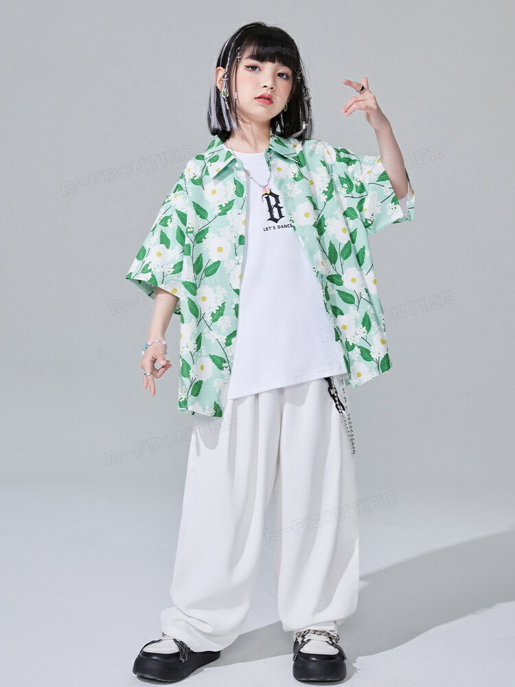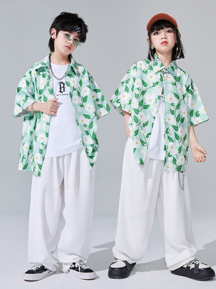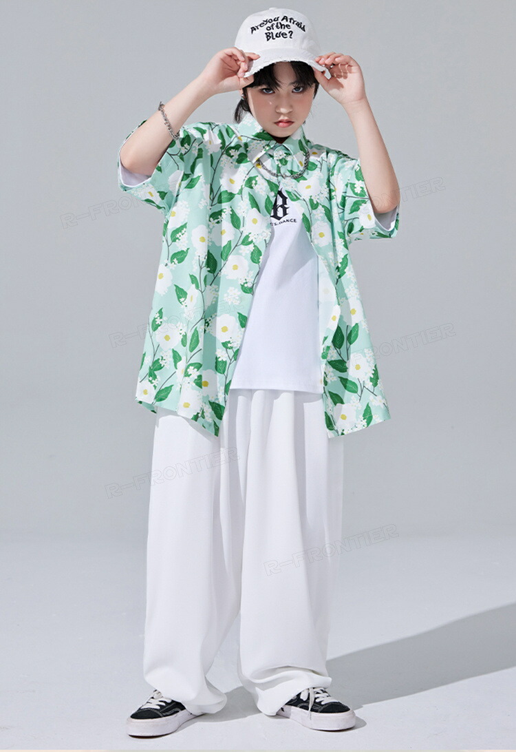 ダンス衣装 キッズ セットアップ 柄シャツ 白パンツ ダンストップス HIPHOP ユニセックス ステージ衣装 子供 練習着 韓国 発表会 人気 おしゃれ 韓国 かっこいい 派手 110-180cm