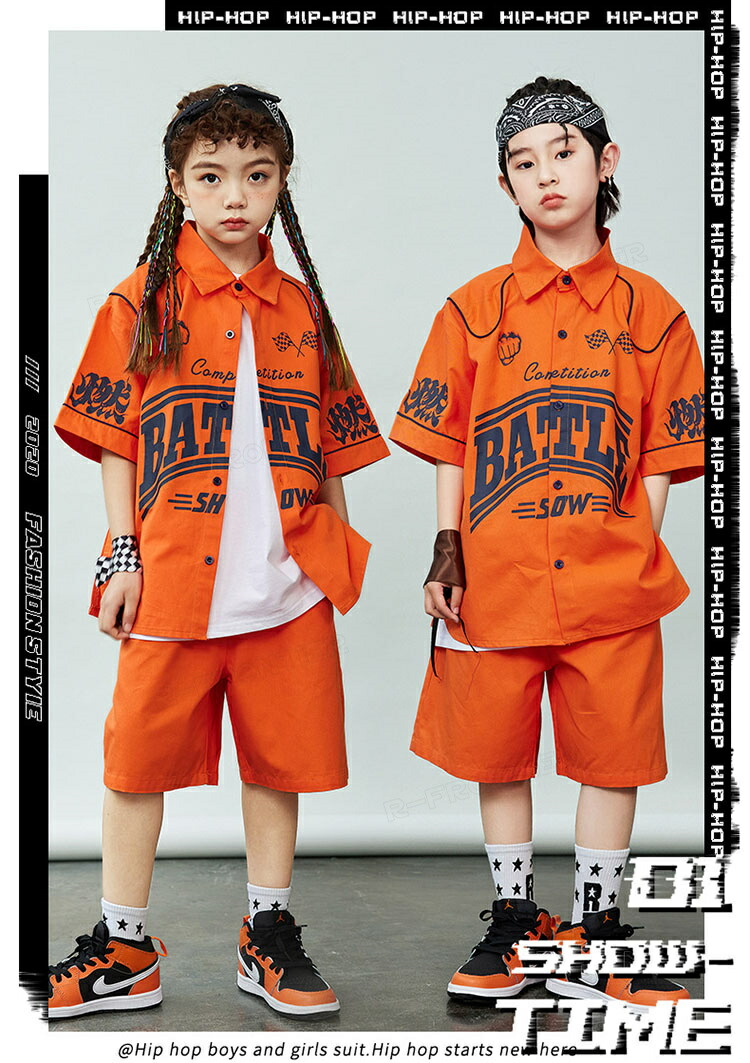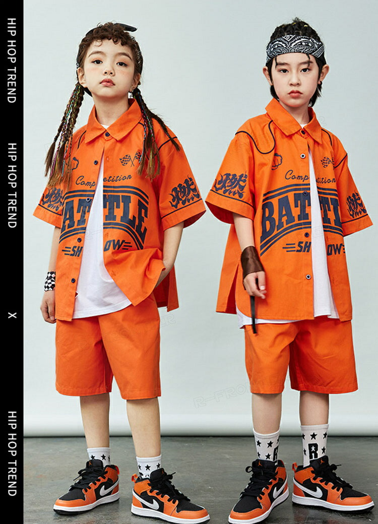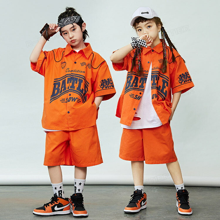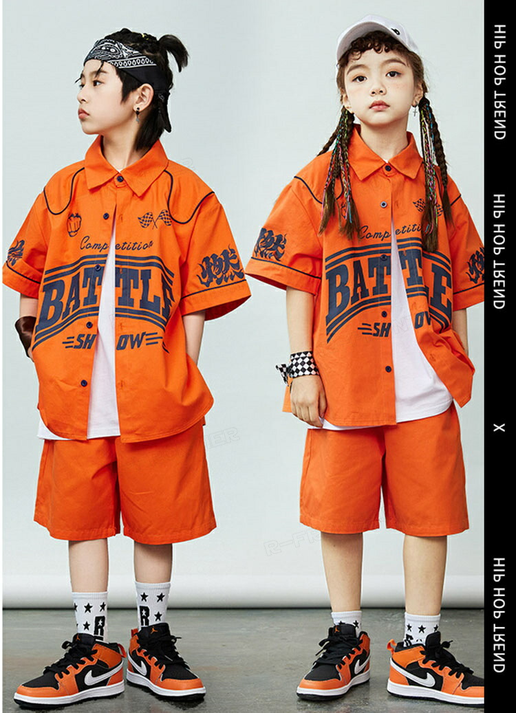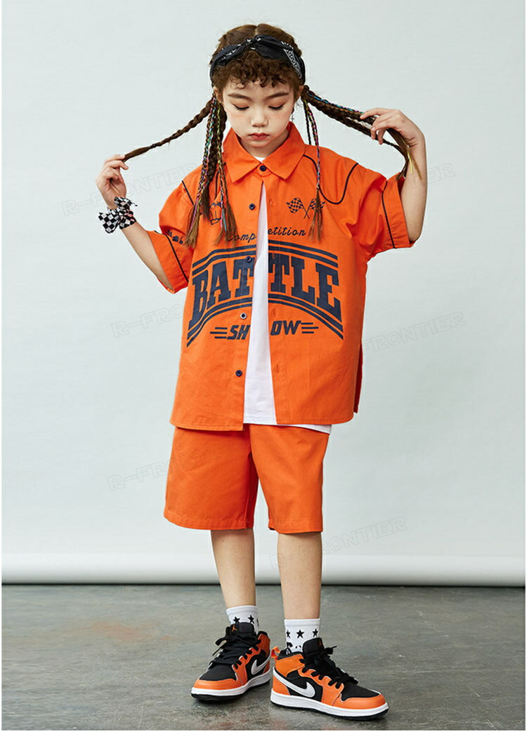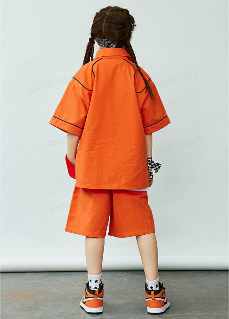 ダンス衣装 キッズ ユニセックス オレンジ トップス ハーフパンツ HIPHOP ユニセックス ステージ衣装 子供 練習着 韓国 発表会 人気 おしゃれ 韓国 かっこいい 派手 110-180cm