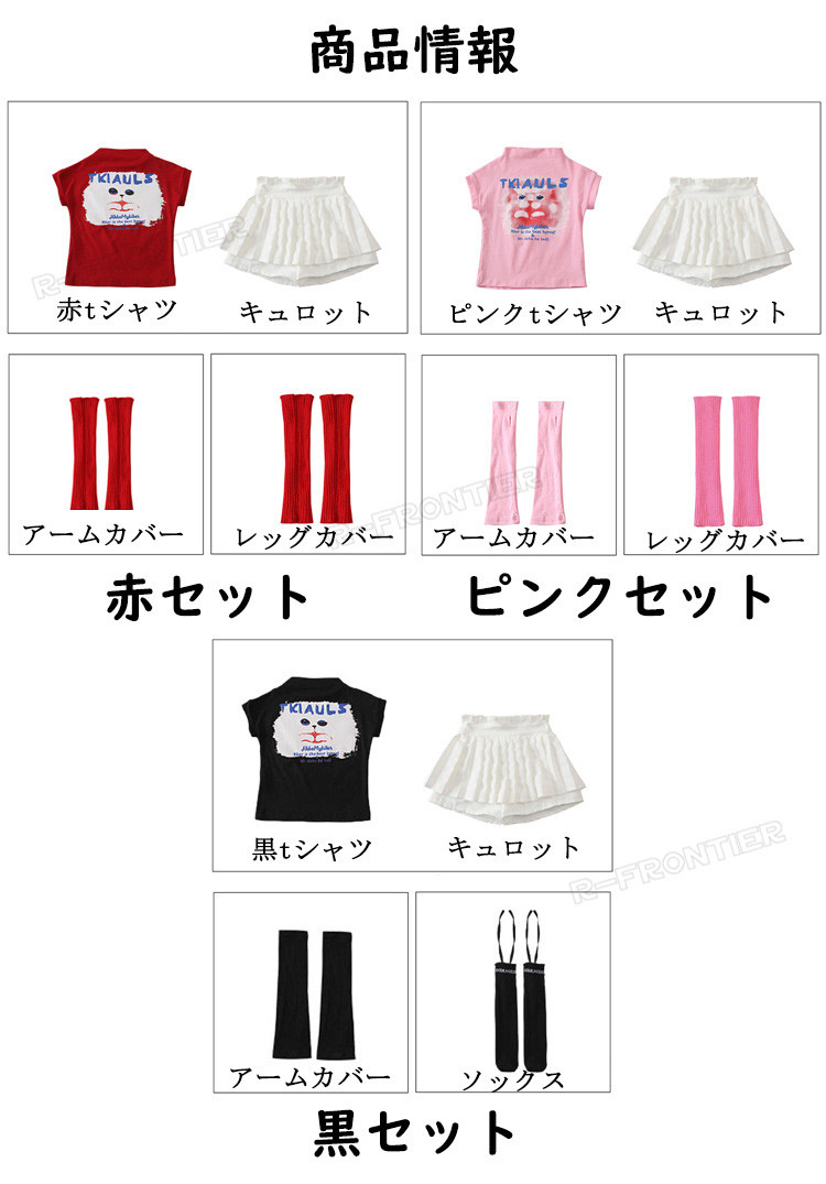 horizontal-key: 赤tシャツ++アームカバー ピンクtシャツ++アームカバー 黒tシャツ++アームカバー キュロットのみ 赤4点セット ピンク4点セット 黒4点セット