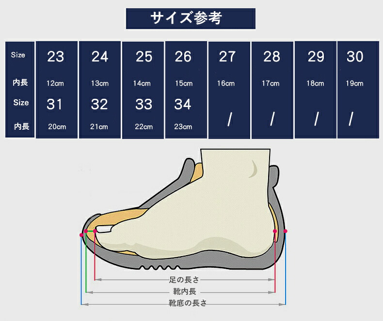 vertical-key: 23 (内長12cm) 24 (内長13cm) 25 (内長14cm) 26 (内長15cm) 27(内長16cm) 28(内長17cm) 29(内長18cm) 30(内長19cm) 31 (内長20cm) 32 (内長21cm) 33(内長22cm) 34(内長23cm)