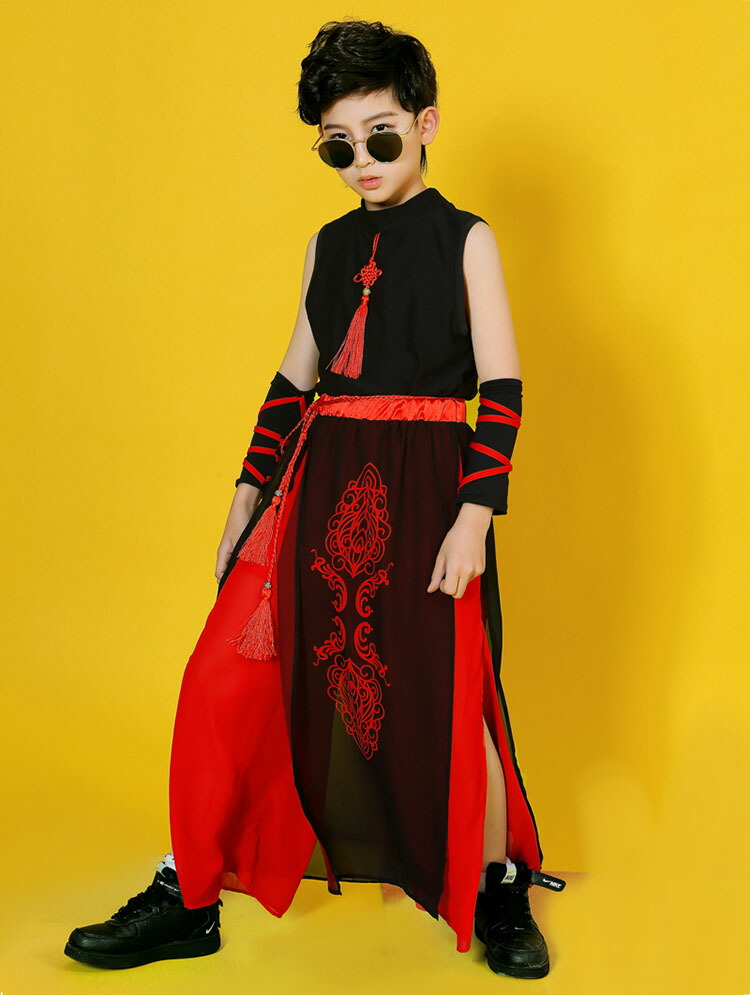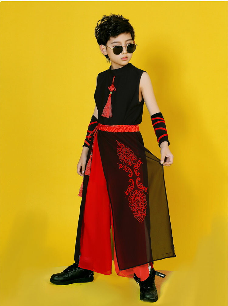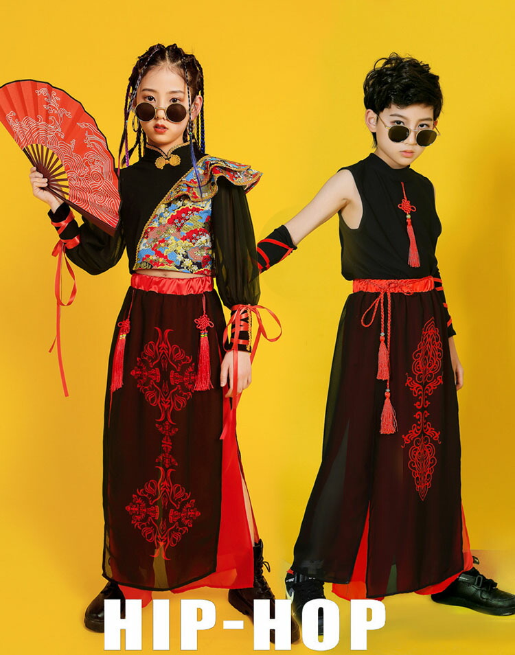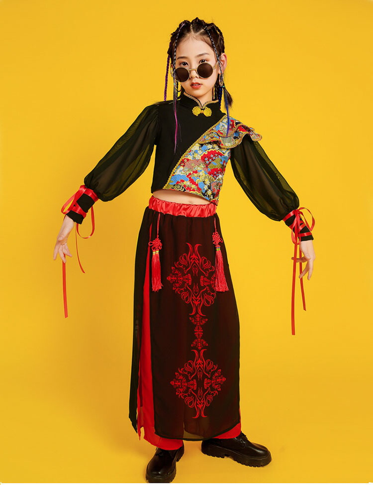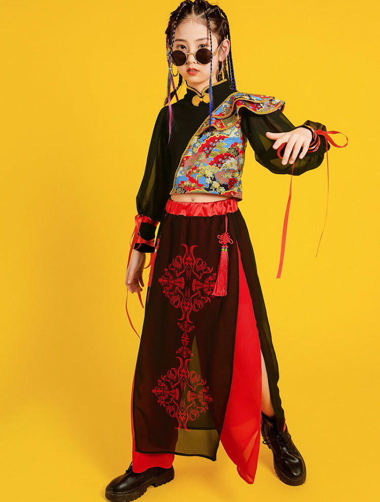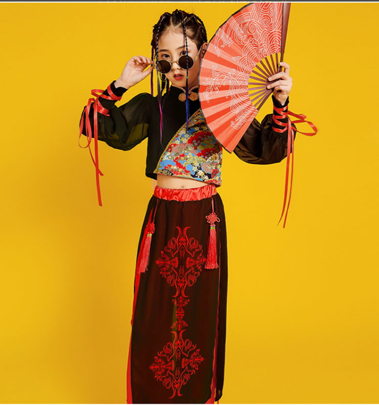 チャイナ風 ダンス衣装 赤 へそ出し トップス ヒップホップ キッズ 女の子 中華風 セットアップ スカート 子供 HIPHOP ジャズダンス イベント 発表会 120 130 140 150 160