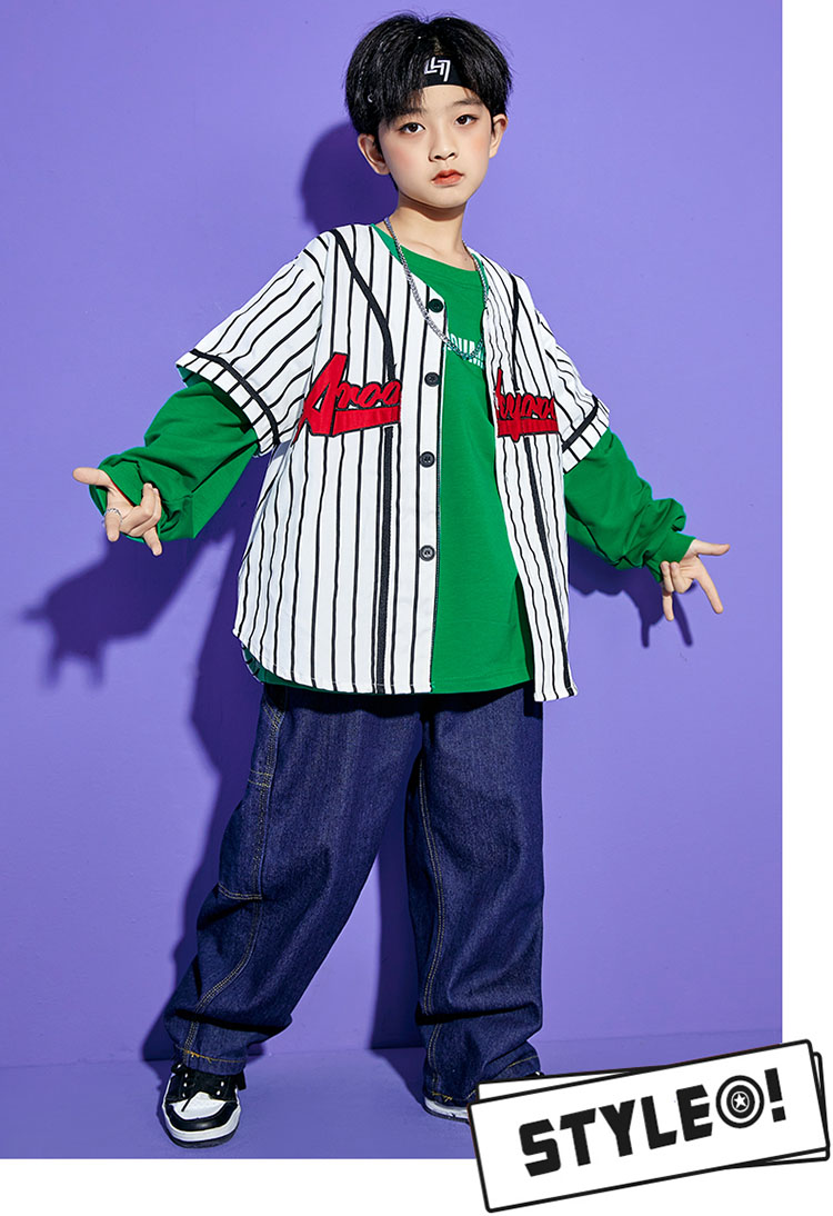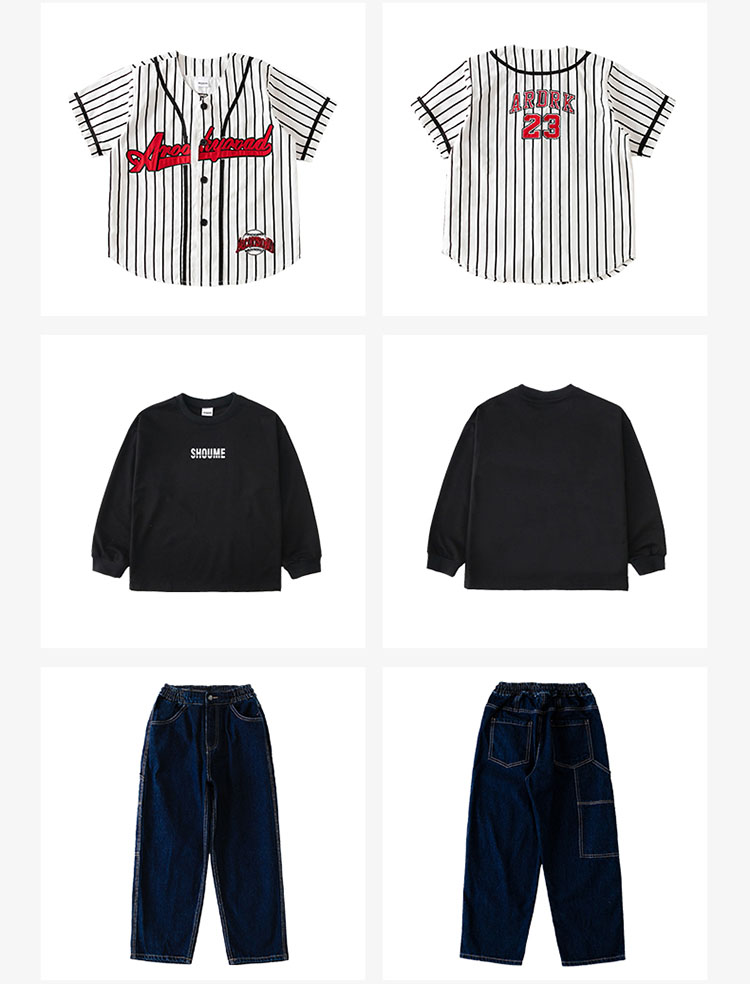 Key0: 長袖tシャツ(ブラック) 長袖tシャツ(グリーン) 長袖tシャツ(オレンジ) 長袖tシャツ(ブルー) デニムパンツ 縞柄シャツ