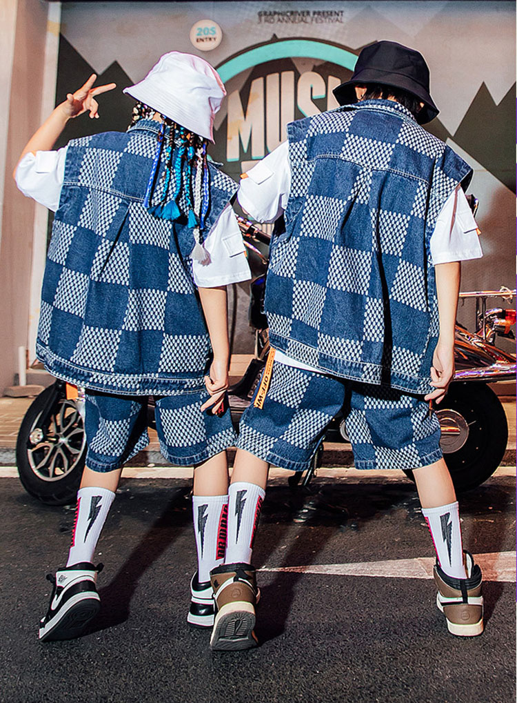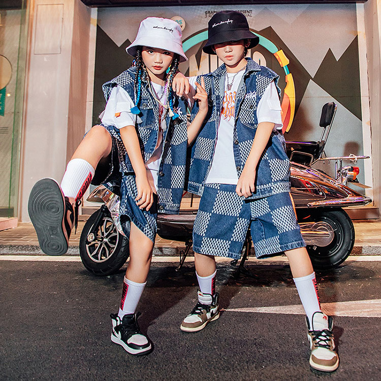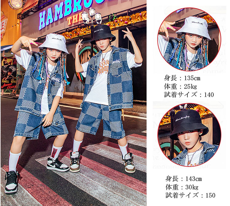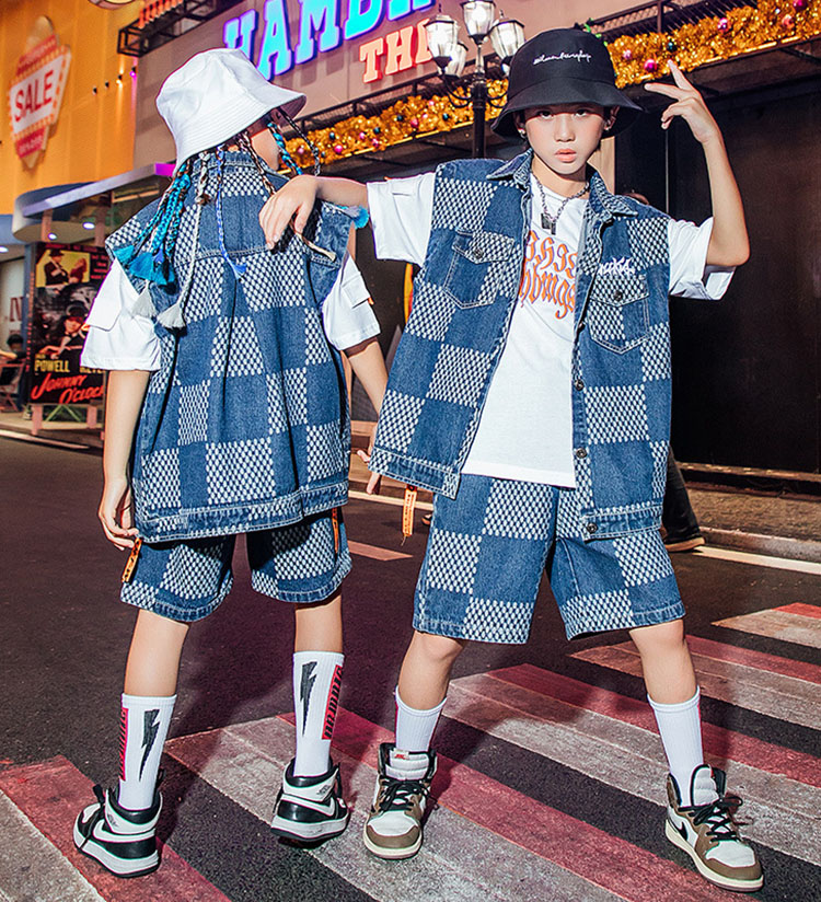 ダンス衣装 キッズ デニム チェック柄 ヒップホップ ベスト ズボン 夏 HIPHOP 子供 男の子 女の子 ステージ衣装 団体服 発表会 演出服 韓国 カッコイイ