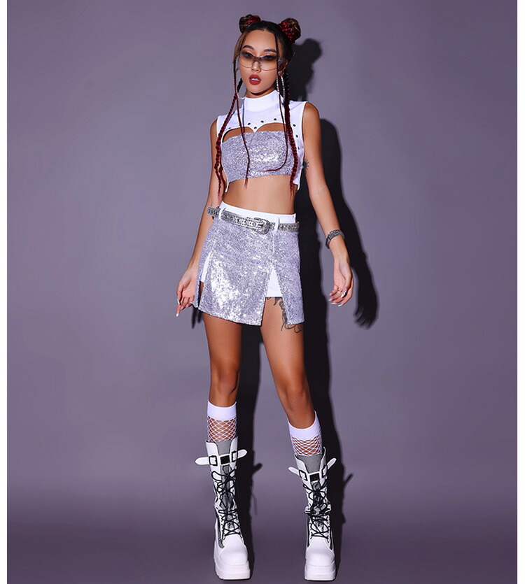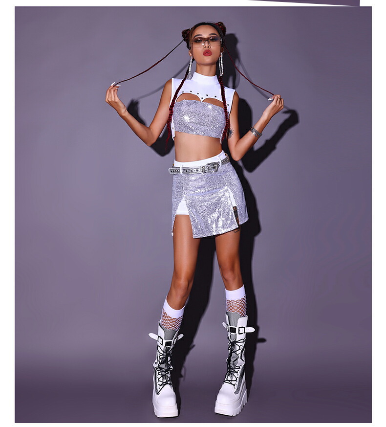 シルバー ジャズダンス 衣装 レディース K-POP ダンス衣装 セットアップ レディース 大人 韓国 ジャズ ダンス衣装 へそ出し ヒップホップ DS チアダンス