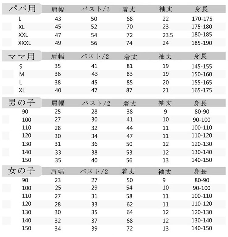 Key2: 男の子90cm 男の子100cm 男の子110cm 男の子120cm 男の子130cm 男の子140cm 男の子150cm 女の子90cm 女の子100cm 女の子110cm 女の子120cm 女の子130cm 女の子140cm 女の子150cm ママS ママM ママL ママXL ママ2XL パパM パパL パパXL パパ2XL パパ3XL