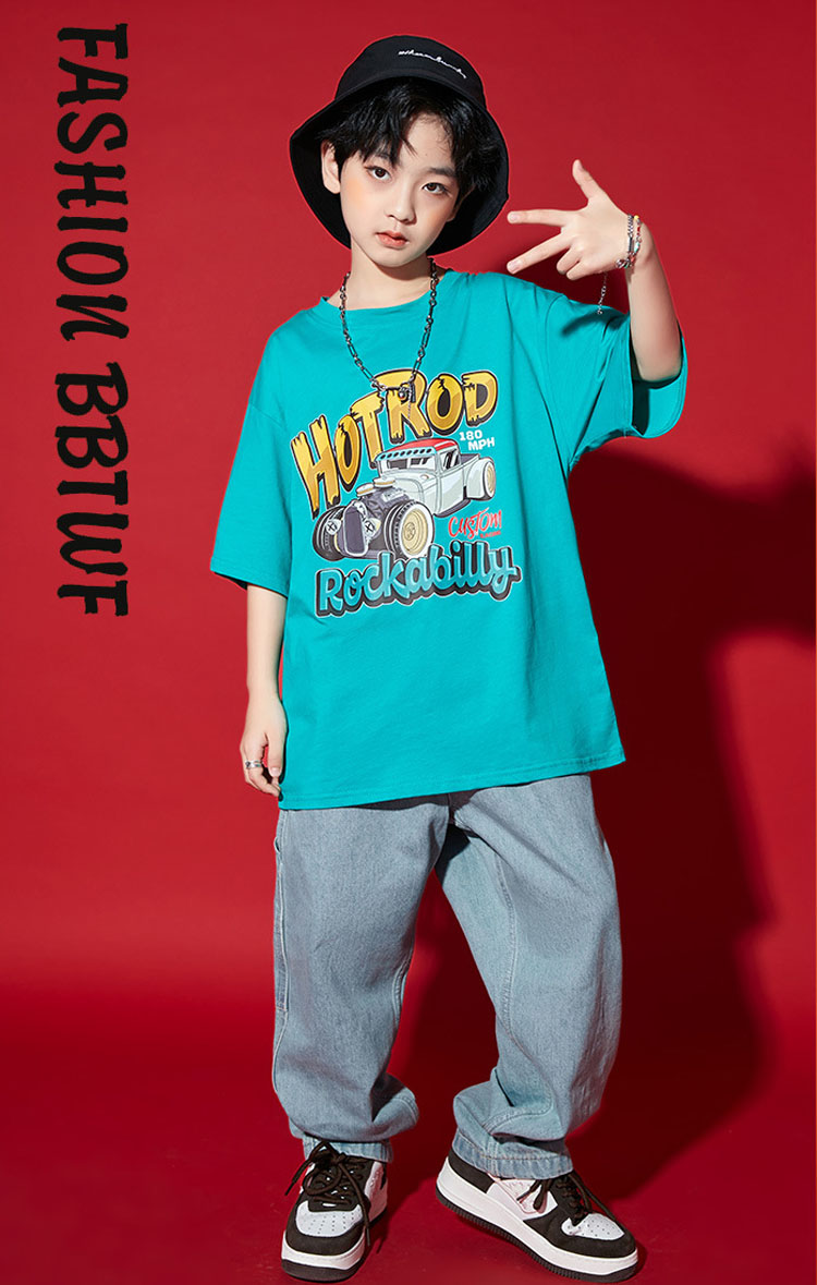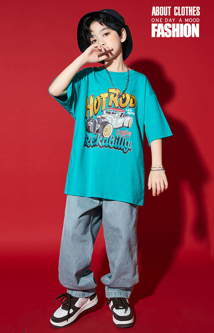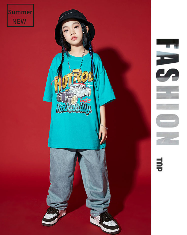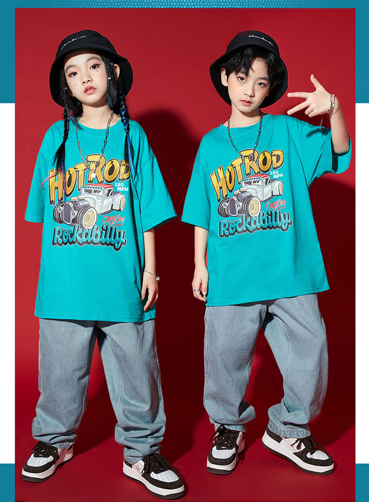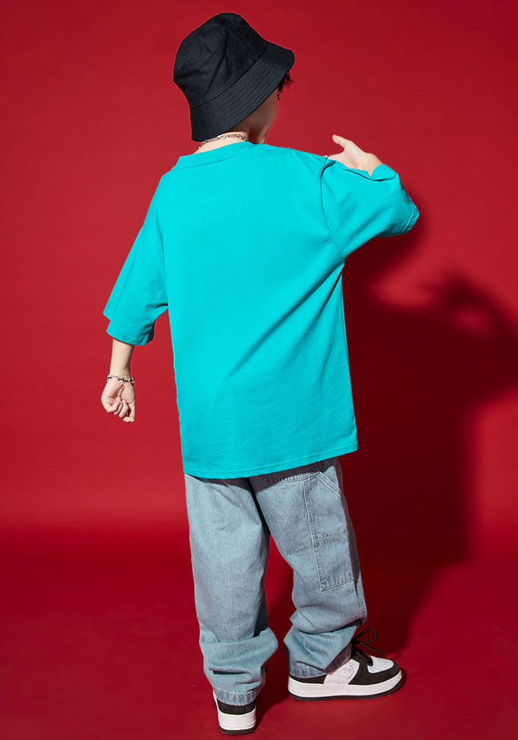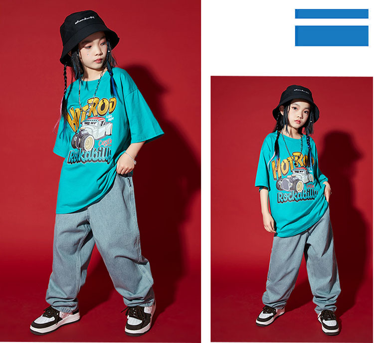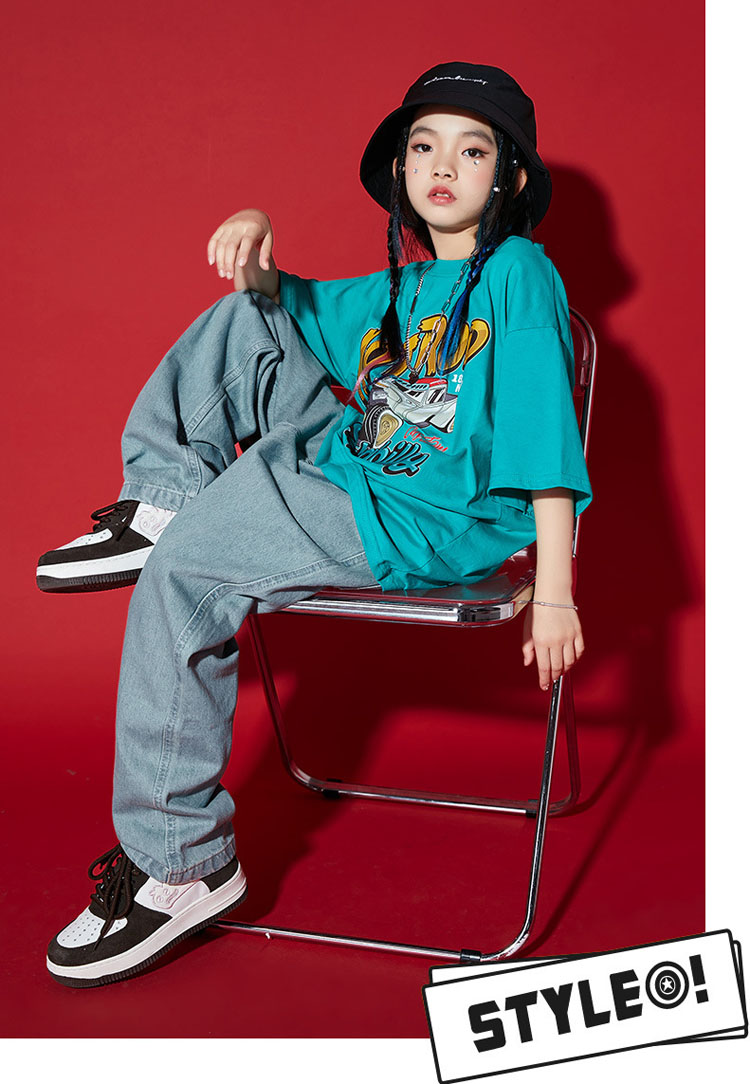 ダンス衣装 キッズ セットアップ デニムパンツ 水色 tシャツ ダンスパンツ ゆったり ヒップホップ 団体 HIPHOP ダンス衣装 女の子 男の子 イベント 110 120 130 140 150