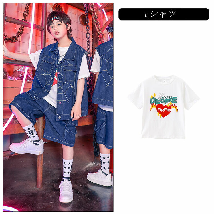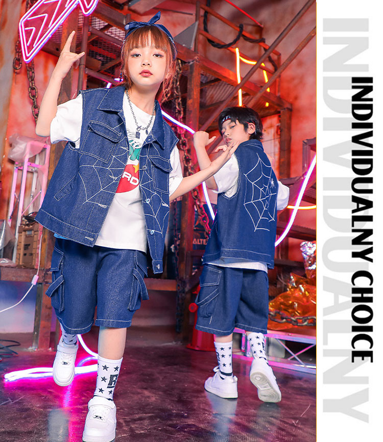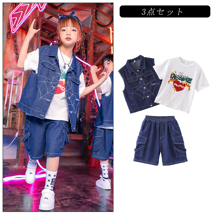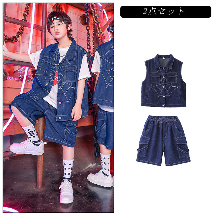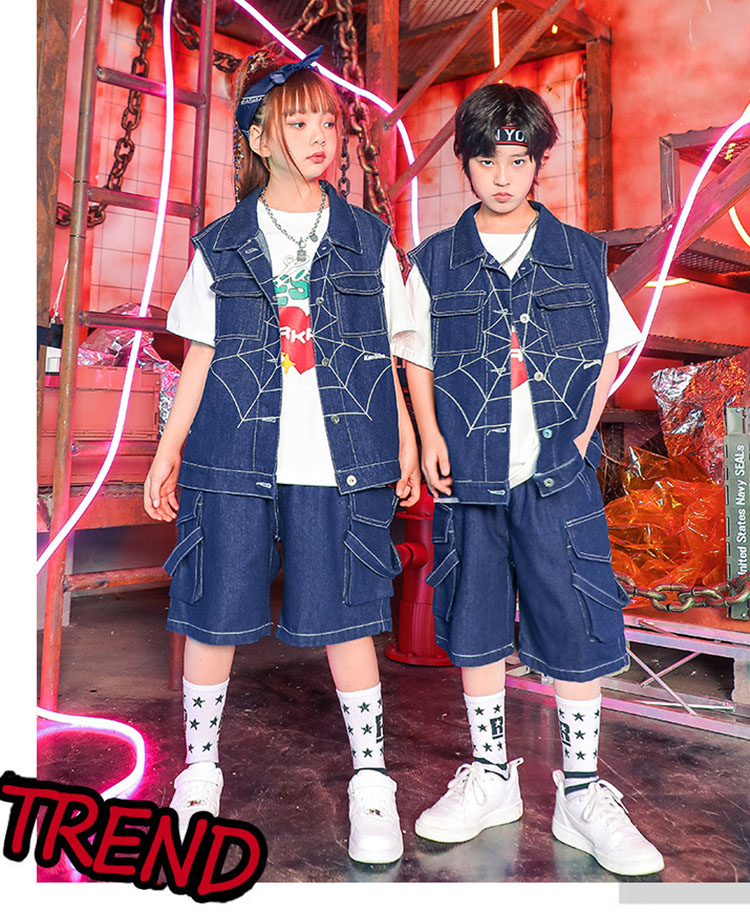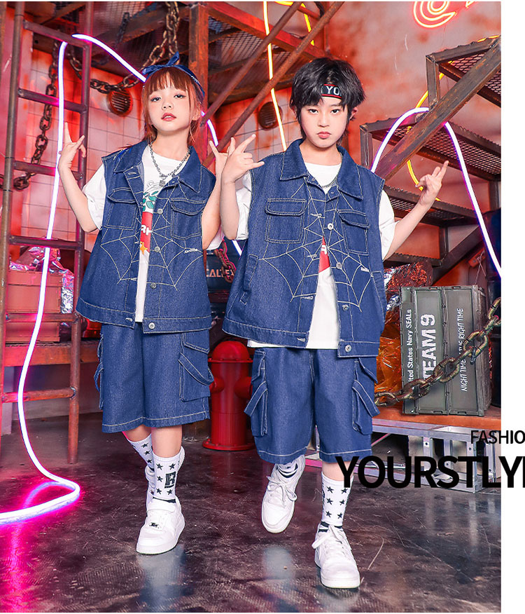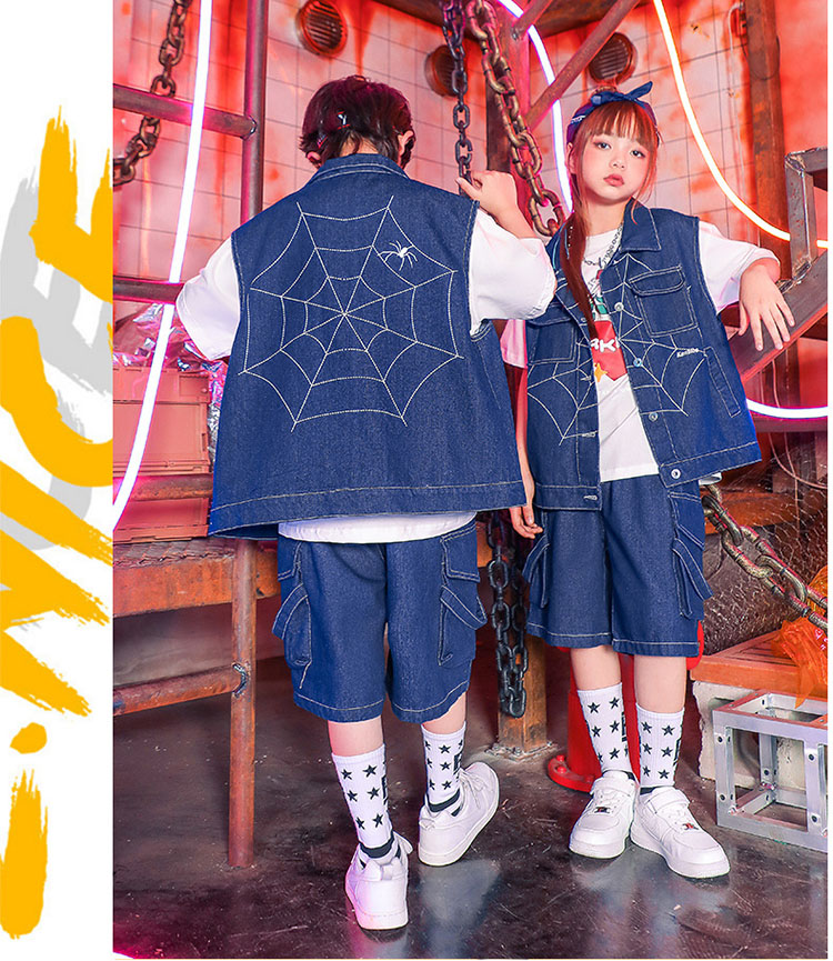 デニム ユニセックス ダンス衣装 キッズ ヒップホップ セットアップ ベスト ショートパンツ 半袖tシャツ ゆったり ヒップホップ 団体 HIPHOP イベント 110 120 130 140 150