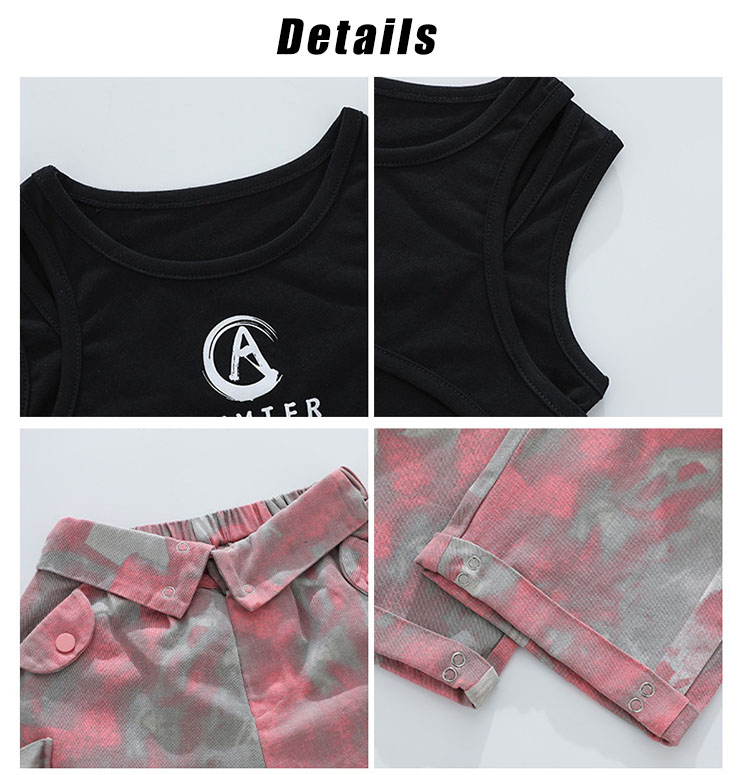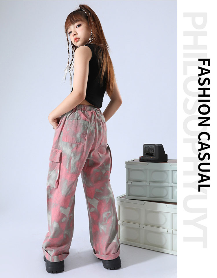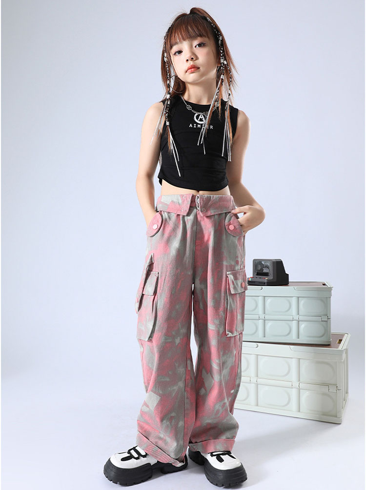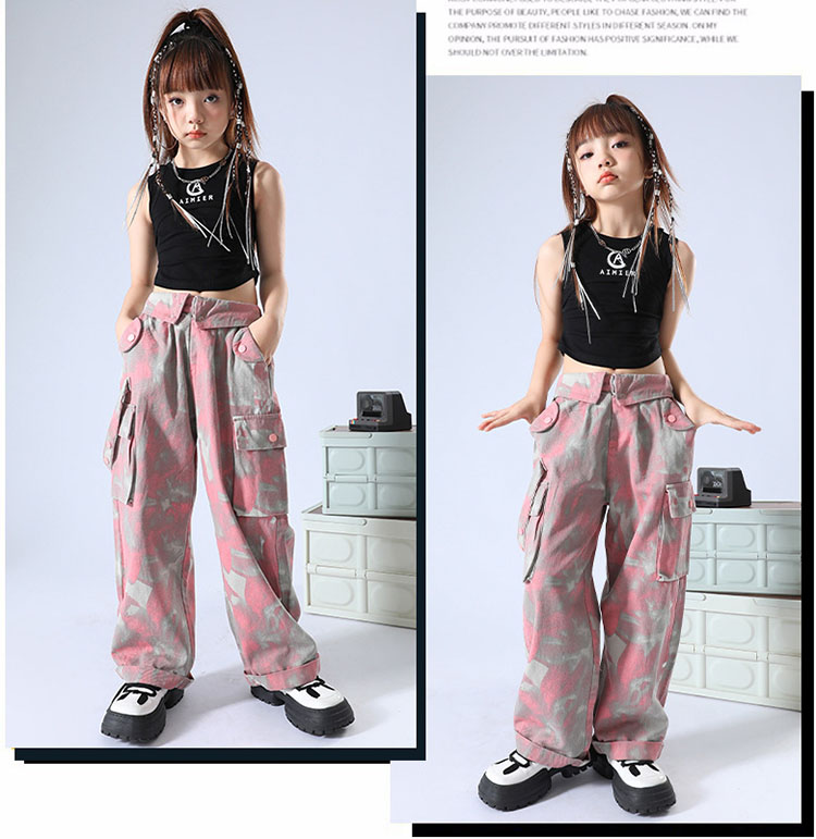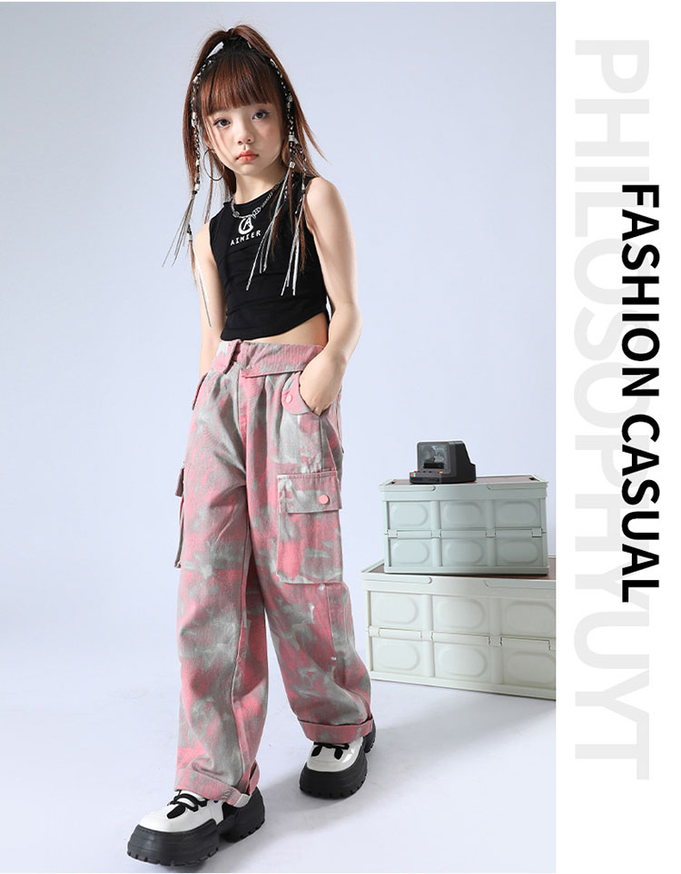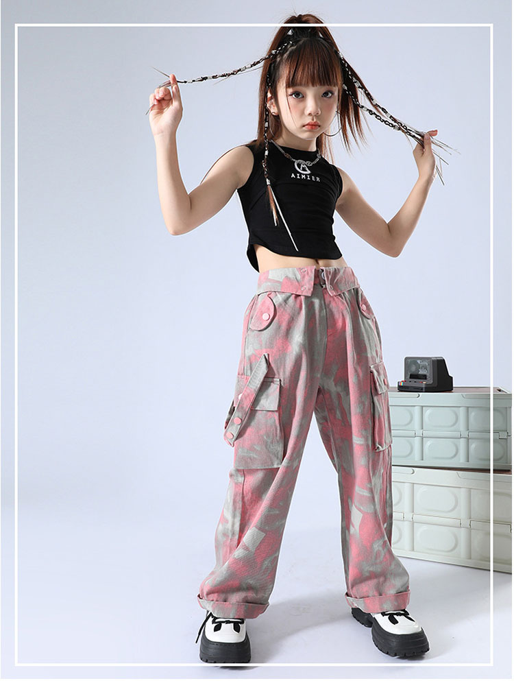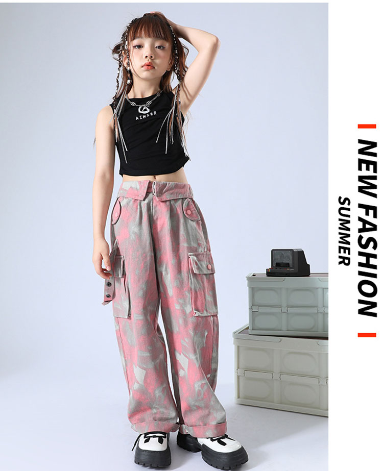 女の子 ダンス衣装 キッズ カーゴパンツ 袖無しトップス 黒タンクトップ ゆったり パンツ ヒップホップ 団体 HIPHOP イベント 110 120 130 140 150 160 170 180