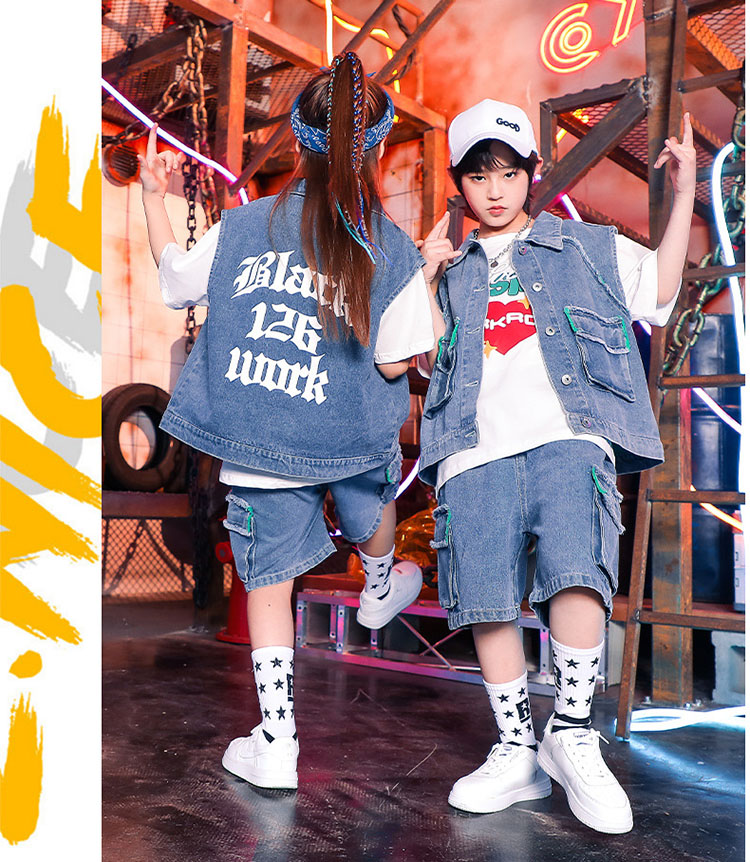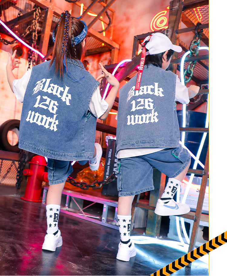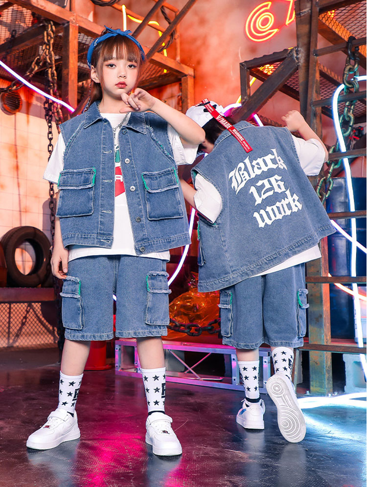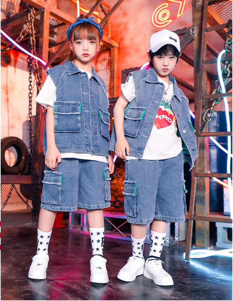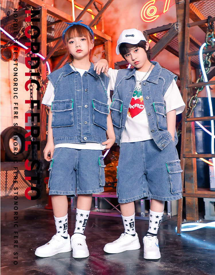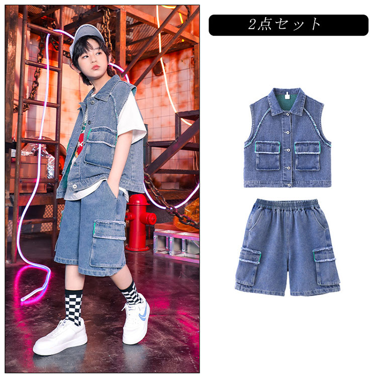 デニム キッズ ダンス衣装 ヒップホップ セットアップ ベスト ショートパンツ 半袖tシャツ ゆったり ヒップホップ 団体 HIPHOP イベント 110 120 130 140 150 160 17