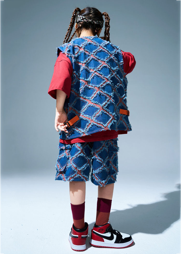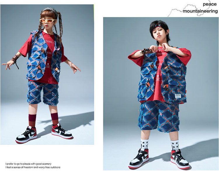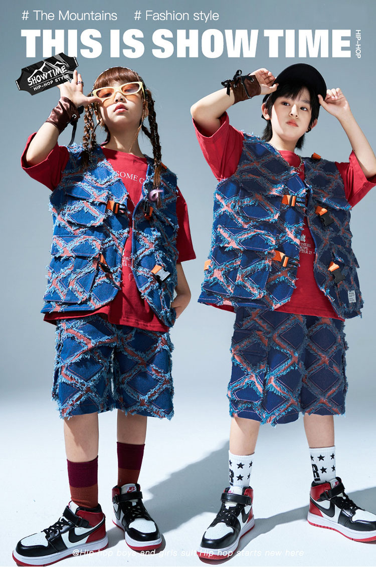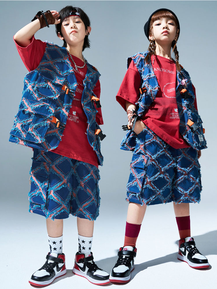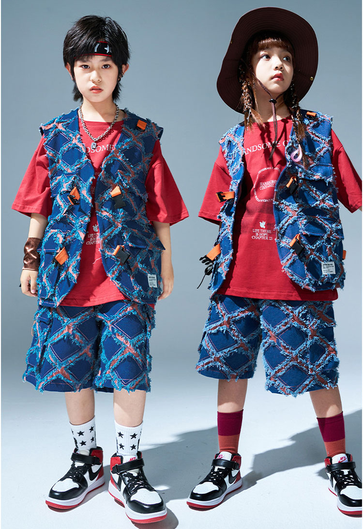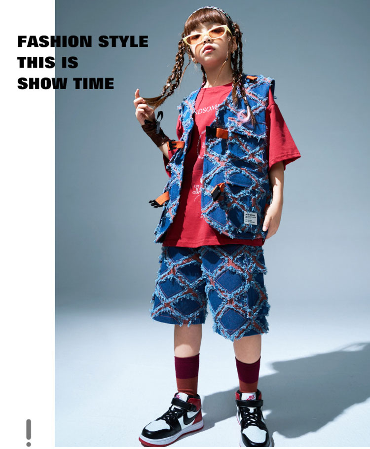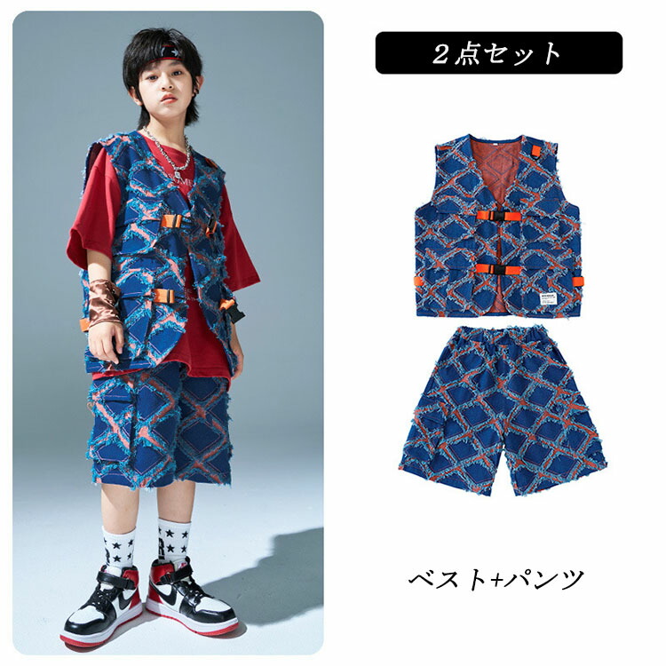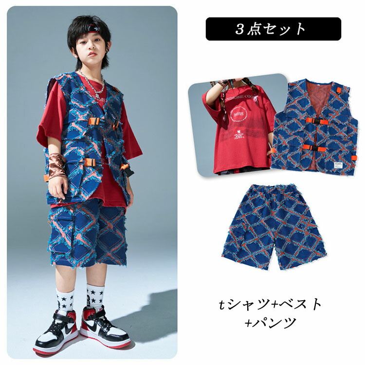 ユニセックス ダンス衣装 キッズ ヒップホップ セットアップ ベスト ショートパンツ 半袖tシャツ ゆったり パンツ ヒップホップ 団体 HIPHOP イベント 110 120 130 140 150