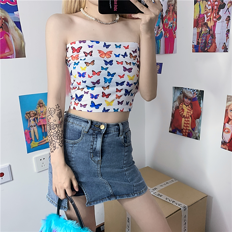 蝶柄チューブトップキャミソールタンクトップトップス白ホワイトカラフルレディースガールズダンス衣装ヒップホップHIPHOPへそ出し肌見せ短い短めショート丈インナー韓国おしゃれ可愛いストリートセクシーちょ