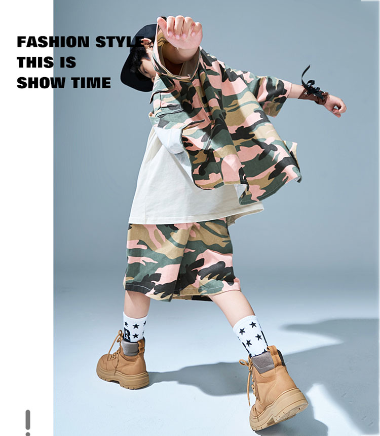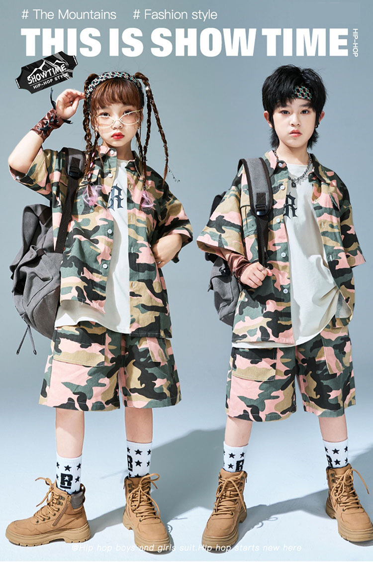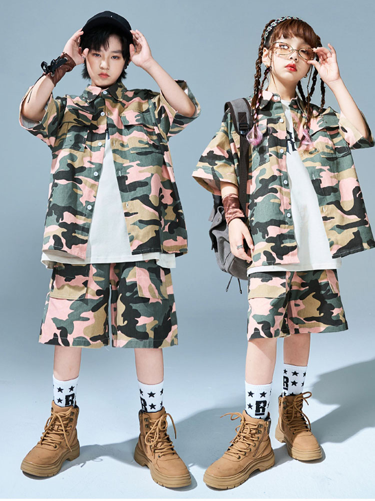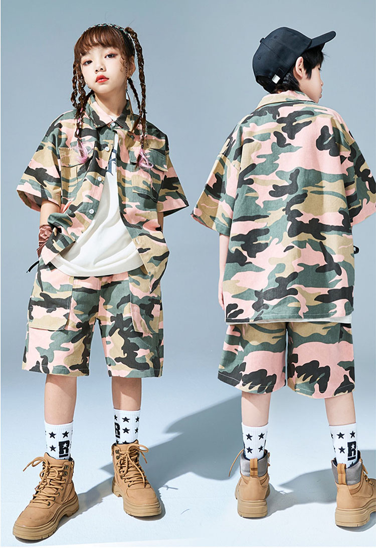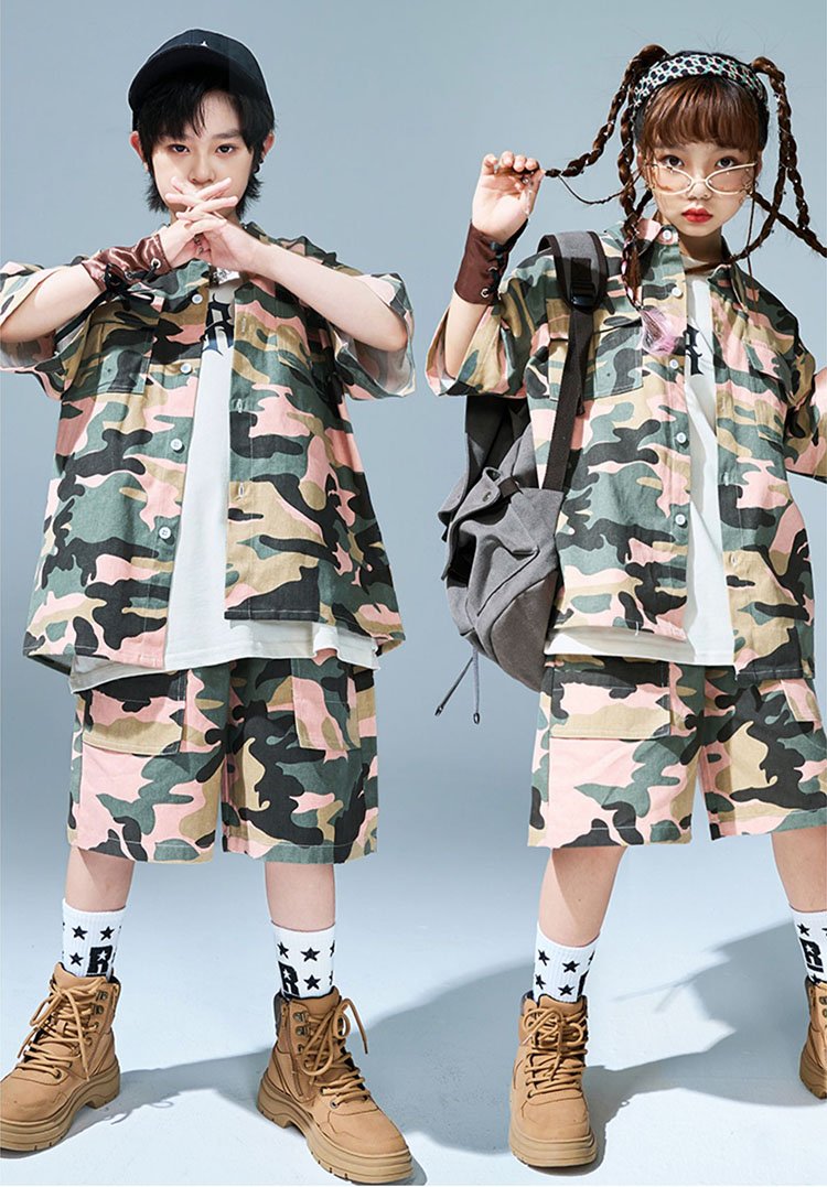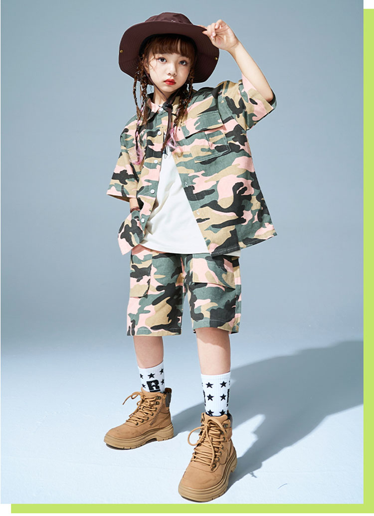 キッズ ダンス衣装 シャツ 半袖 半ズボン 迷彩柄 ヒップホップ トップス ズボン 夏 HIPHOP 子供 ユニセックス ステージ衣装 団体服 発表会 演出服 韓国