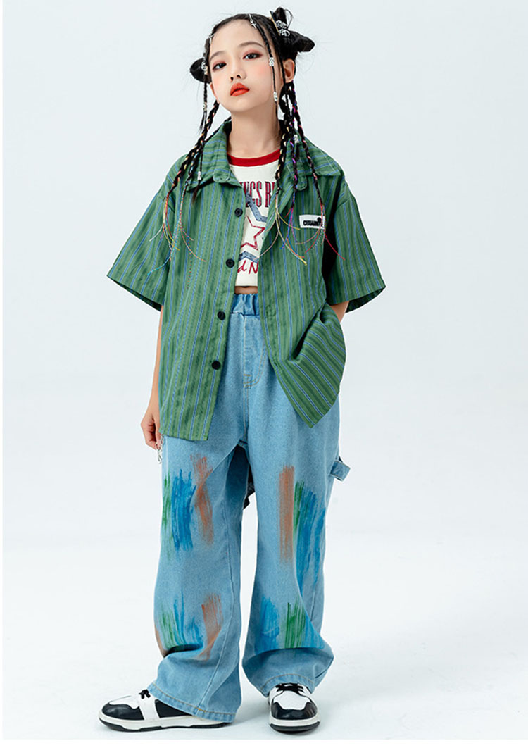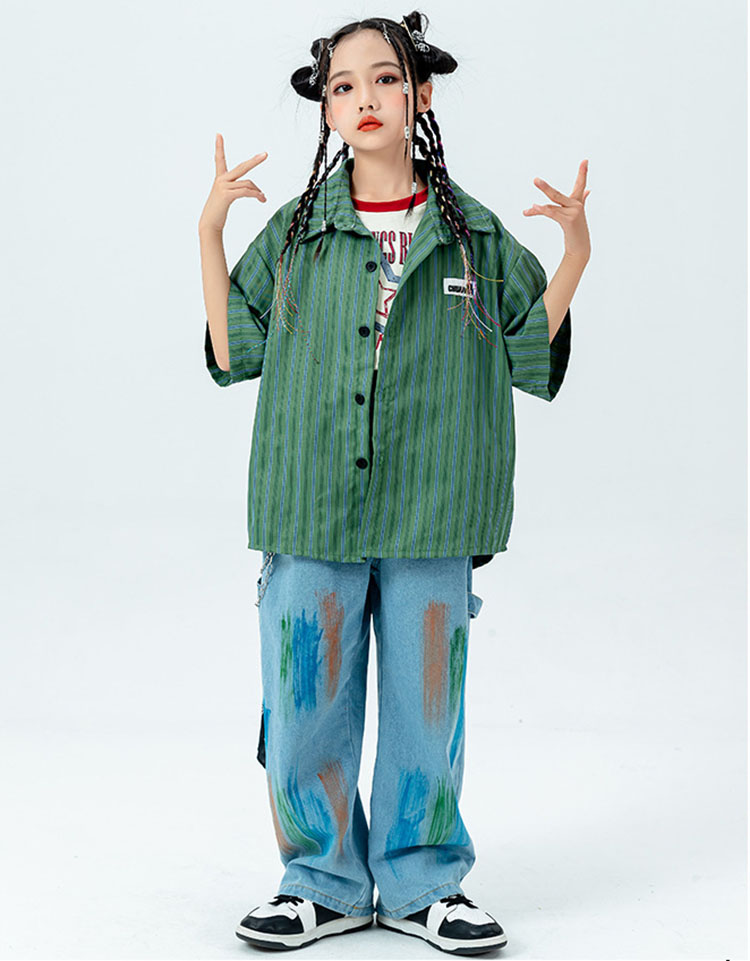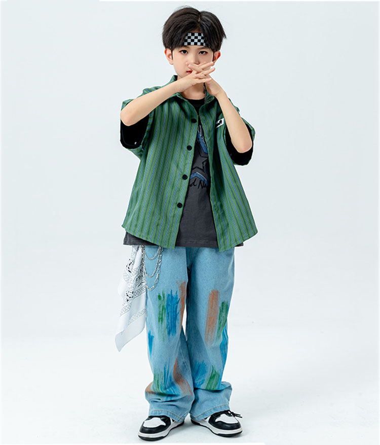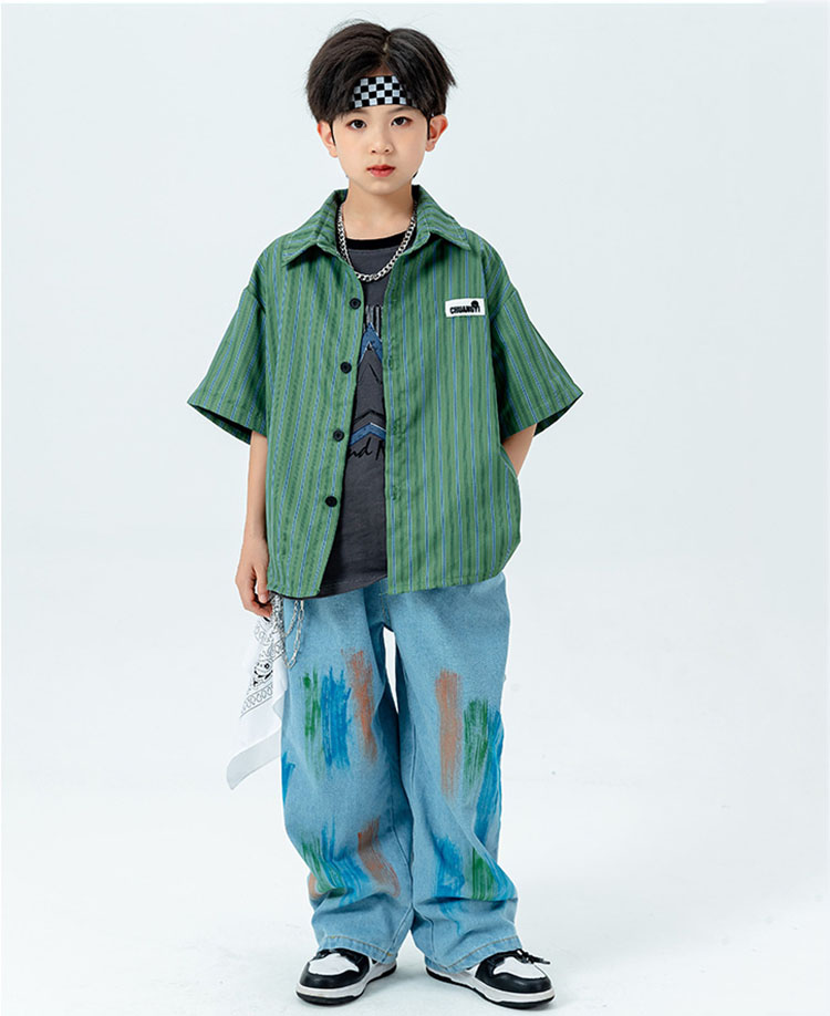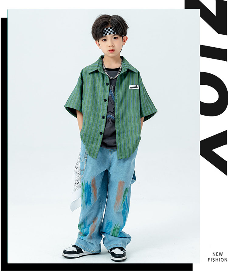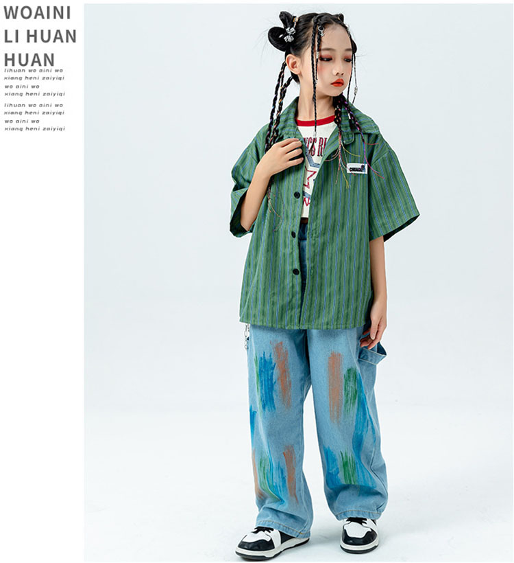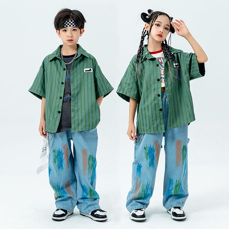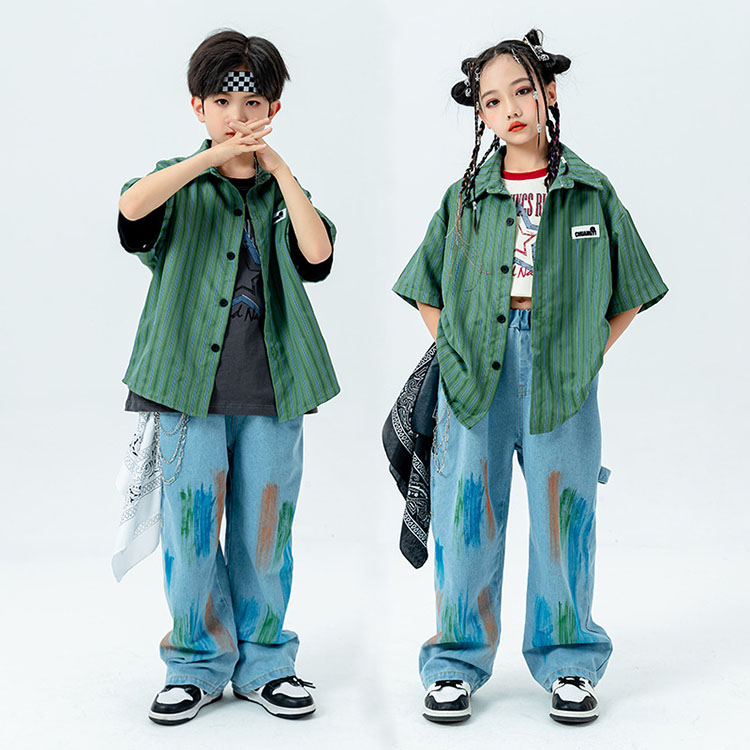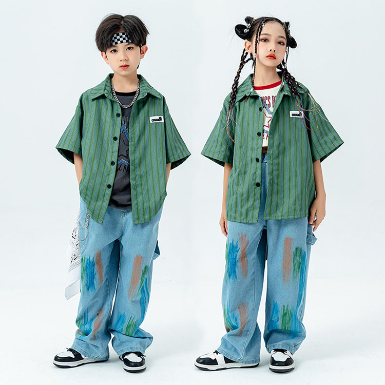 キッズ ダンス衣装 デニムパンツ ゆるシャツ 縞柄 半袖 デニム ユニセックス 男女兼用 ジャズダンス ガールズ 韓国 ヒップホップ hiphop セットアップ 演出服 応援団 練習着 110 180