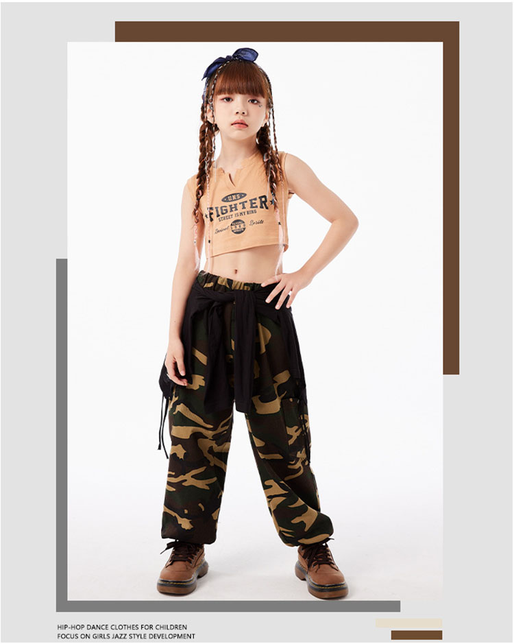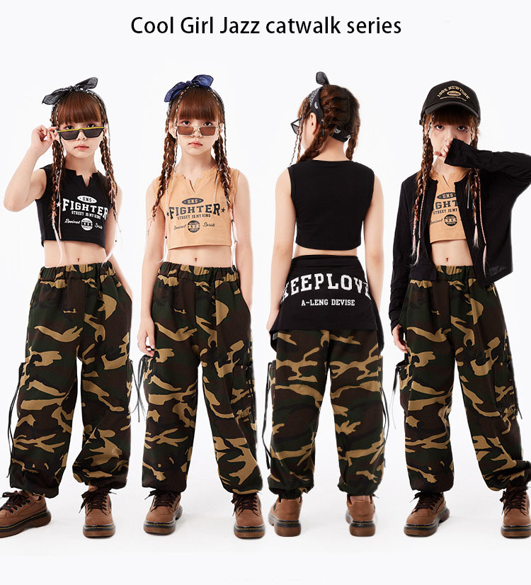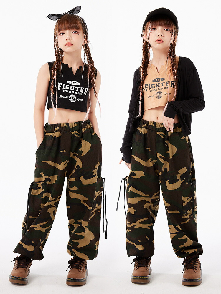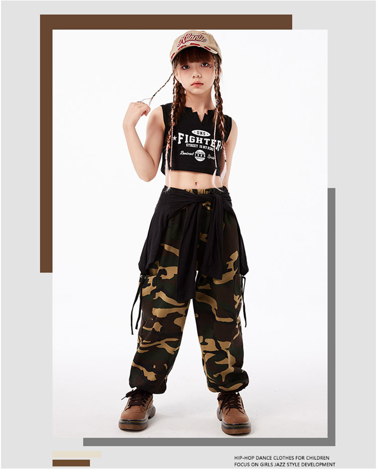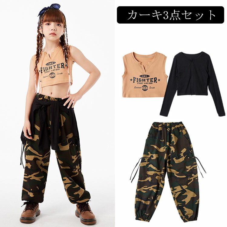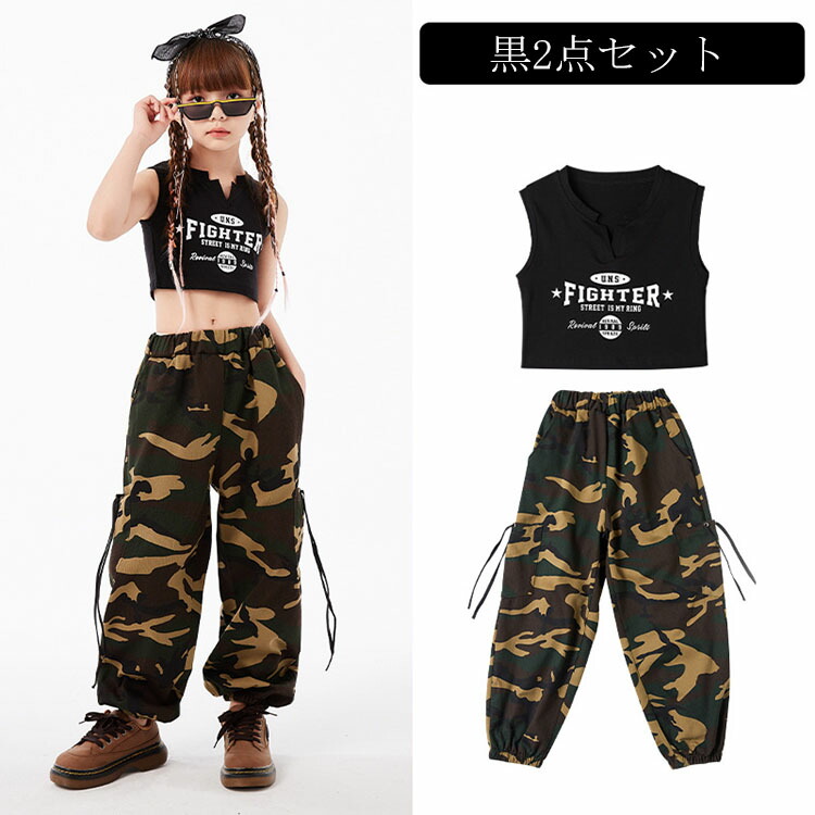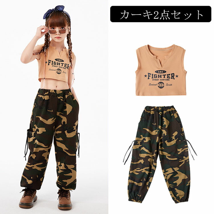 ダンス 衣装 ヒップホップ 迷彩 カーゴパンツ へそ出し トップス カッコイイ セットアップ 長ズボン HIPHOP 子供 女の子 ステージ衣装 団体服 発表会 演出服 韓国