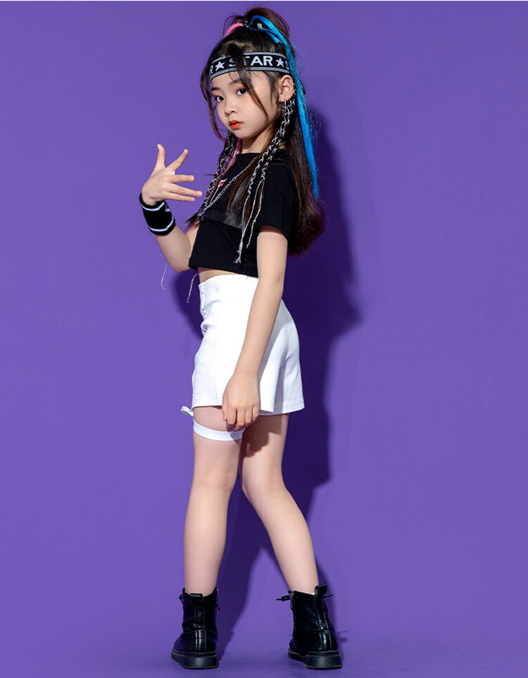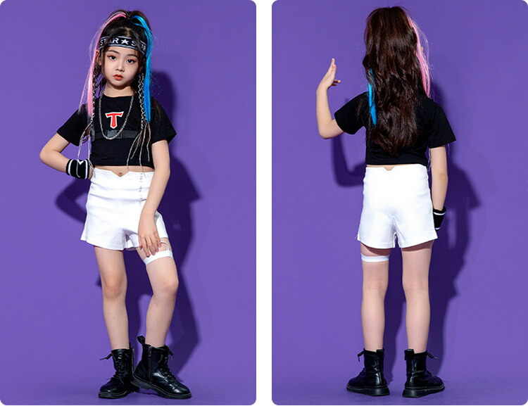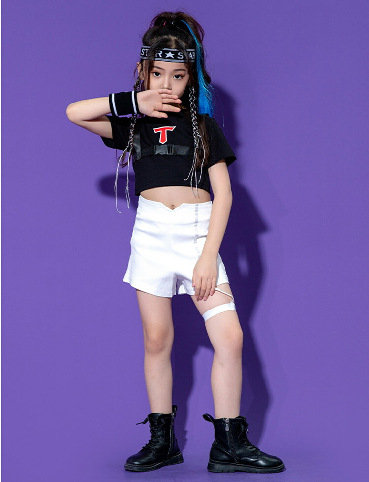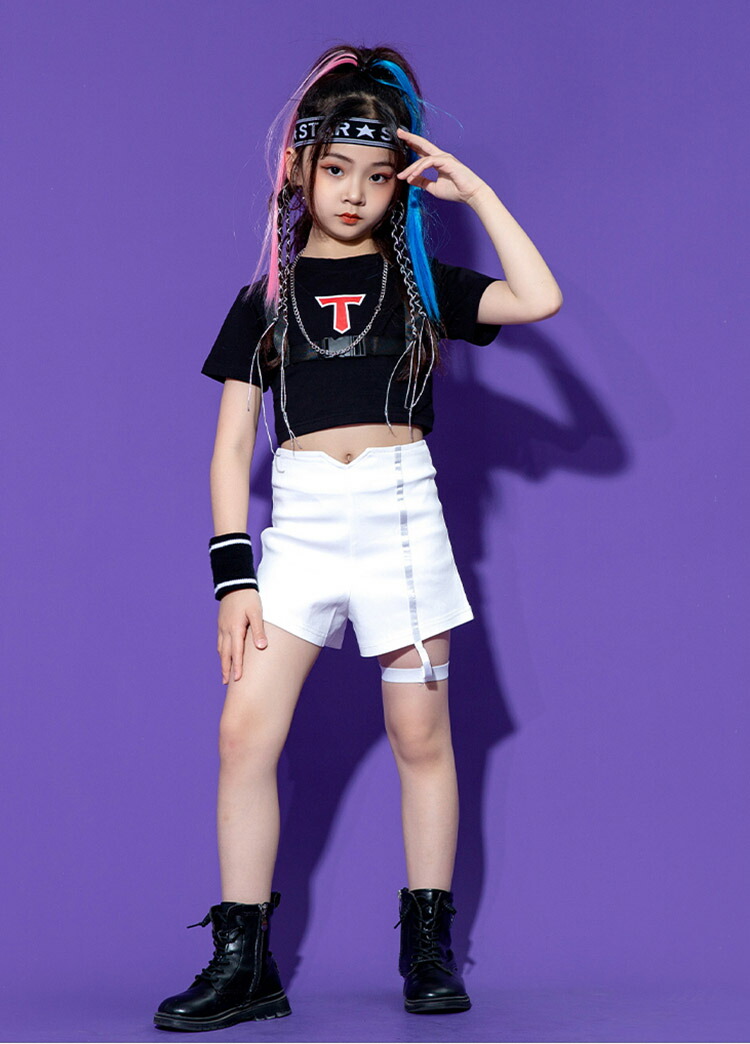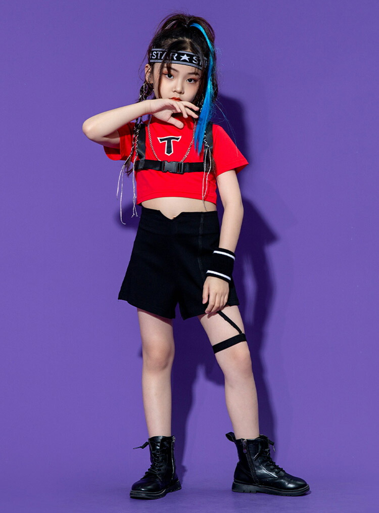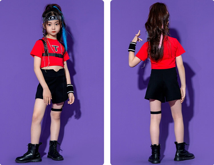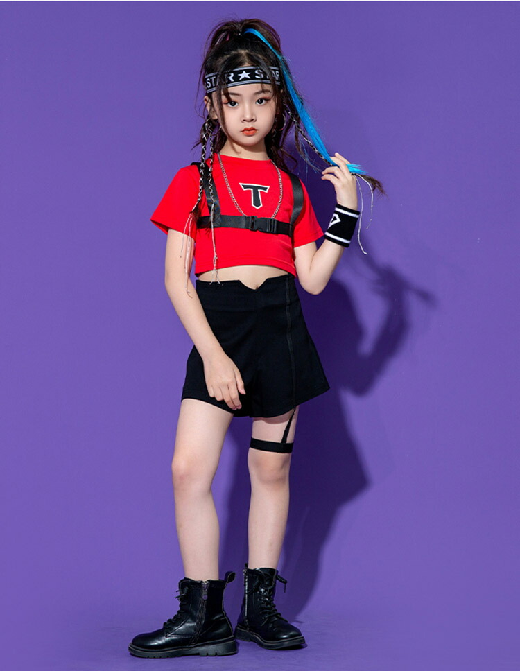 キッズ ダンス衣装 へそ出しトップス パンツ ヒップホップ 黒 白 赤 半袖 団体 HIPHOP ダンス衣装 女の子 イベント 110 120 130 140 150 160 170 180