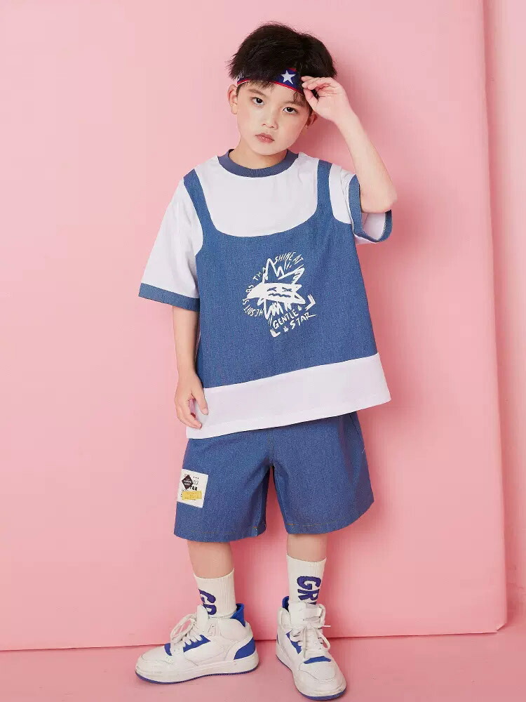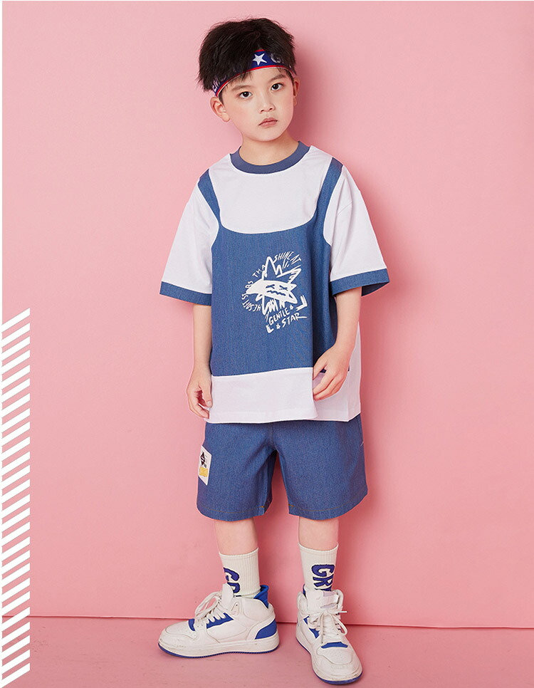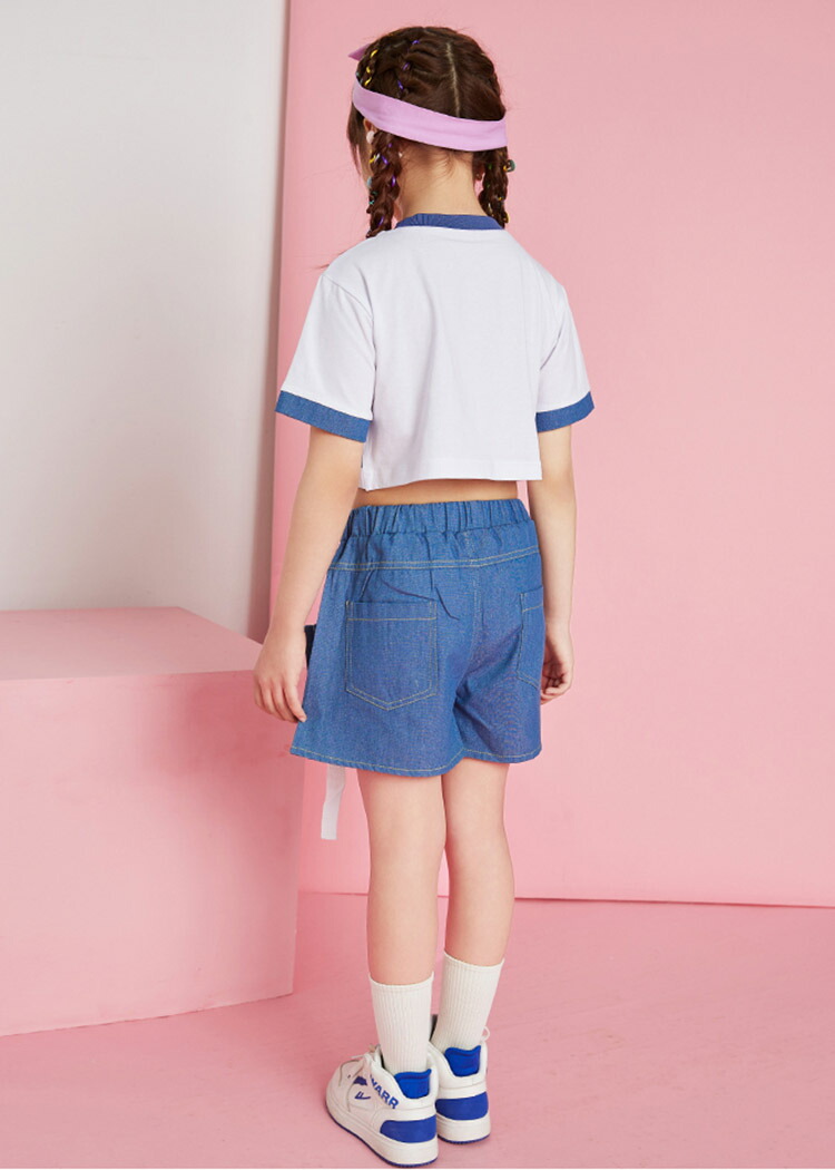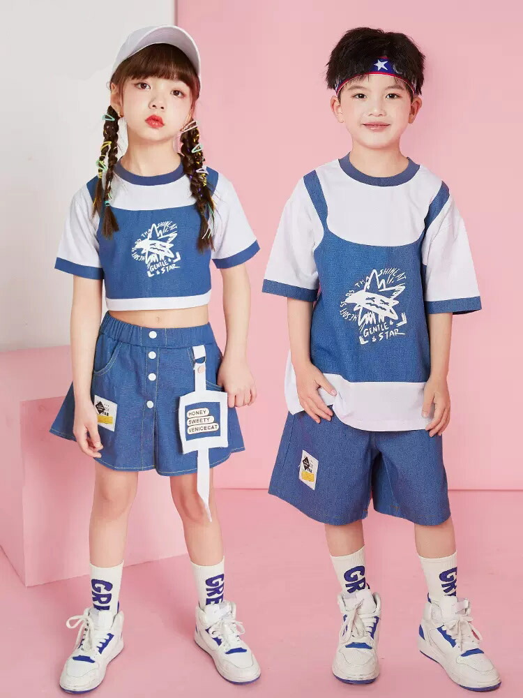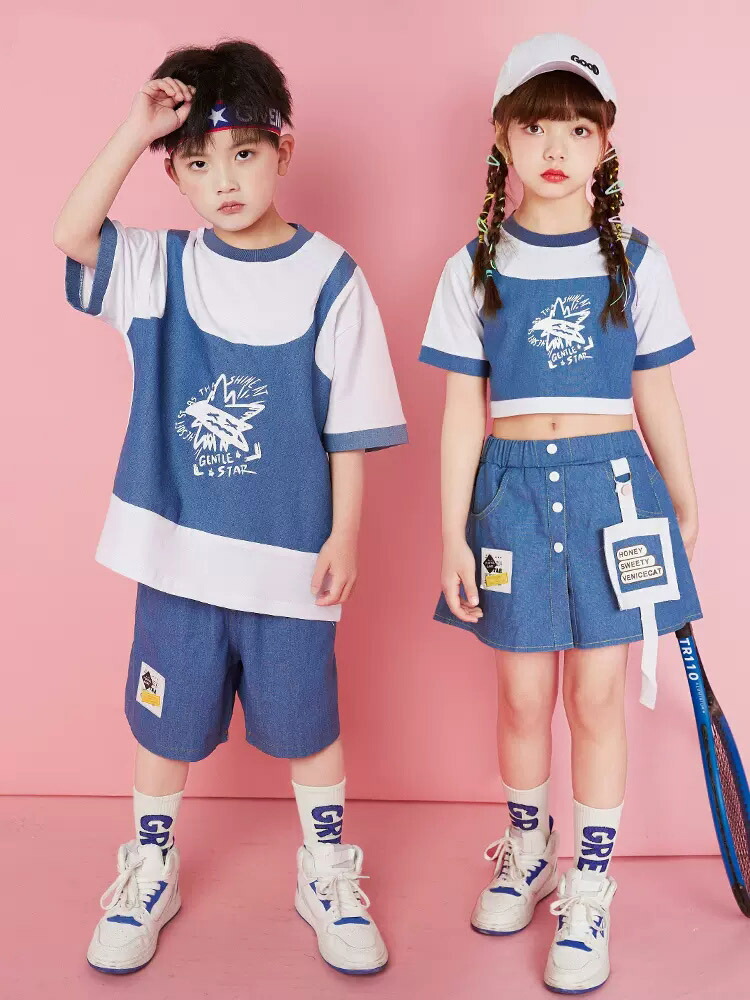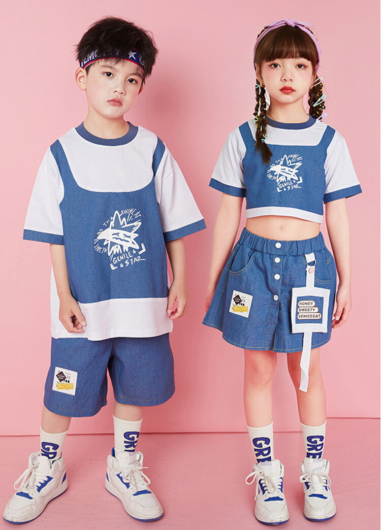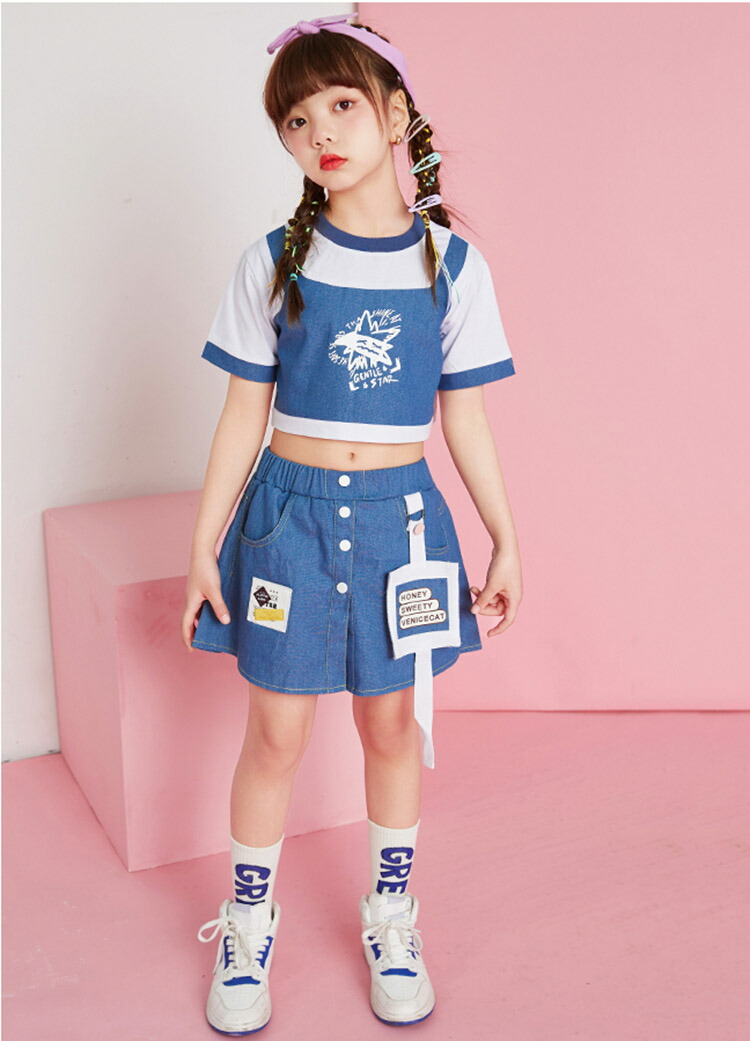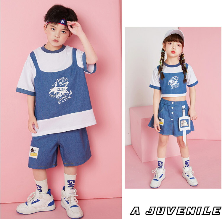 ダンス衣装 キッズ 上下セット ブルー 仮2点トップススカート ゆったり ジャズダンス ガールズ 韓国 ヒップホップ hiphop 演出服 応援団 練習着 110-180cm