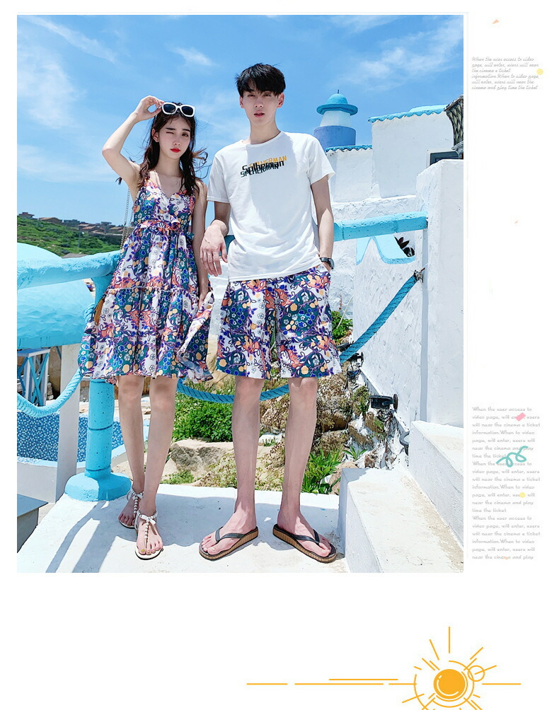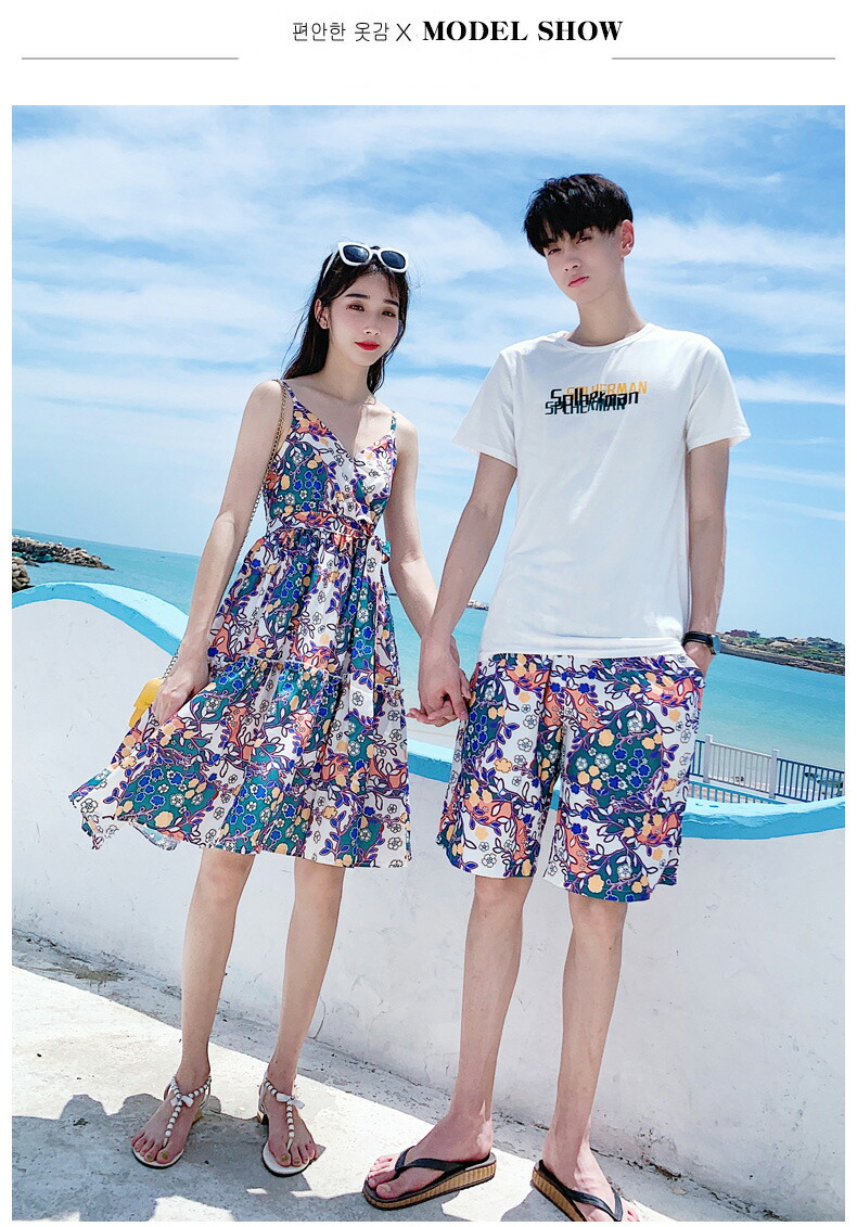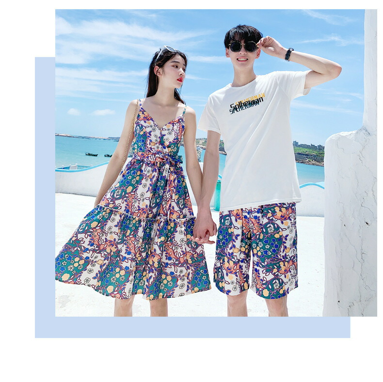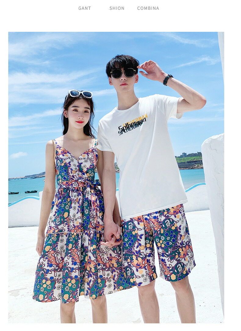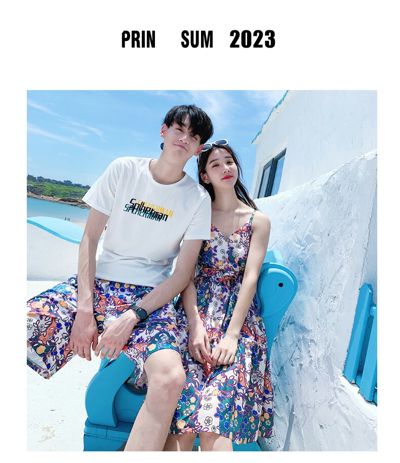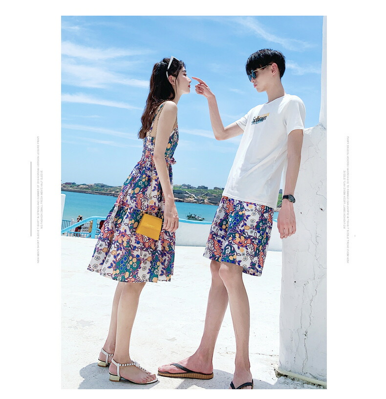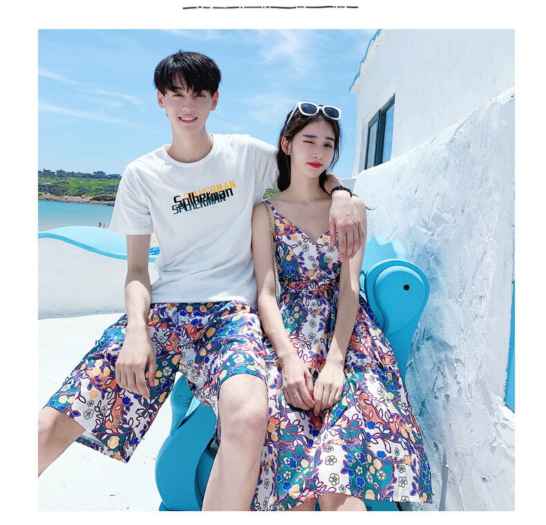 horizontal-key: 女性ワンピース 男性tシャツ+パンツ