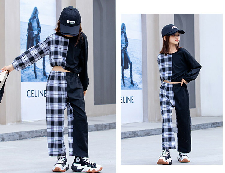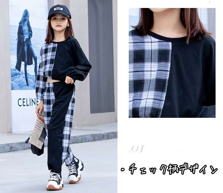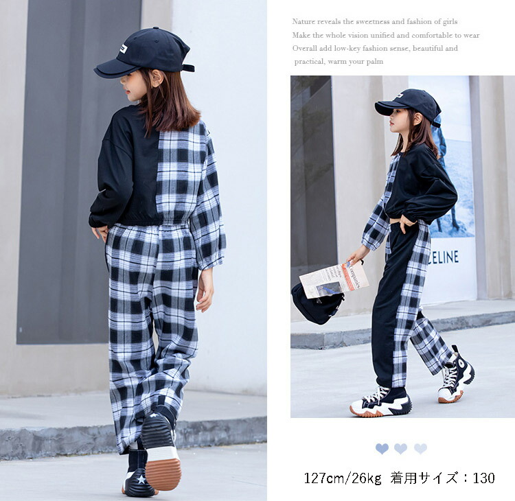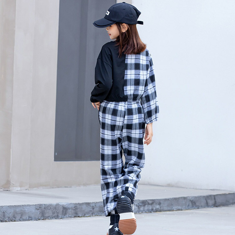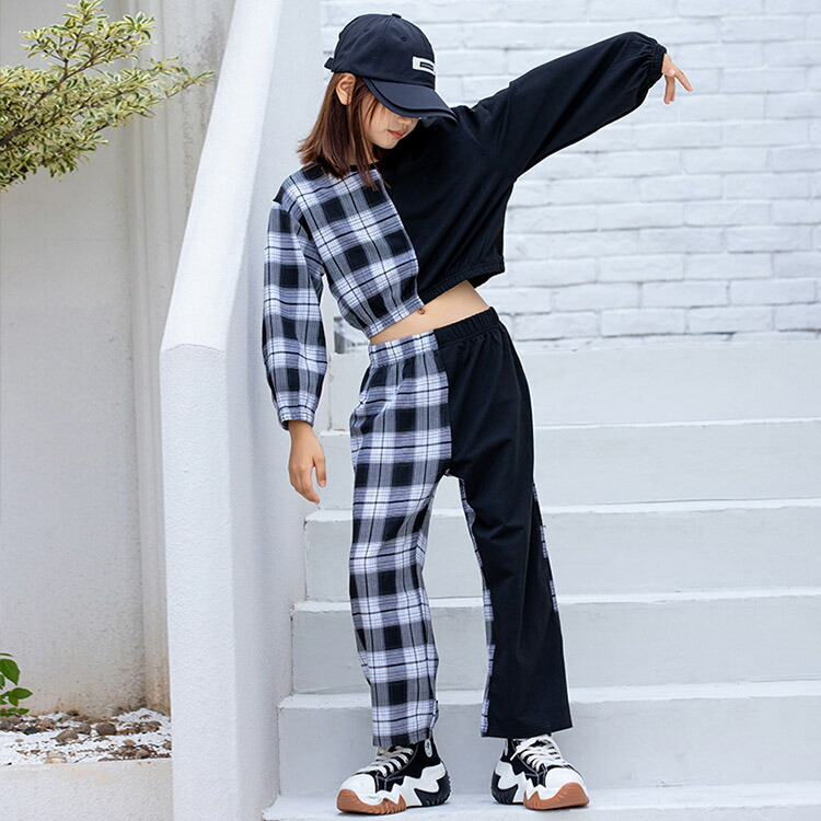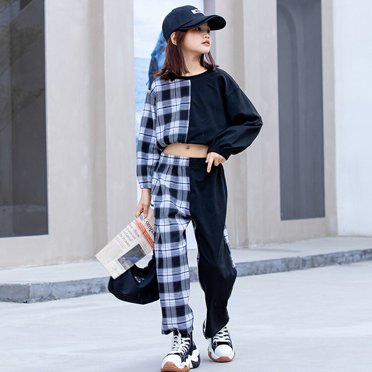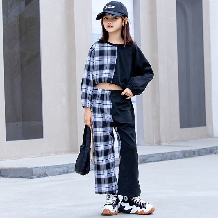 キッズ ダンス 衣装 派手 トップス へそ出し チェック柄 パンツ ストリート B系 セットアップ ヒップホップ 110 120 130 140 150 160