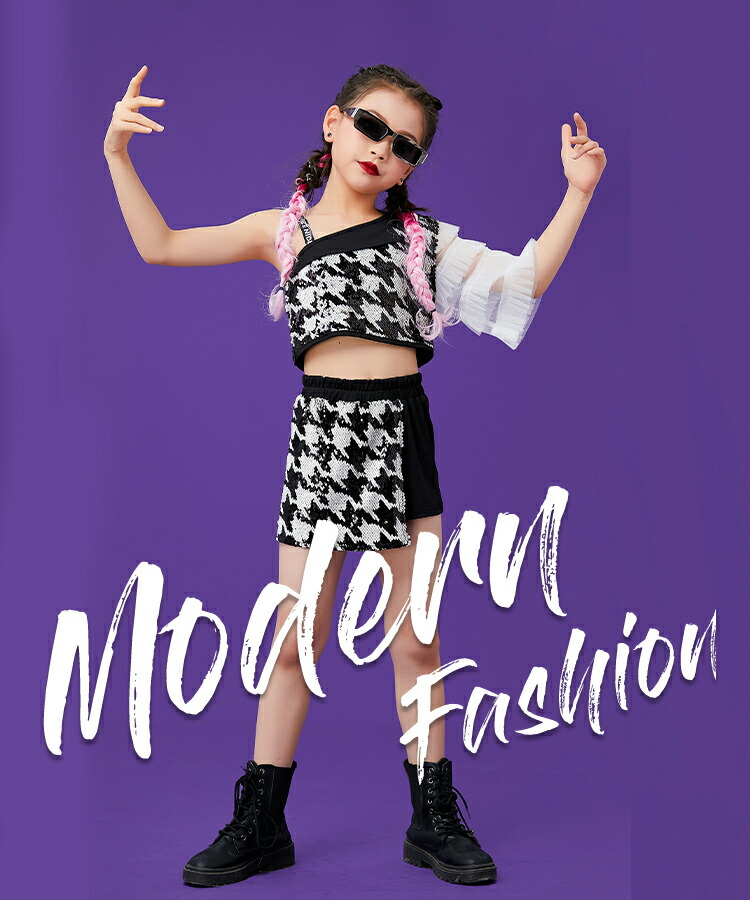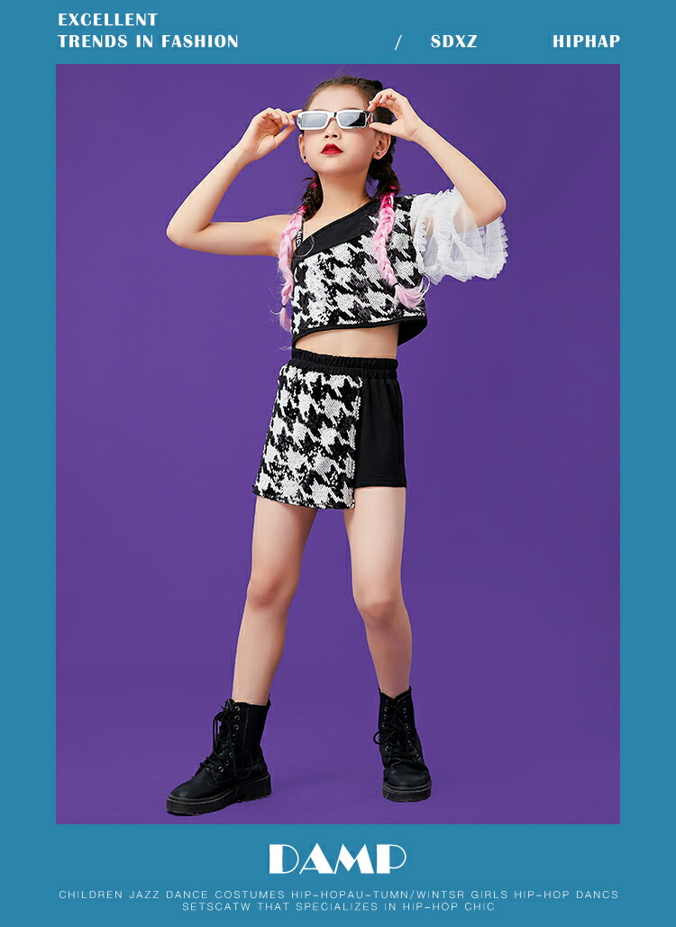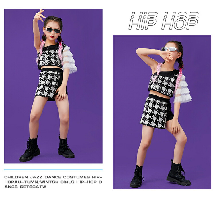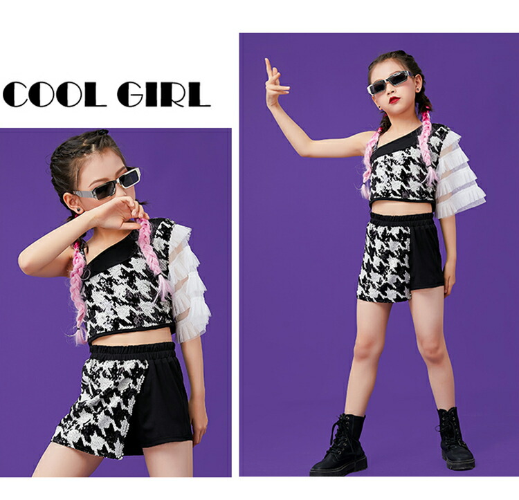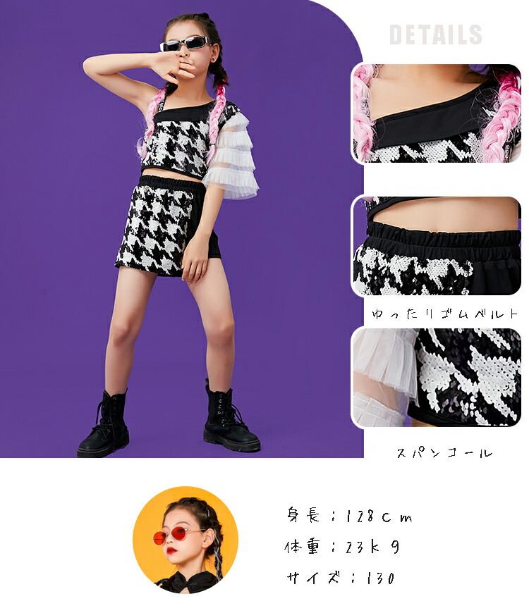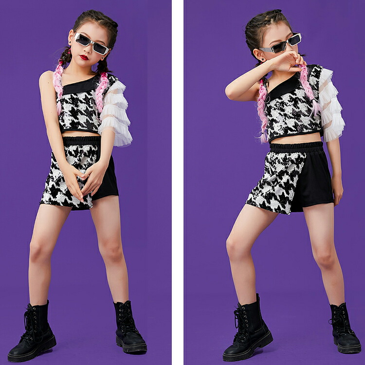 キッズ ダンス 衣装 スパンコール 千鳥柄 セットアップ ヒップホップ ジャッズダンス HIPHOP JAZZ K-pop 120 130 140 150 160 170