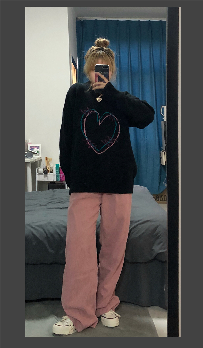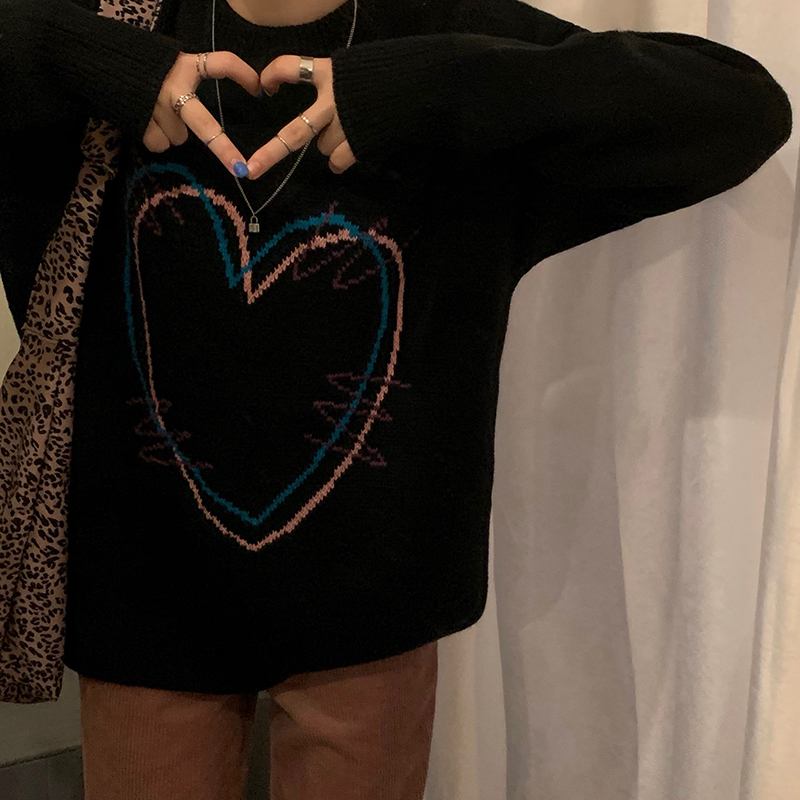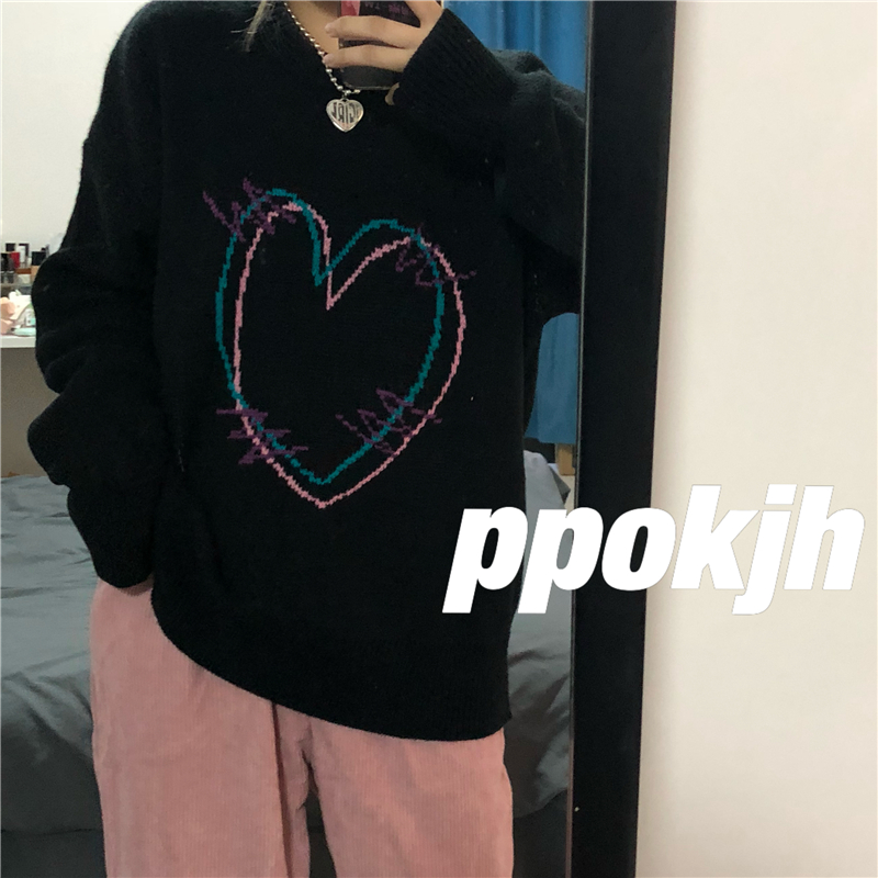 ハート 刺繍 ニット 韓国 ファッション 黒 ブラック カットソー ゆったり レディース ガールズ 大きい 長め 長袖 トップス セーター おしゃれ ダンス 衣装 ヒップホップ HIPHOP ストリート ピンク 病み ゆめ 可愛い 学生 奇抜 個性的 原宿