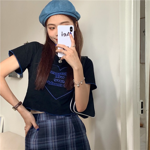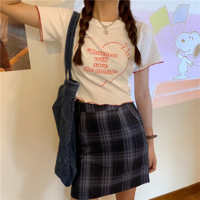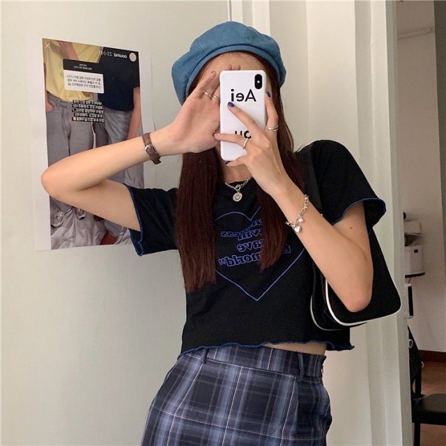 ハート 半袖 Tシャツ トップス 白 ホワイト 黒 ブラック ロゴ レディース ガールズ フリル フレア レース ミニ ヒップホップ HIPHOP ダンス 衣装 通学 かわいい おしゃれ 韓国 韓国ファッション 原宿 ショート丈 短い 短め へそ出し ガーリー