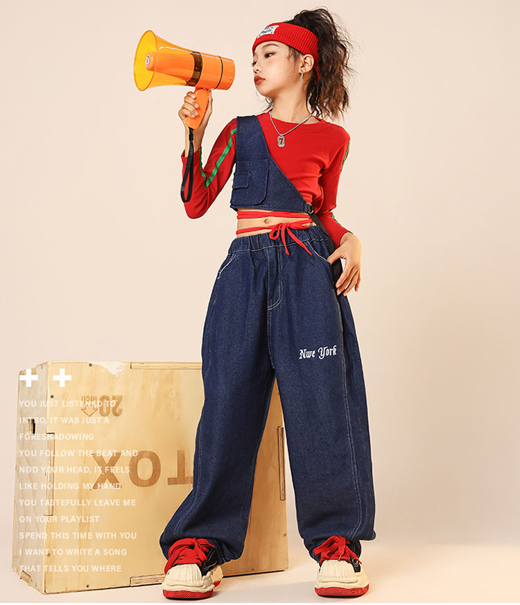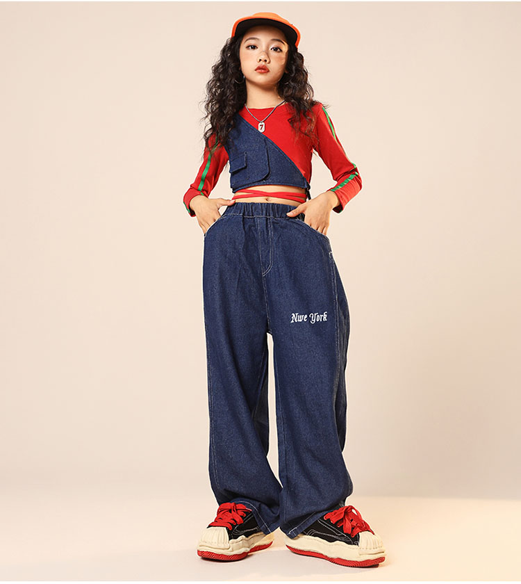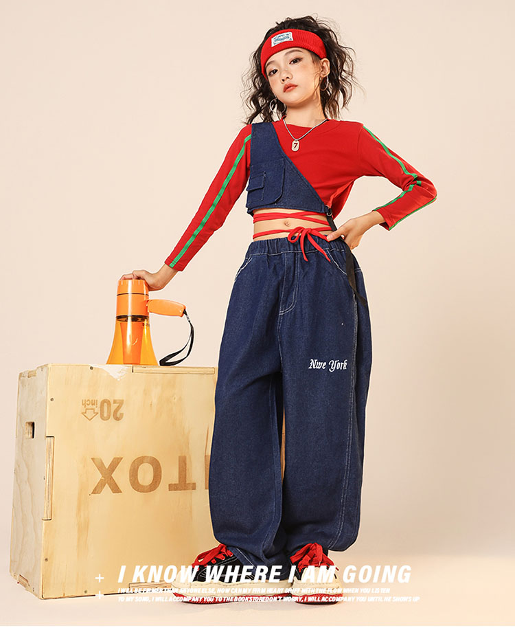 ダンス衣装 キッズ ヒップホップ セットアップ 女の子 デニム ダンスパンツ へそ出しトップス ジャズダンス ガールズ 韓国 ヒップホップ hiphop 演出服 応援団 練習着 110 180