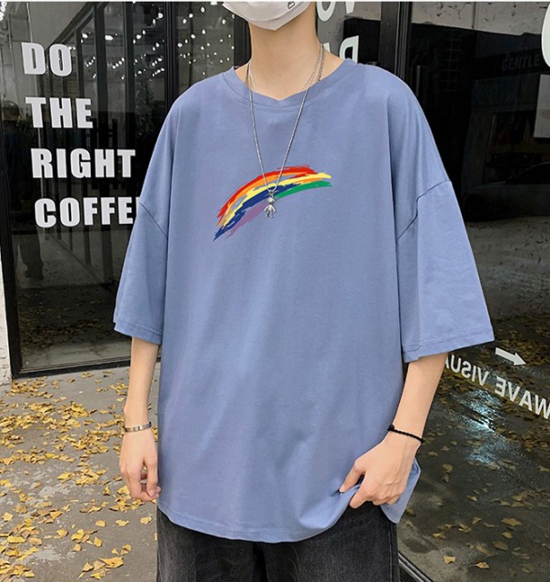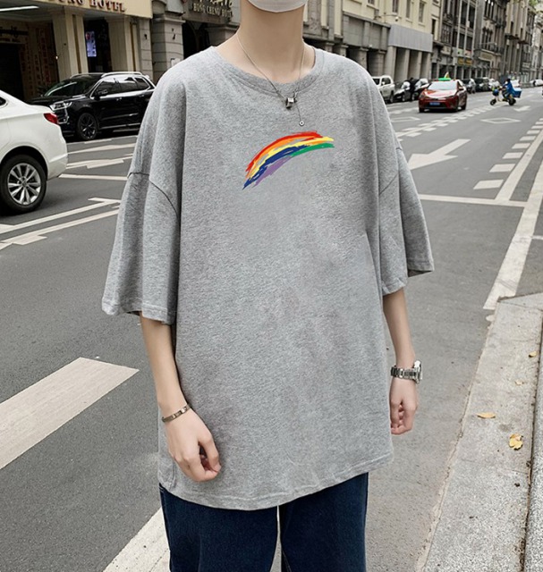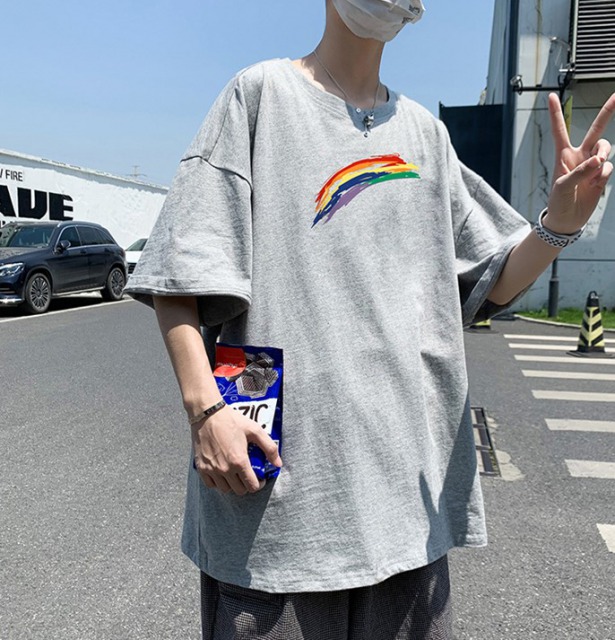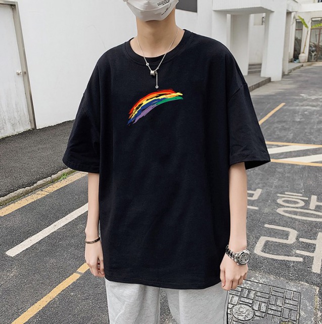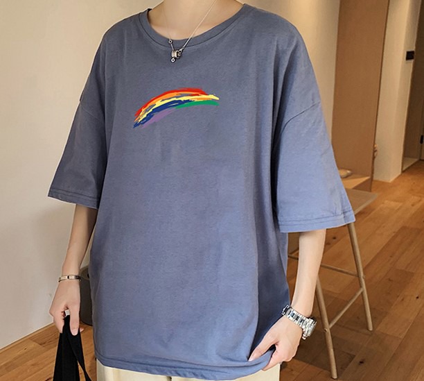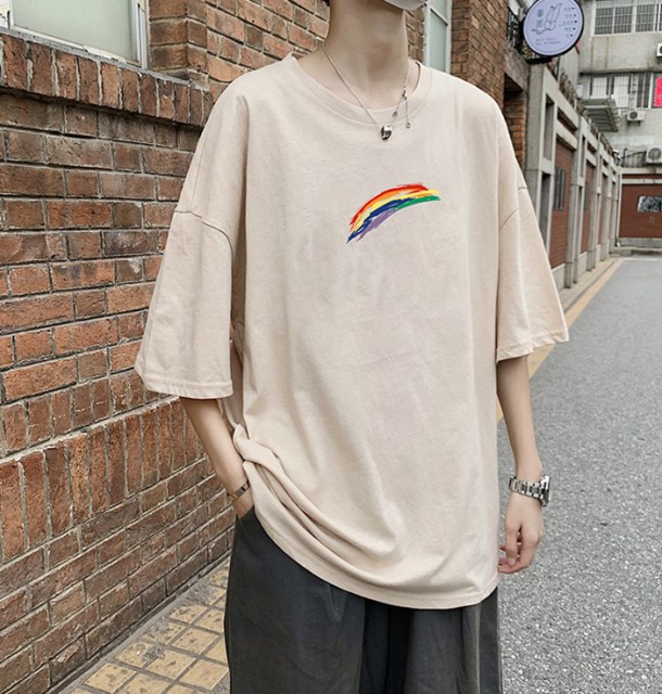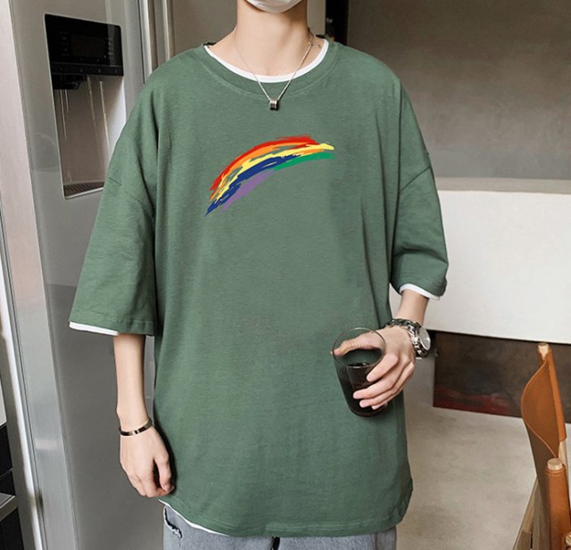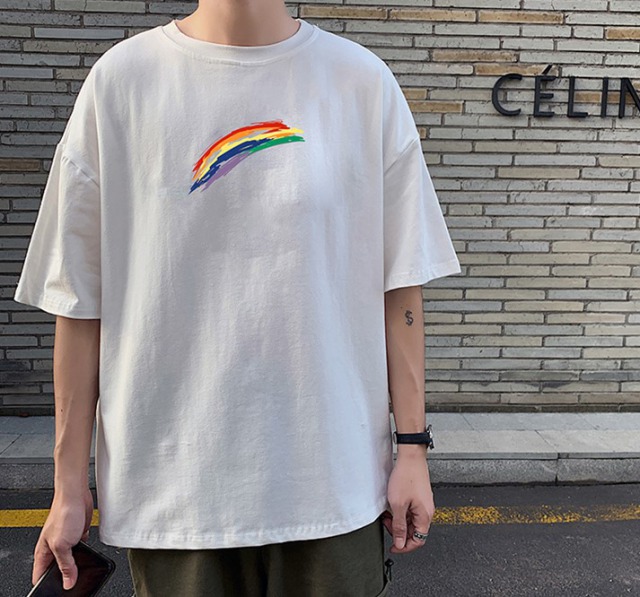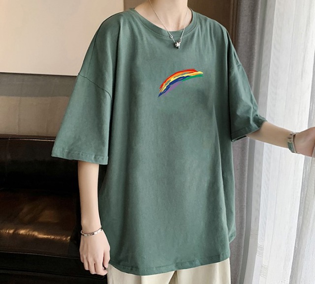 Tシャツ 半袖 6色 トップス カットソー レディース メンズ ガールズ キッズ 大きい 大きめ ビッグ 黒 ブラック 白 ホワイト グリーン グレー ブルー ベージュ ロゴ プリント カラフル ダンス 衣装 ヒップホップ HIPHOP 虹 シンプル ストリート