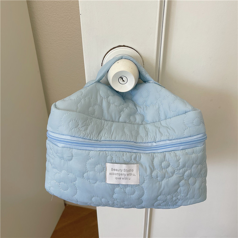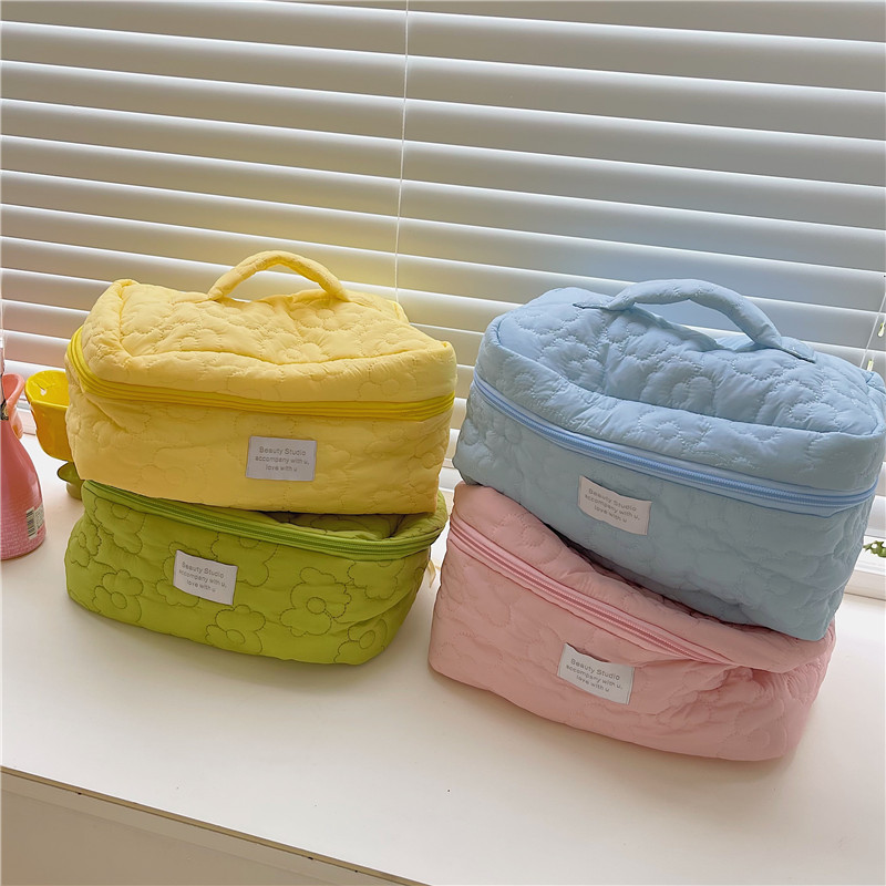 フラワーキルティング化粧ポーチトラベルポーチ大容量洗面用具大きいおしゃれかわいい韓国旅行ケース小物入れ収納化粧品メイクポーチ持ち手四角メイクボックスバニティー機能的大きめピンク花柄リボン柔らかい綿