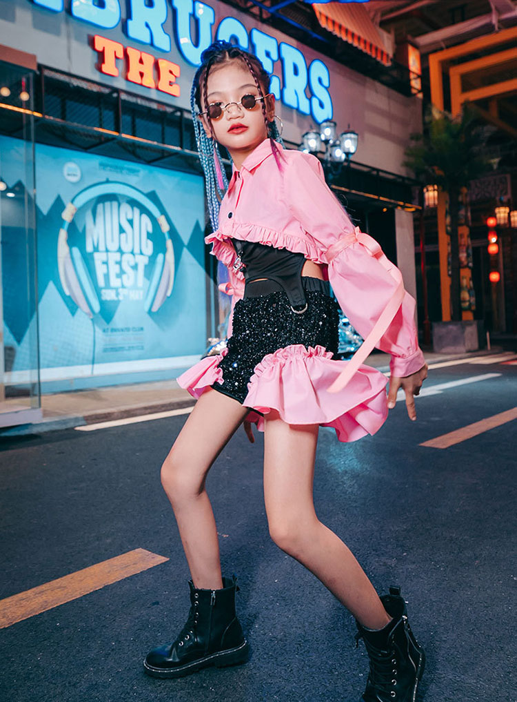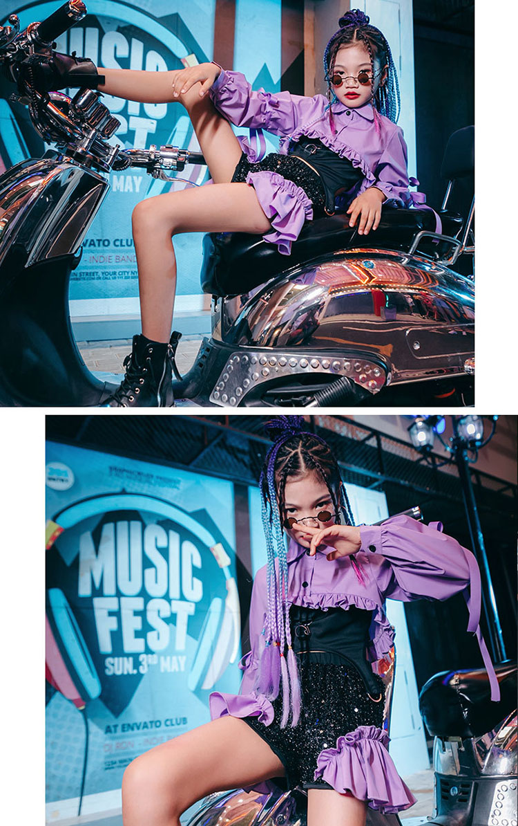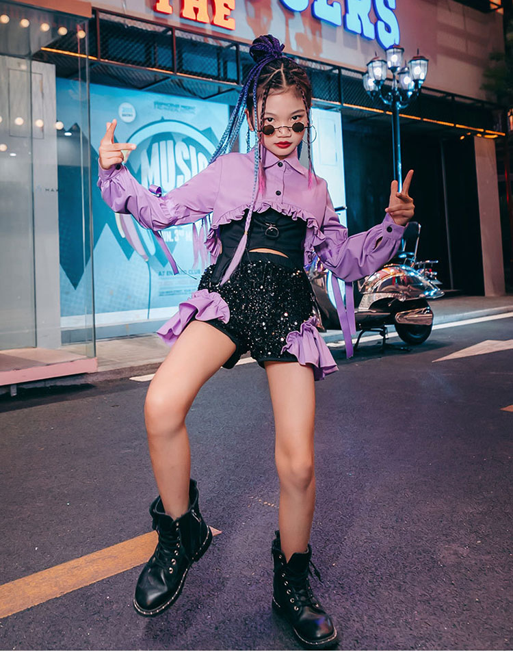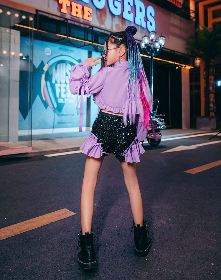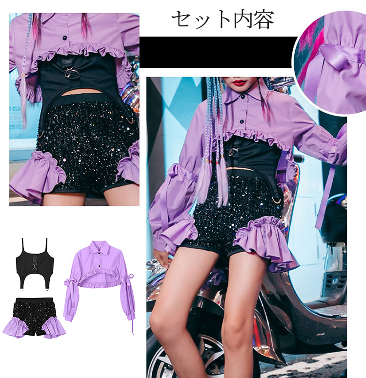 ダンス衣装 セットアップ キッズ へそ出し トップス スパンコール チアダンス ジャズダンス ガールズ 韓国 ヒップホップ セットアップ 演出服 応援団 練習着 パープル ピンク 120-170cm