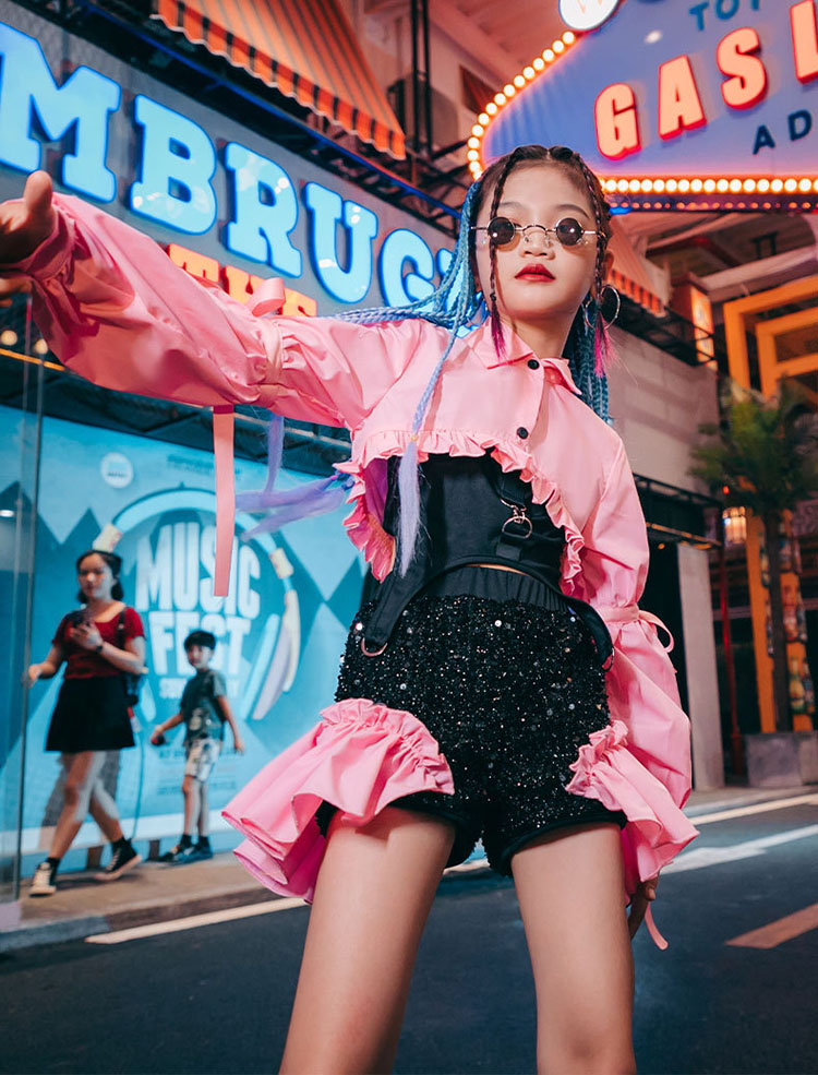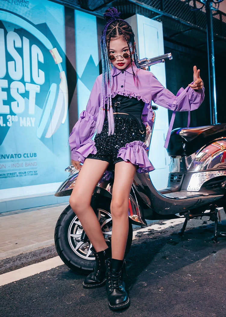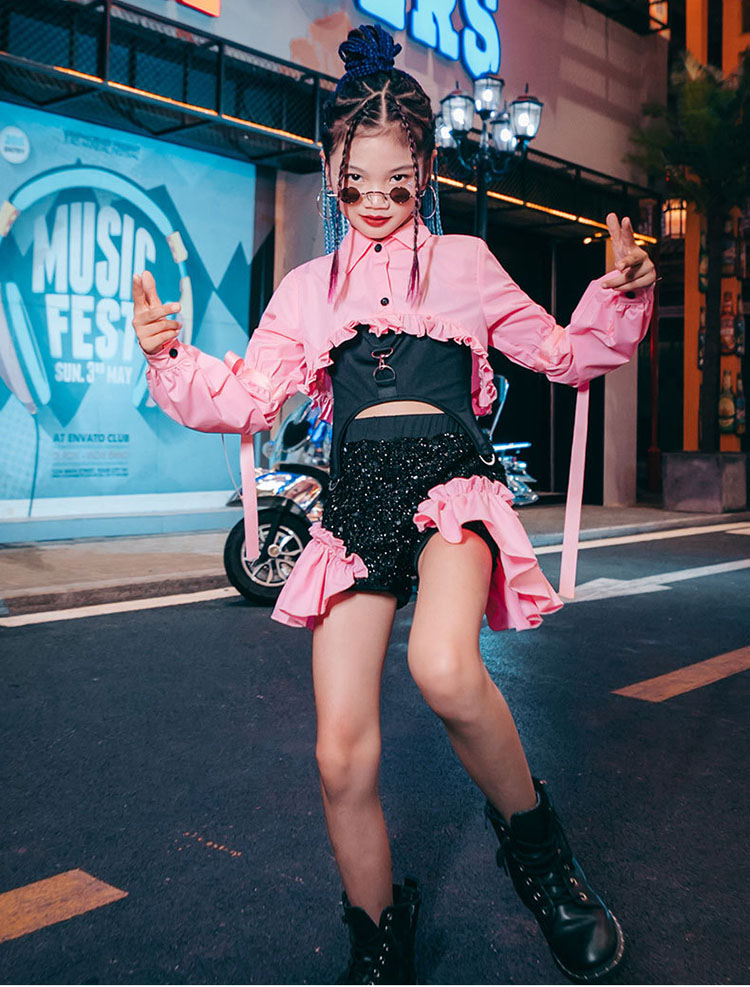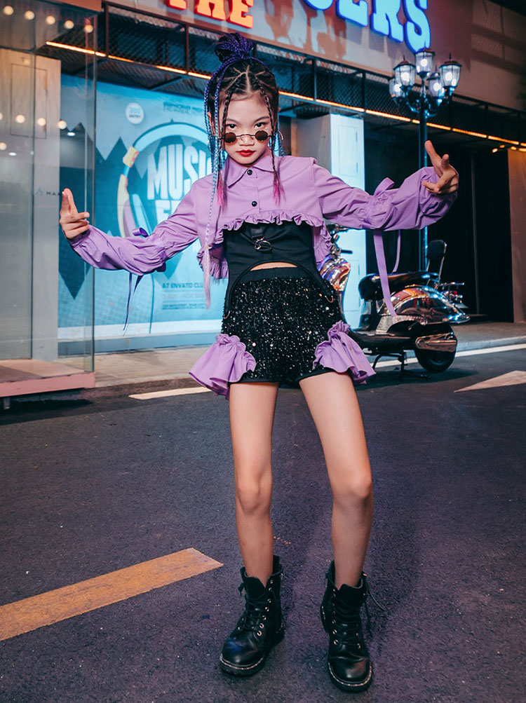 ダンス衣装 セットアップ キッズ へそ出し トップス スパンコール チアダンス ジャズダンス ガールズ 韓国 ヒップホップ セットアップ 演出服 応援団 練習着 パープル ピンク 120-170cm